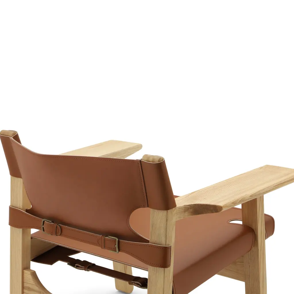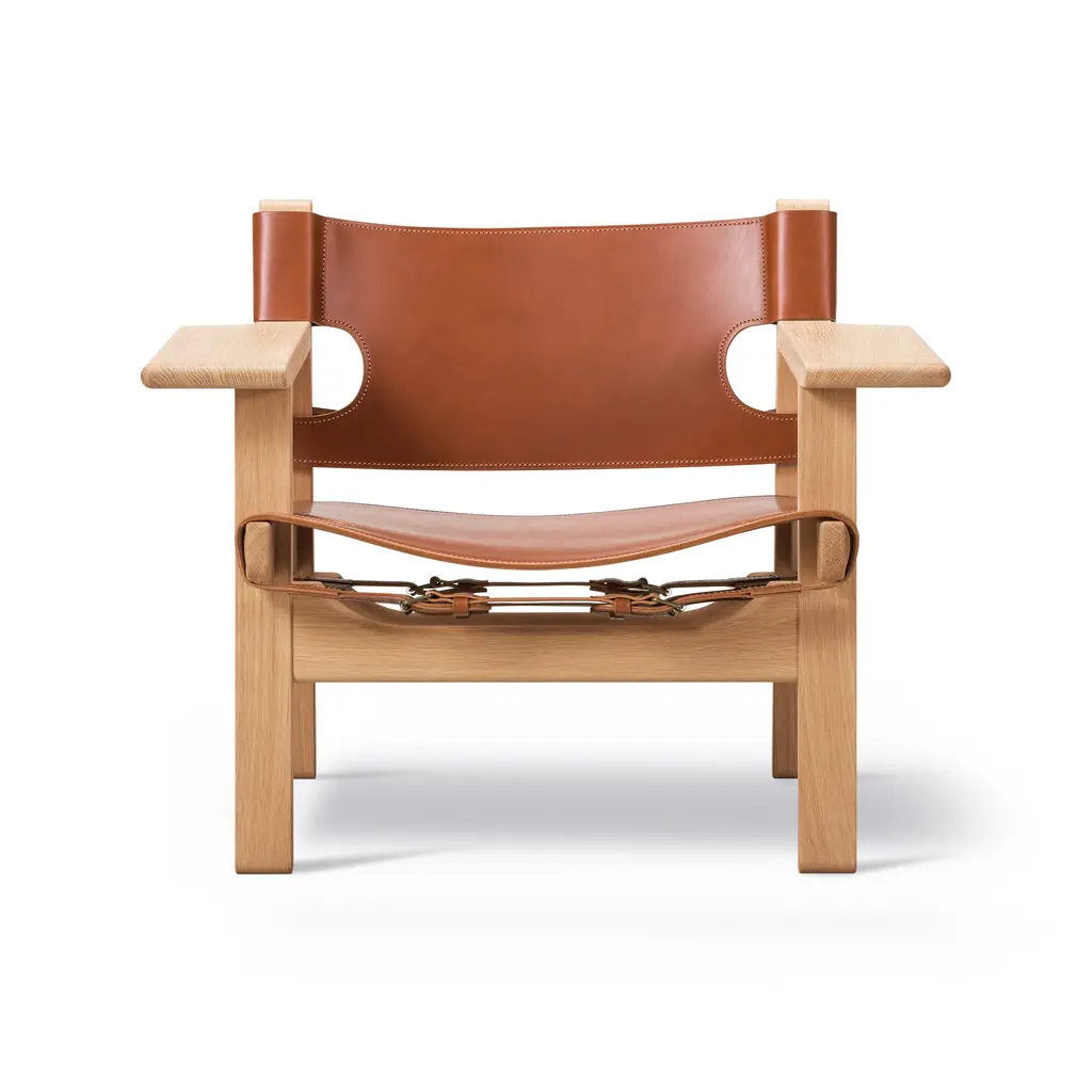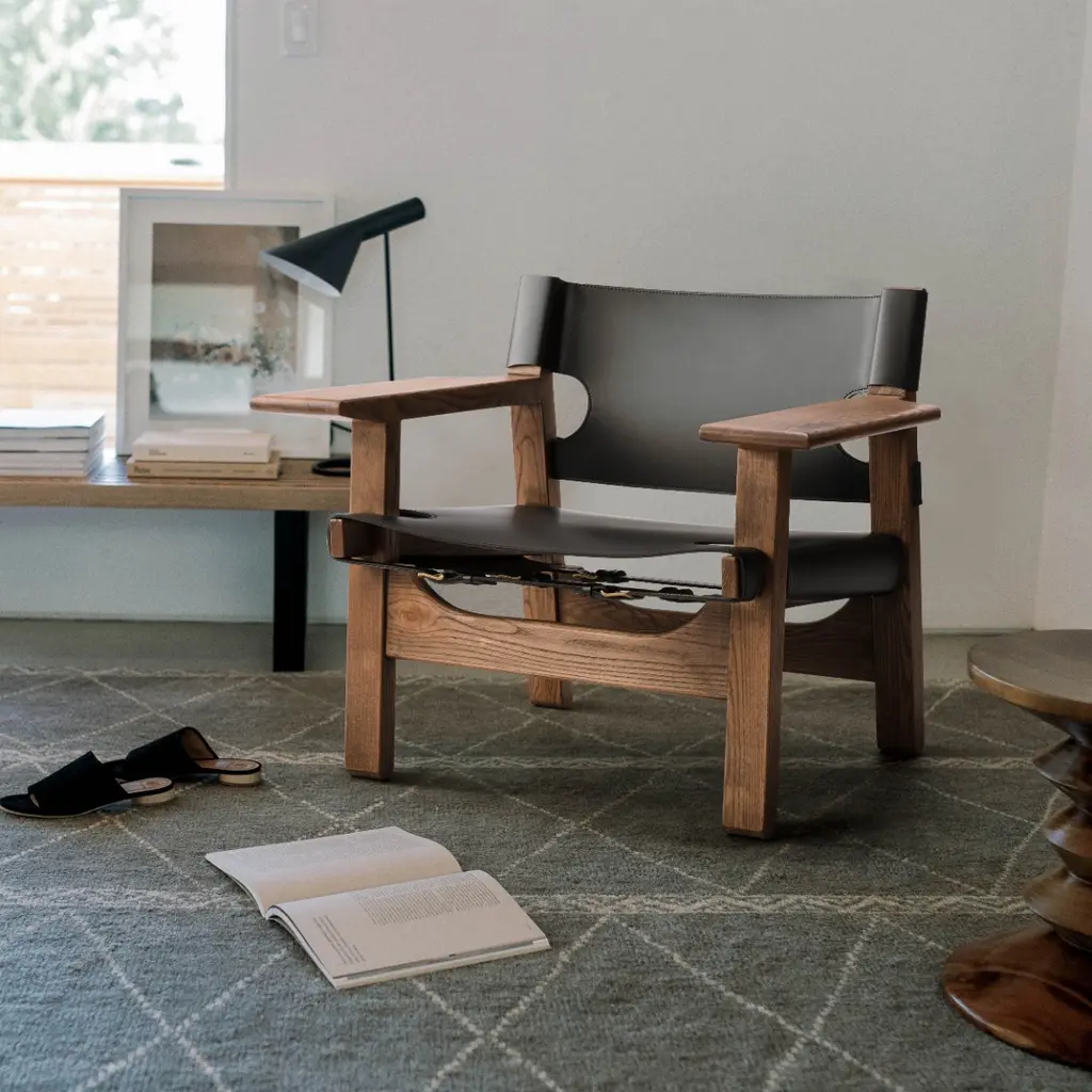 The Spanish Chair was designed after Borge Mogensen's trip to Spain, where he drew inspiration from their traditional furniture design and modernized the shape to create a timeless design in which form follows function. Mogensen's design marries the charm of vintage leather with a bold geometric frame, and the distinctively broad armrests allow users to rest their cups and glasses negating the need for side tables. In doing so, he achieved a more open and informal space for relaxing and conversing.