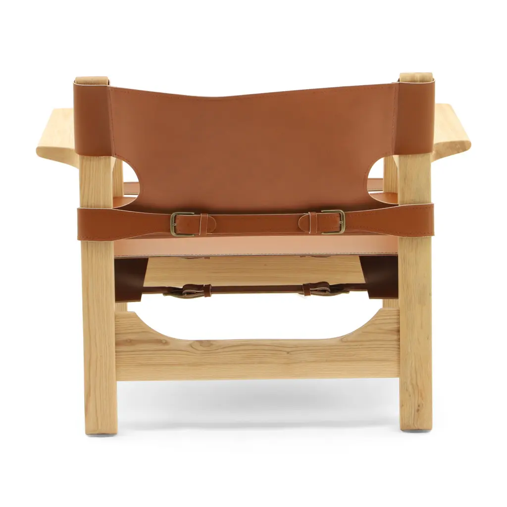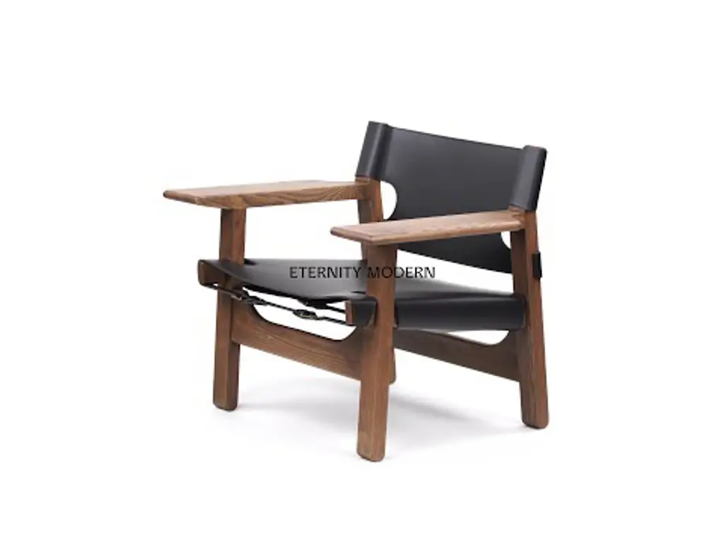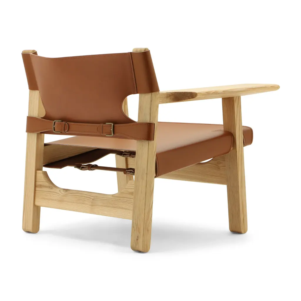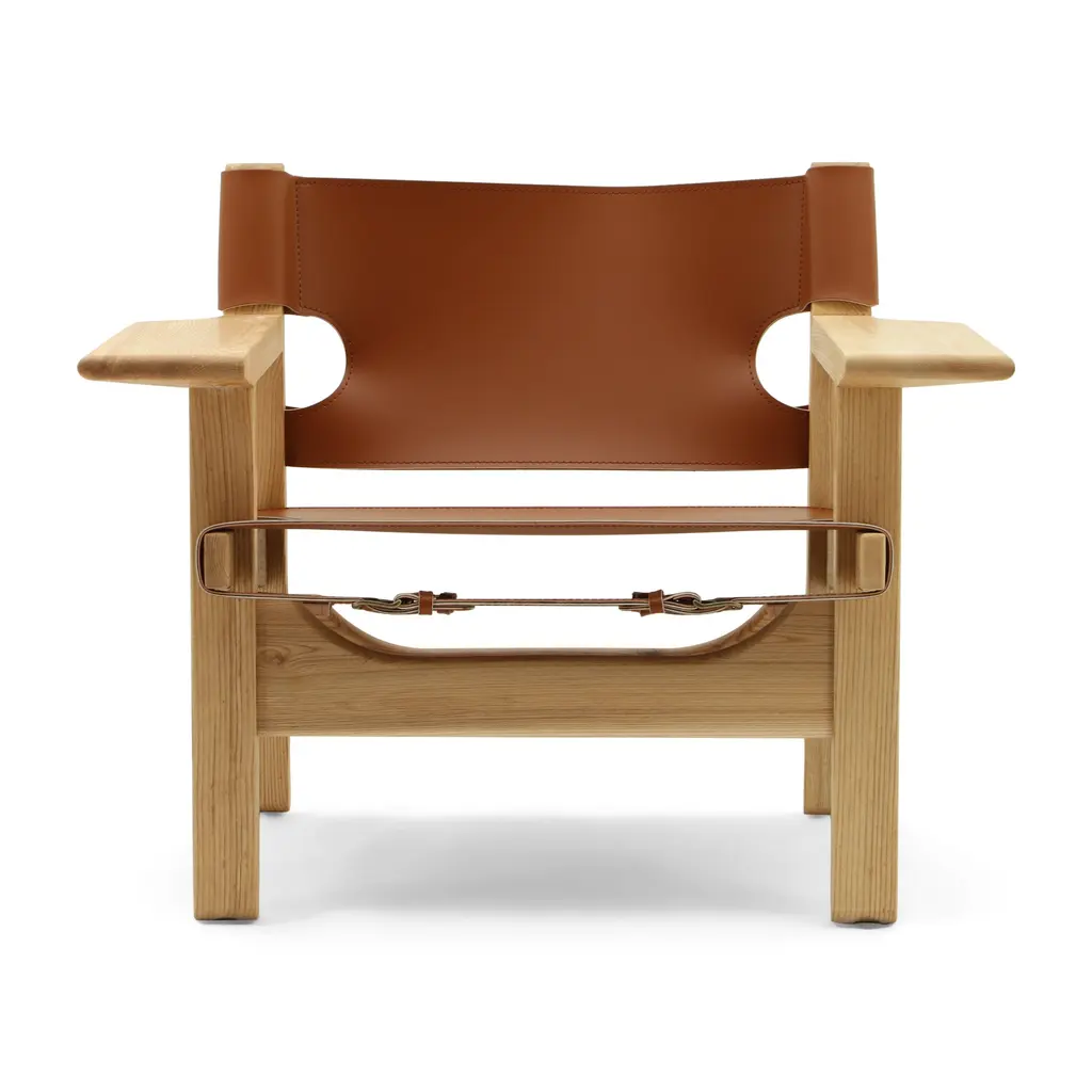 The Spanish Chair was designed after Borge Mogensen's trip to Spain, where he drew inspiration from their traditional furniture design and modernized the shape to create a timeless design in which form follows function. Mogensen's design marries the charm of vintage leather with a bold geometric frame, and the distinctively broad armrests allow users to rest their cups and glasses negating the need for side tables. In doing so, he achieved a more open and informal space for relaxing and conversing.