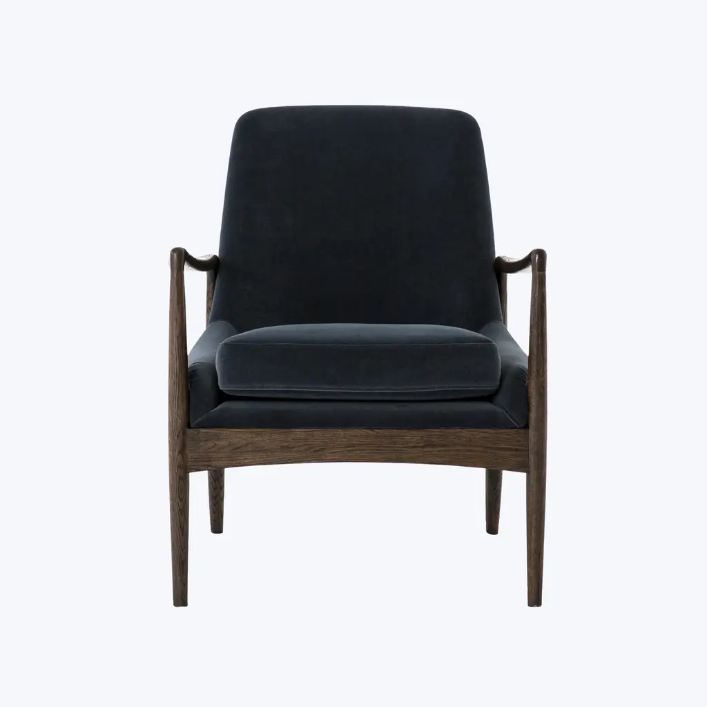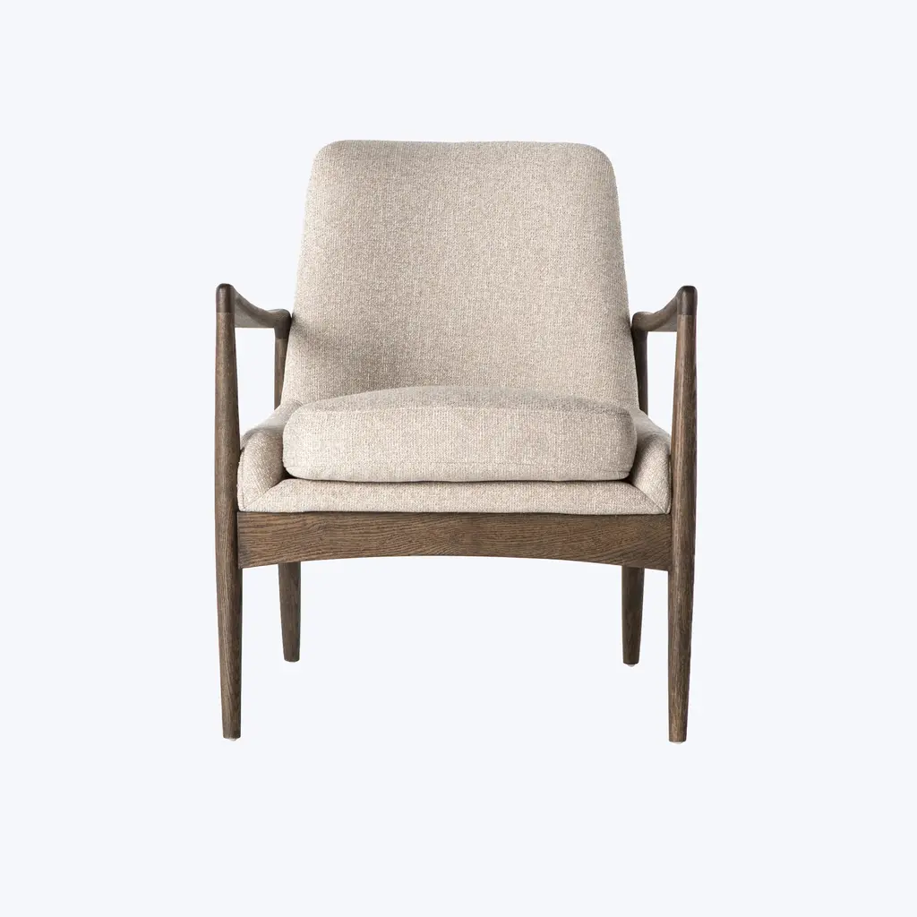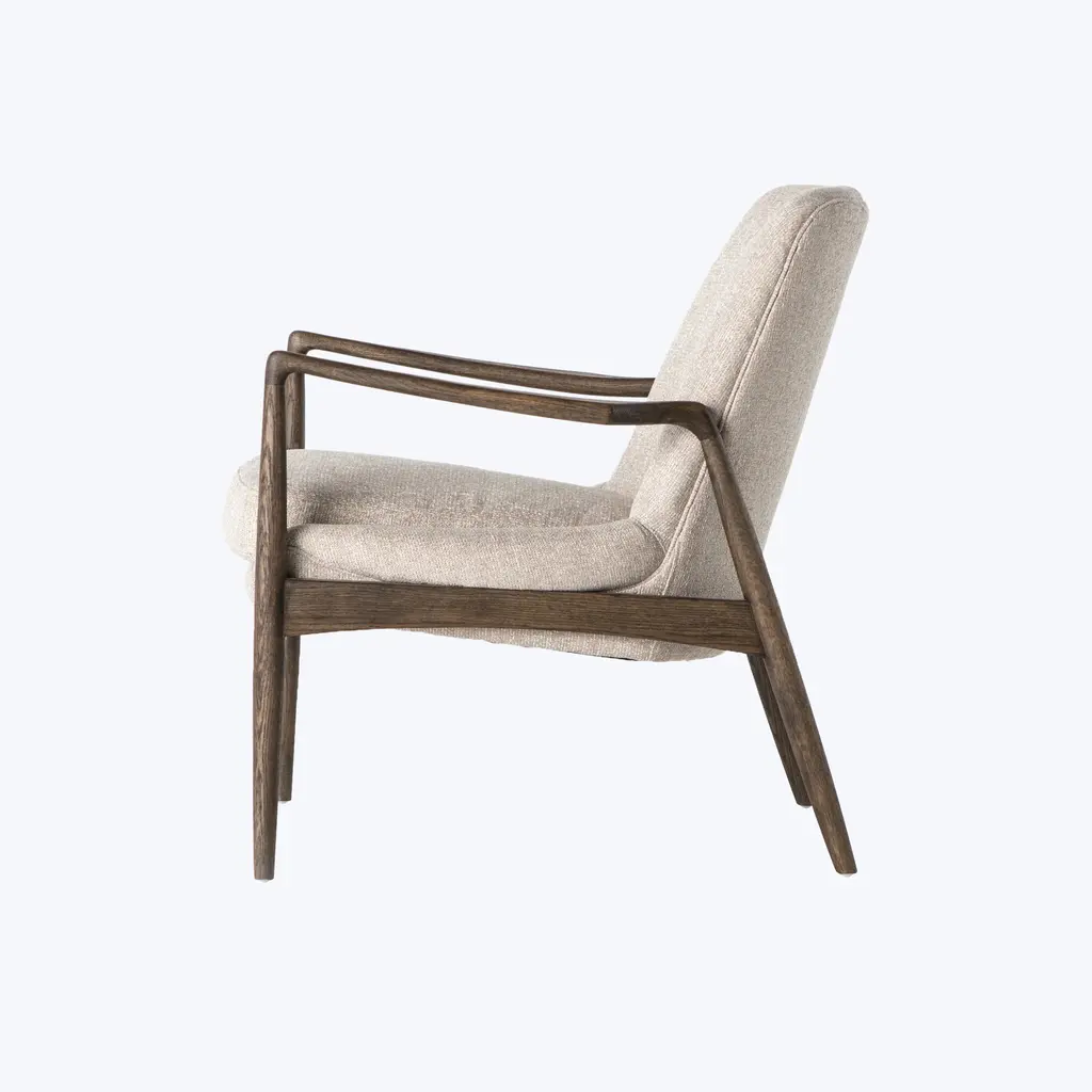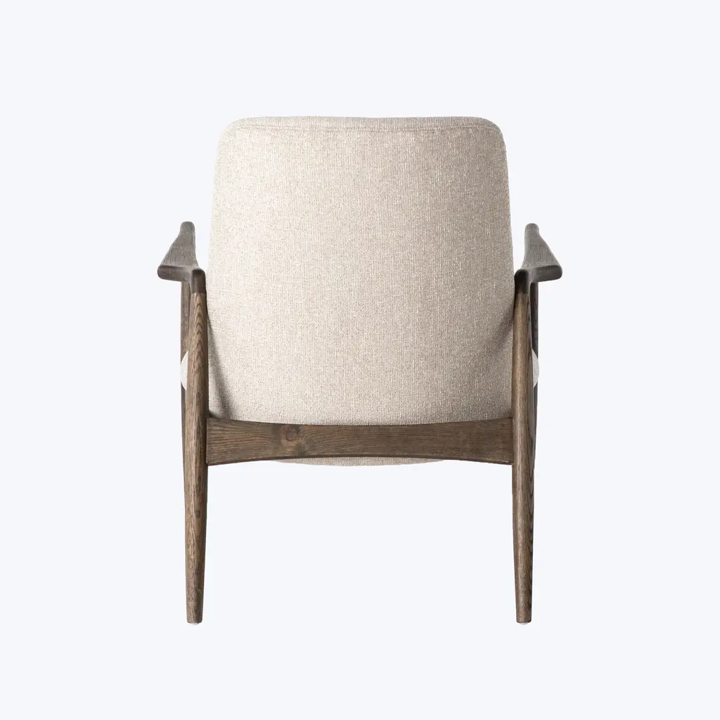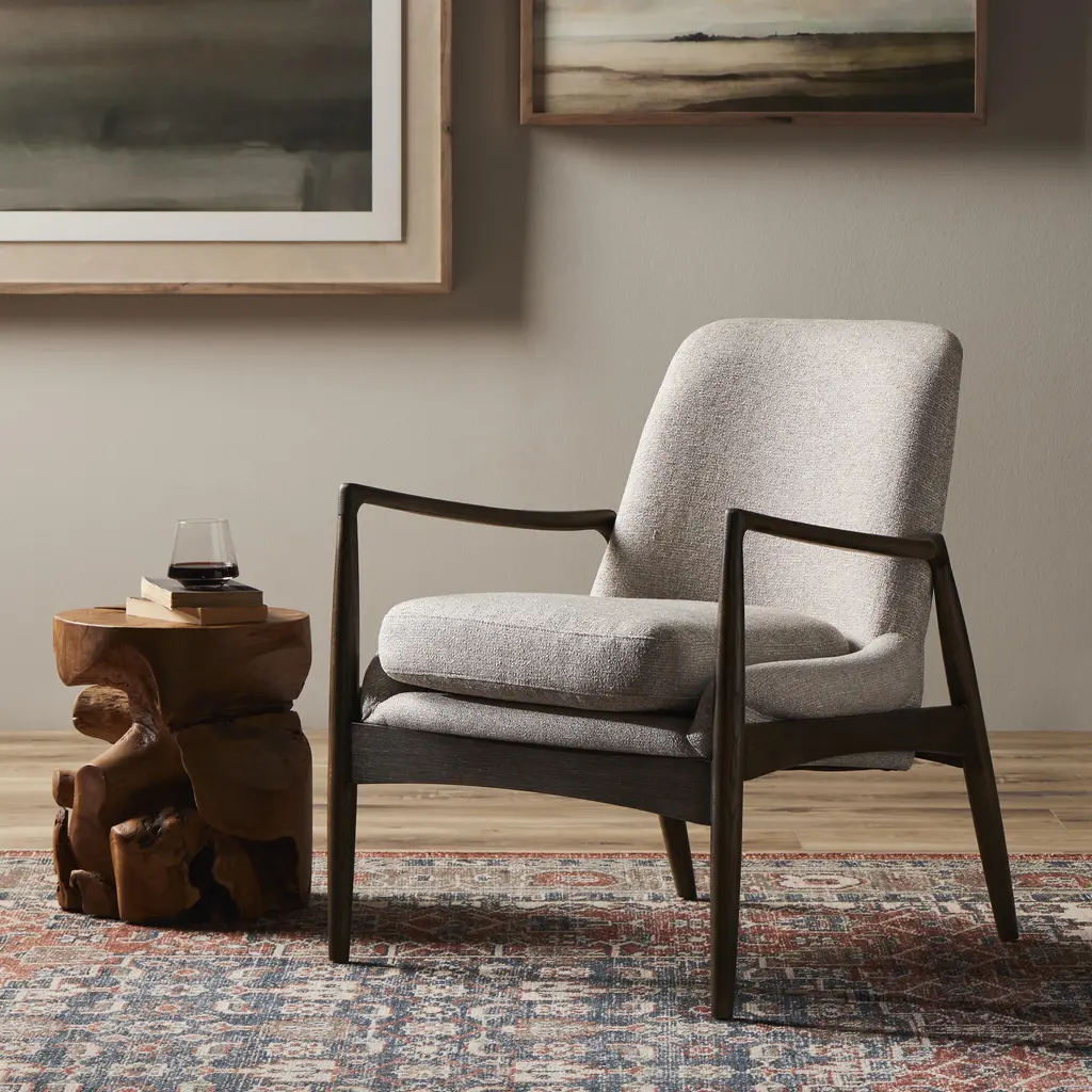 The Four Hands Braden Chair combines mid-century modern sophistication with deep comfort, featuring dramatic arms and a spacious 22.5" seat depth for ultimate relaxation. Offered in three fabrics, this chair is crafted from 100% high-quality polyester for durability and a soft touch. The 18" seat height and 24.5" arm height make it an inviting choice for lounging.ÊSet within a sculpted nettle wood frame, the Braden Chair exudes an architectural appeal, blending organic warmth with refined structure. This accent chair brings a cozy yet luxurious aesthetic to any space with its balanced combination of bold lines and plush upholstery.