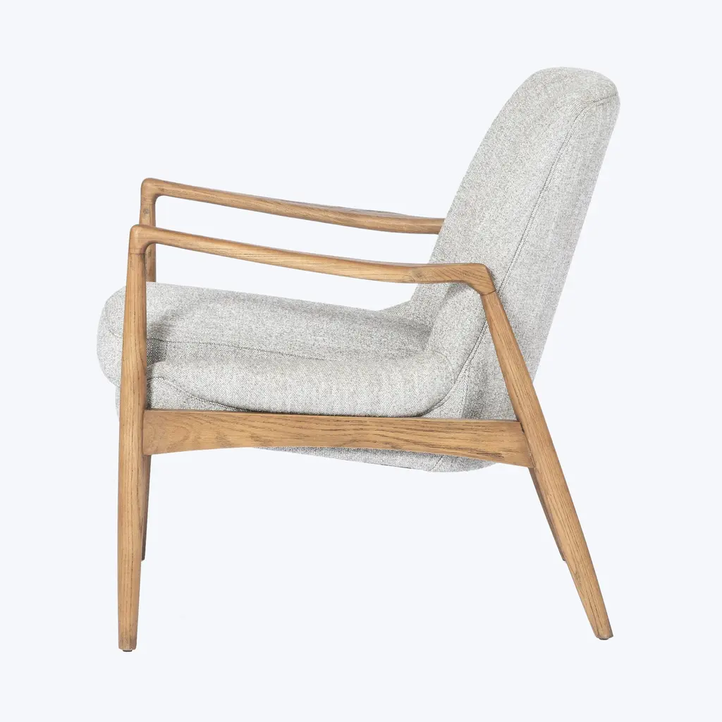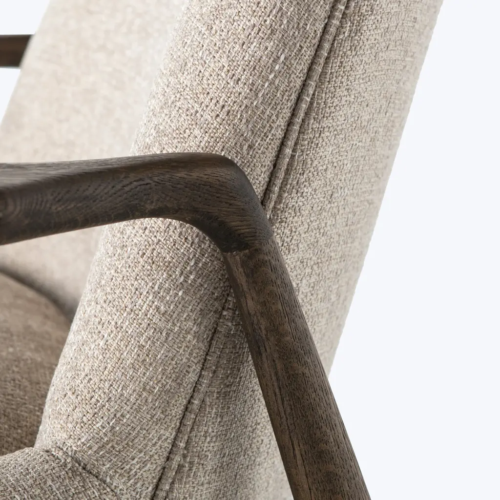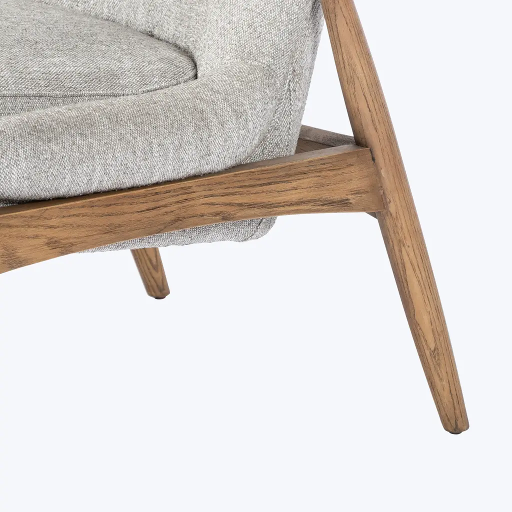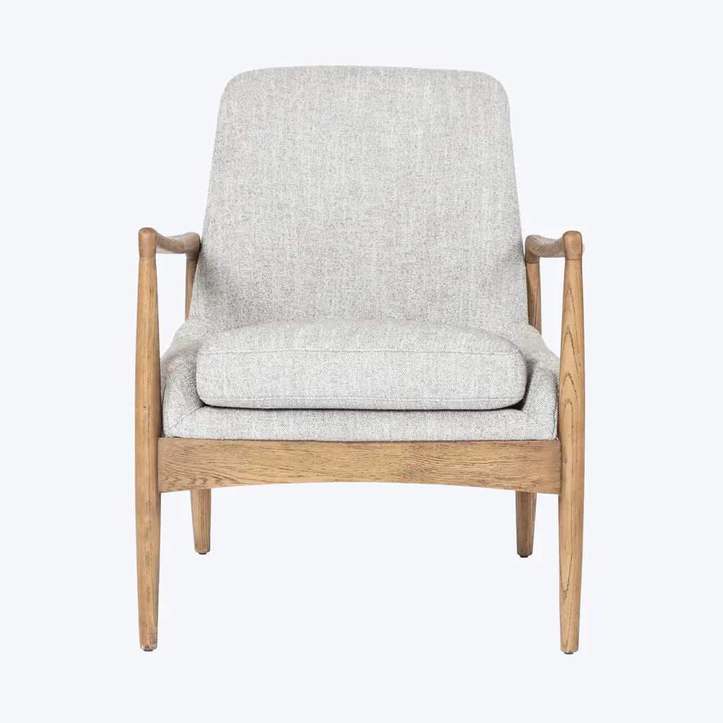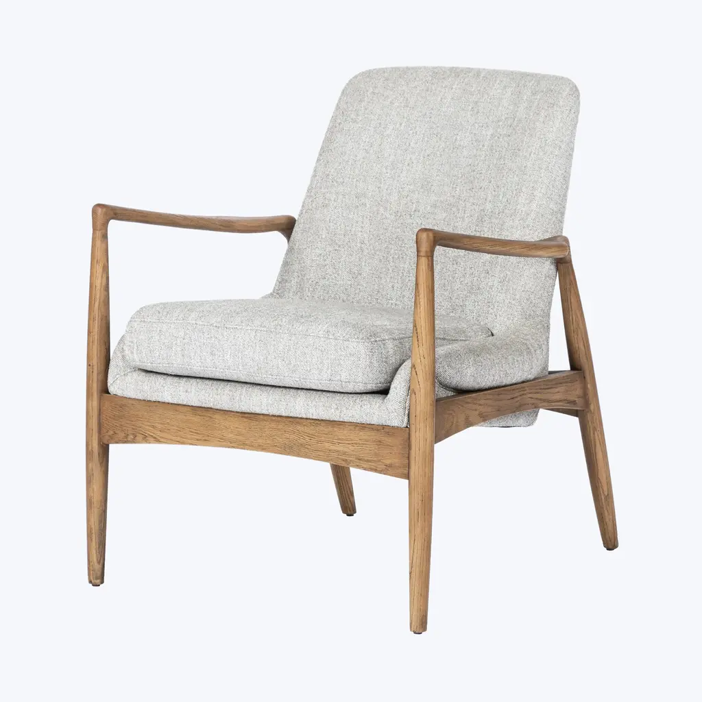 The Four Hands Braden Chair combines mid-century modern sophistication with deep comfort, featuring dramatic arms and a spacious 22.5" seat depth for ultimate relaxation. Offered in three fabrics, this chair is crafted from 100% high-quality polyester for durability and a soft touch. The 18" seat height and 24.5" arm height make it an inviting choice for lounging.ÊSet within a sculpted nettle wood frame, the Braden Chair exudes an architectural appeal, blending organic warmth with refined structure. This accent chair brings a cozy yet luxurious aesthetic to any space with its balanced combination of bold lines and plush upholstery.