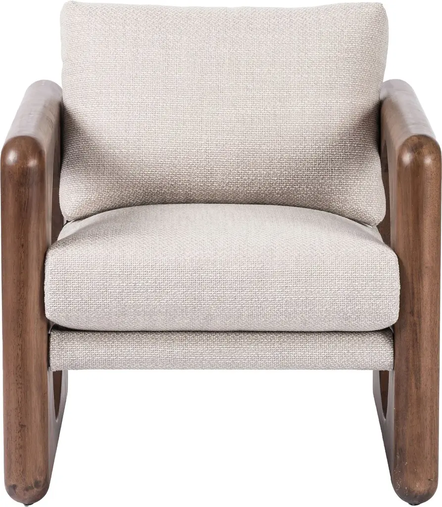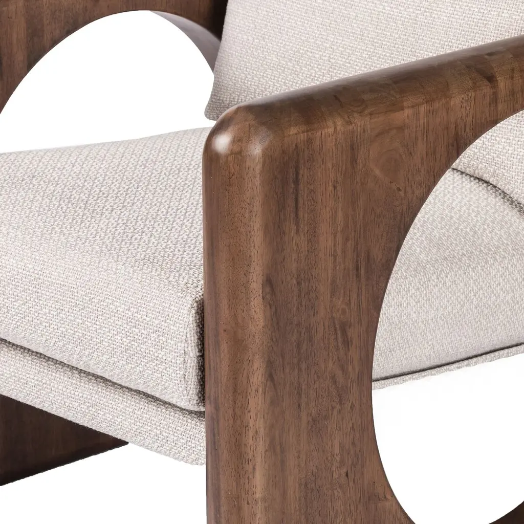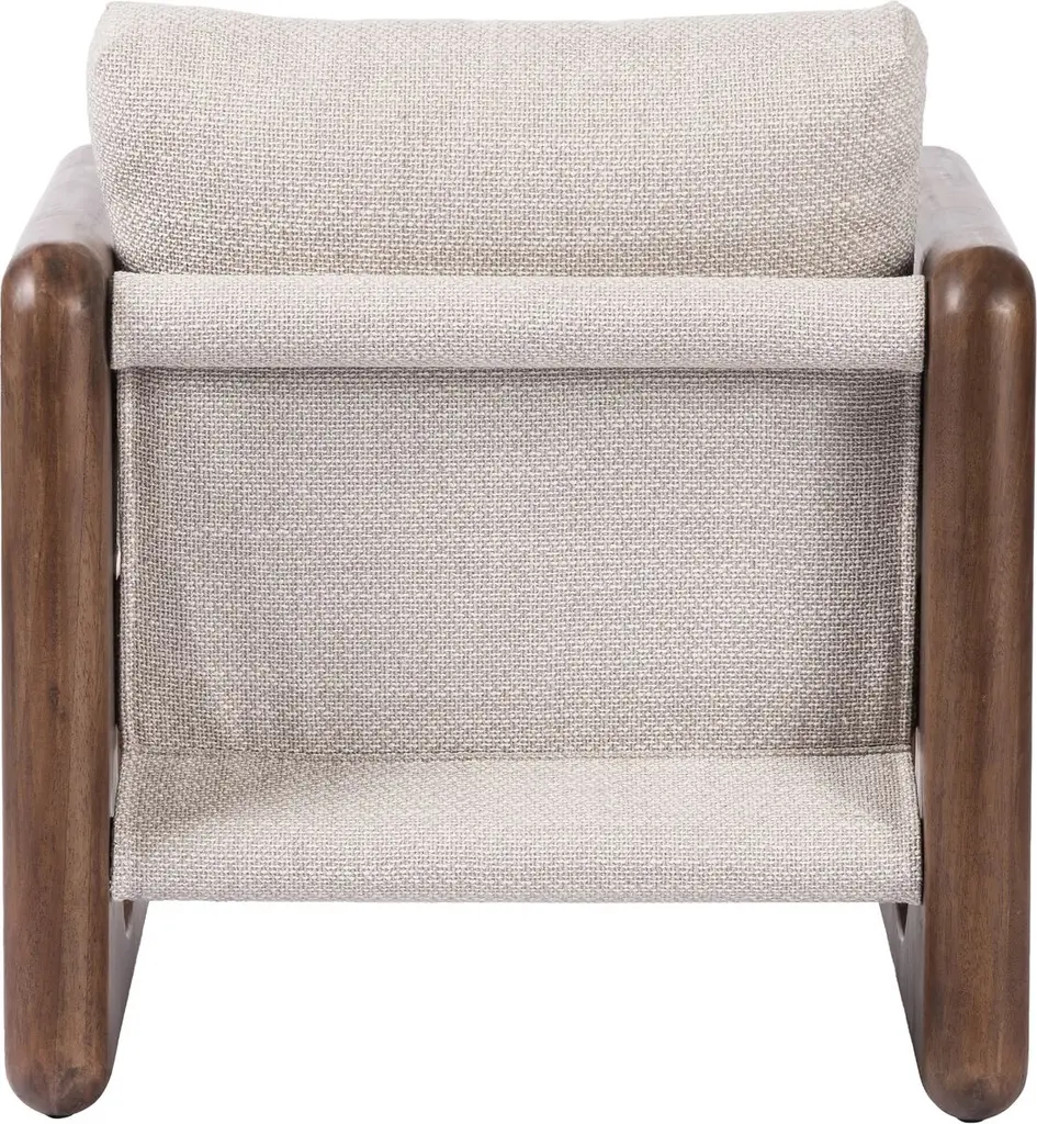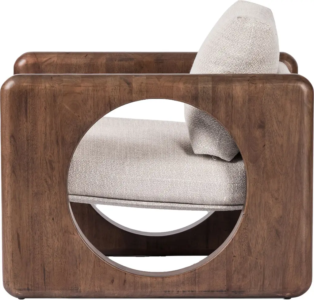 Certain to command attention, this chair boasts square parawood sides, each with rounded corners and a circular cutout. Generously filled cushions complement the sling seat construction, and the stain-resistant performance fabric makes the chair well suited for households with kids or pets.