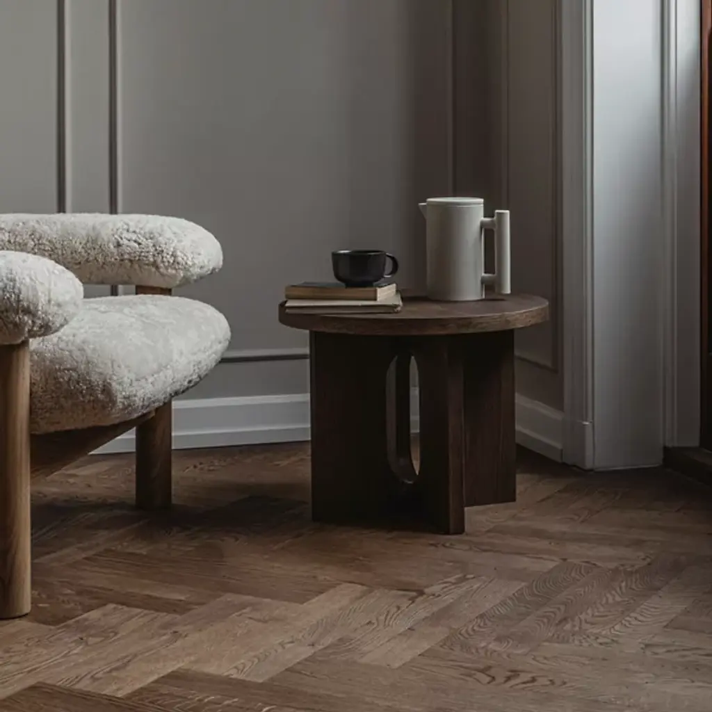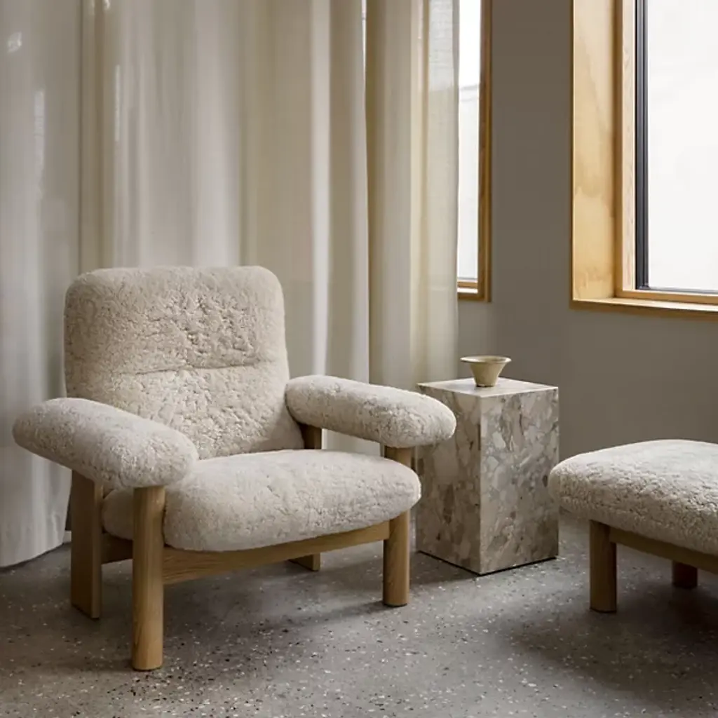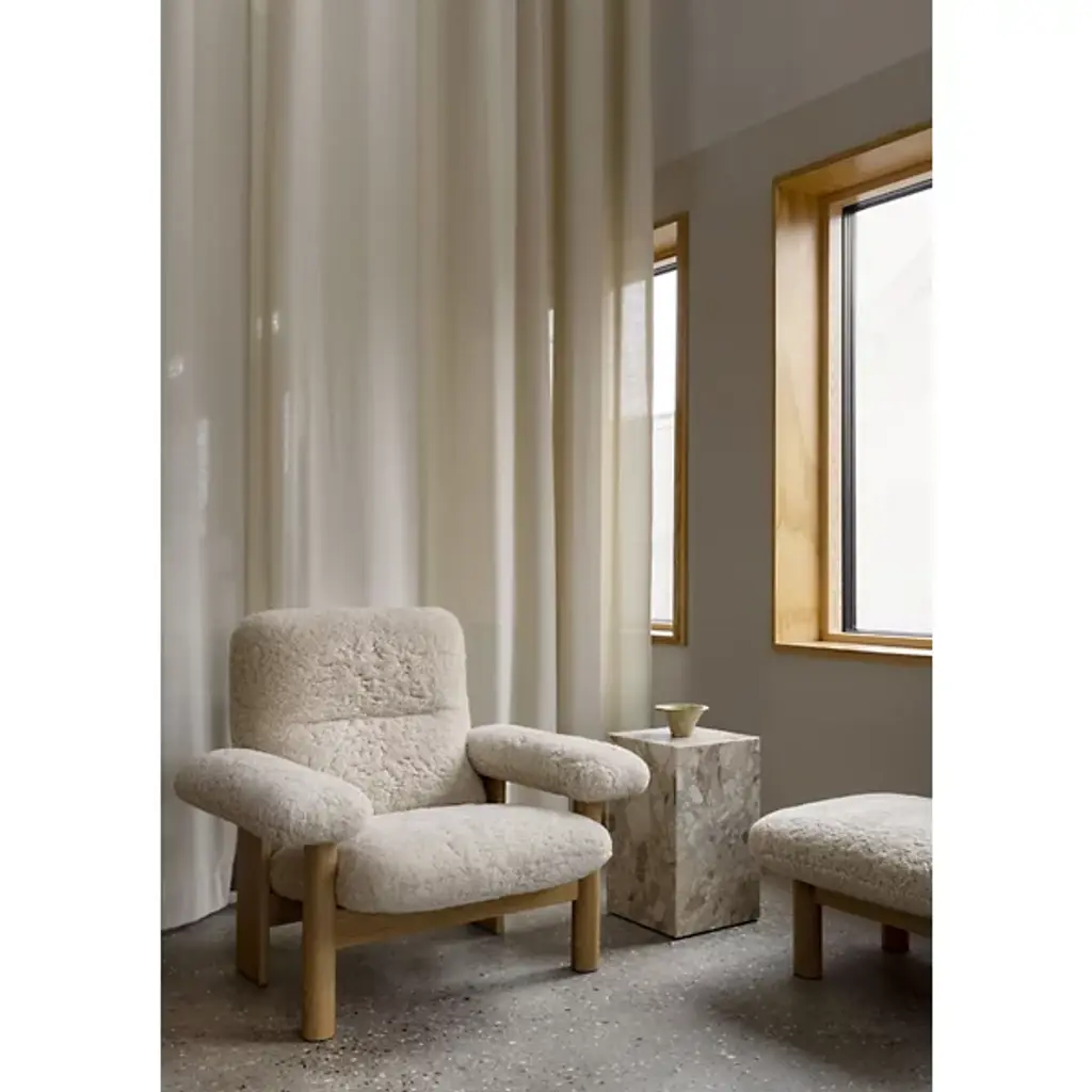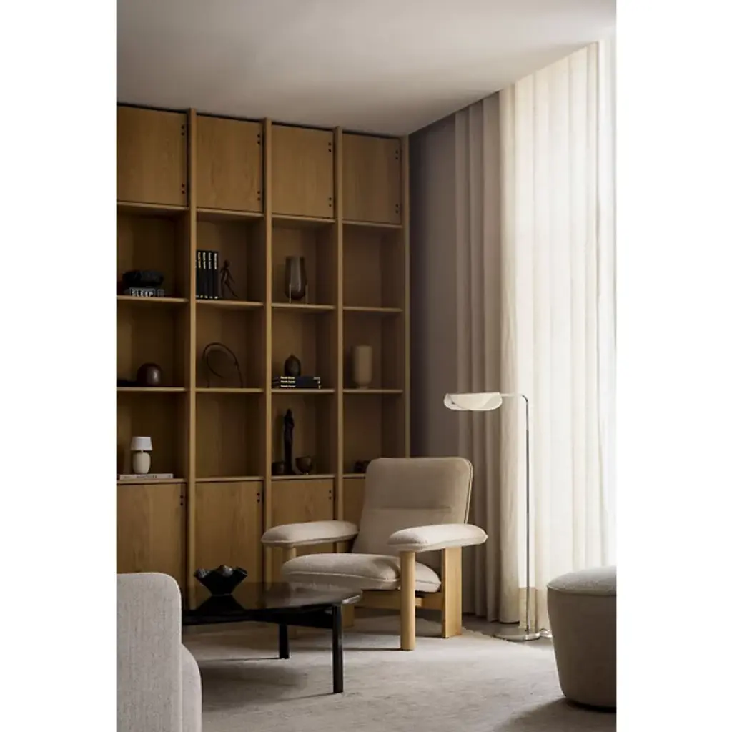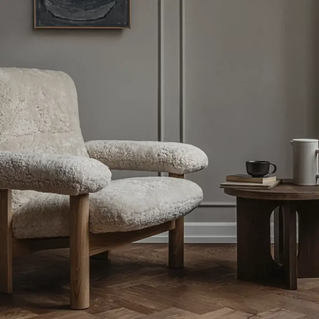 The Brasilia Lounge Chair from Audo Copenhagen is low, restful, and dynamic, invoking relaxation with its soft and sweeping forms. Designed by Anderssen & Voll to expand upon tradition while breaking restrictive rules, the studio draws inspiration from the clean silhouettes of Scandinavian mid-century design and the impressive, engaging shapes of Brazilian modernism. The flat planes and sleek surfaces of the chair’s wood base make a striking impression, its rich, warm hues and direct lines contrasting well with the soft surface of the seat and back above. The upholstered back, seat, and armrests all overlap the flat-surfaced woodwork, providing soothing support and plush comfort.