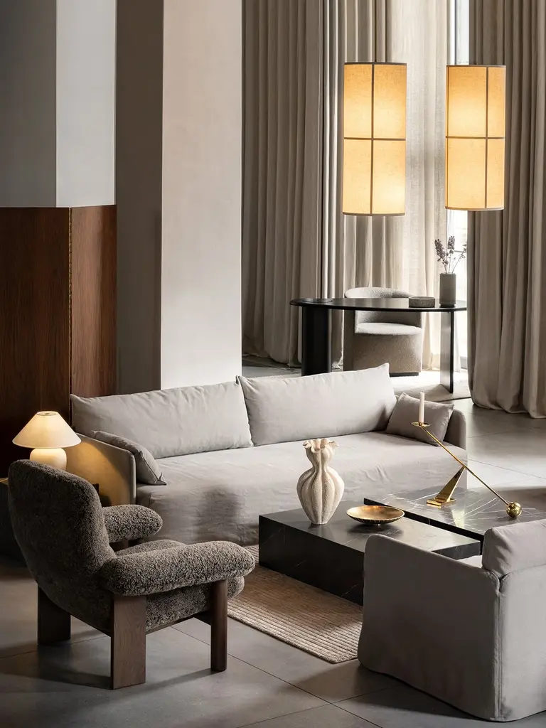 Scandinavian mid-century design aesthetics and Brazilian Modernism meet on the low-lying Brasilia Lounge Chair, designed for Audo by Anderssen & Voll. The luxurious armchair-lounge chair hybrid offers unparalleled sitting comfort thanks to its robust frame and soft upholstery. Characterized by its stout and sturdy legs, made using traditional joinery techniques, and exaggerated armrests and cushioning seat and backrest, upholstered in a range of soft fabrics, it creates a sense of comfort and ease in any setting.