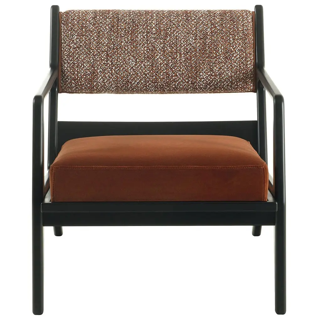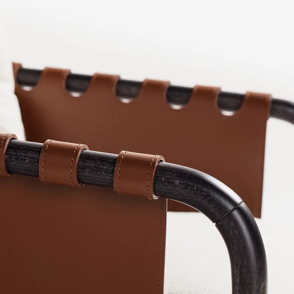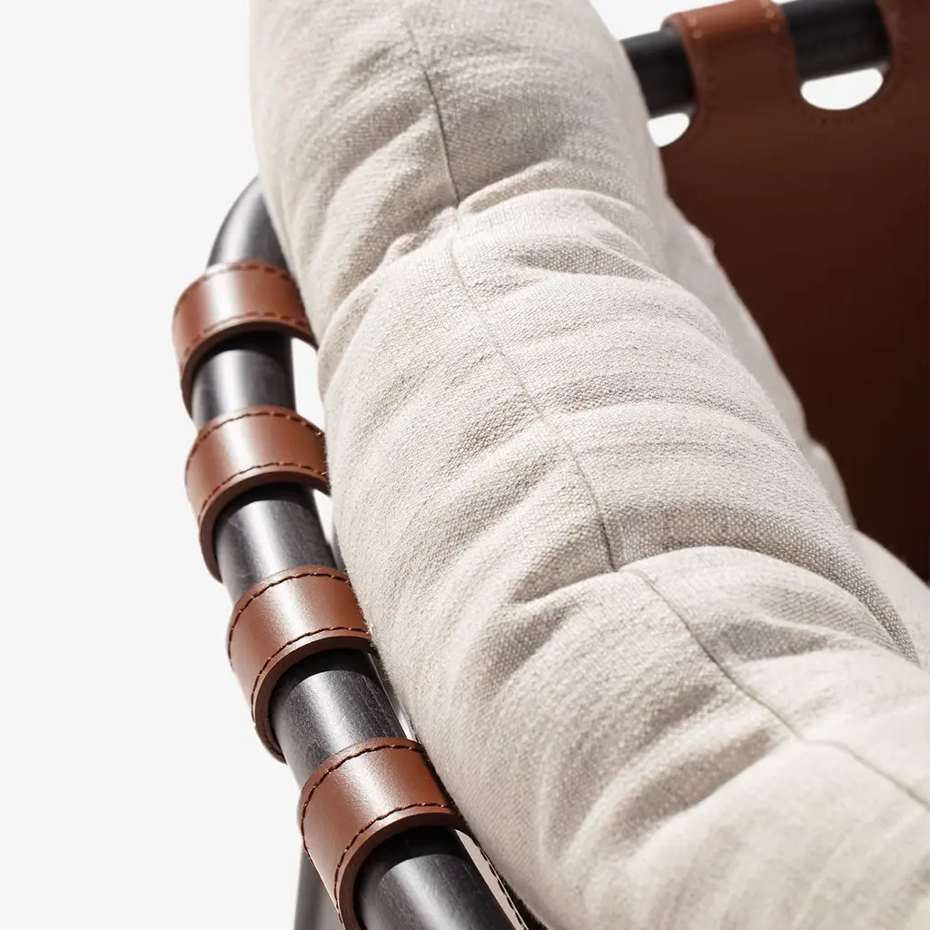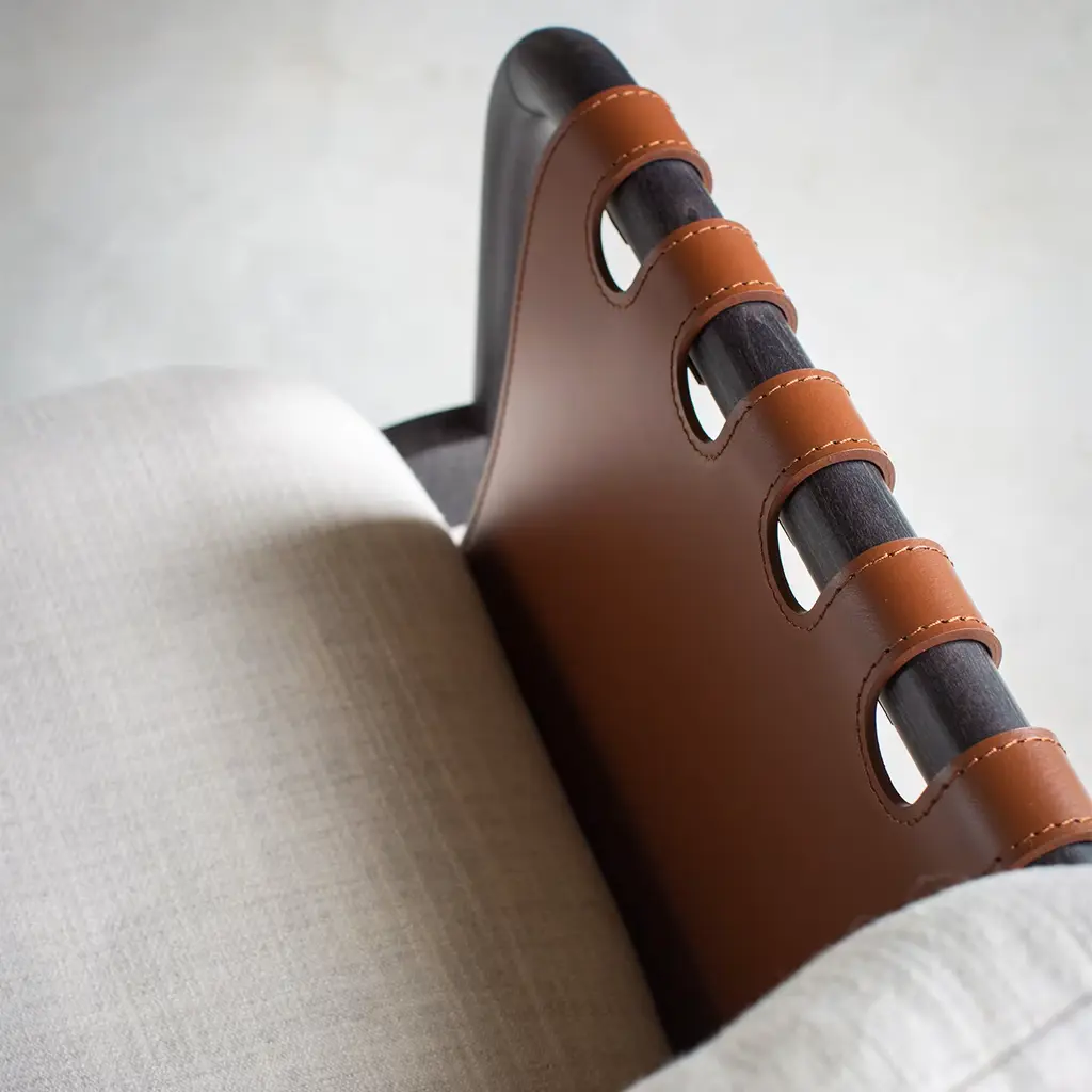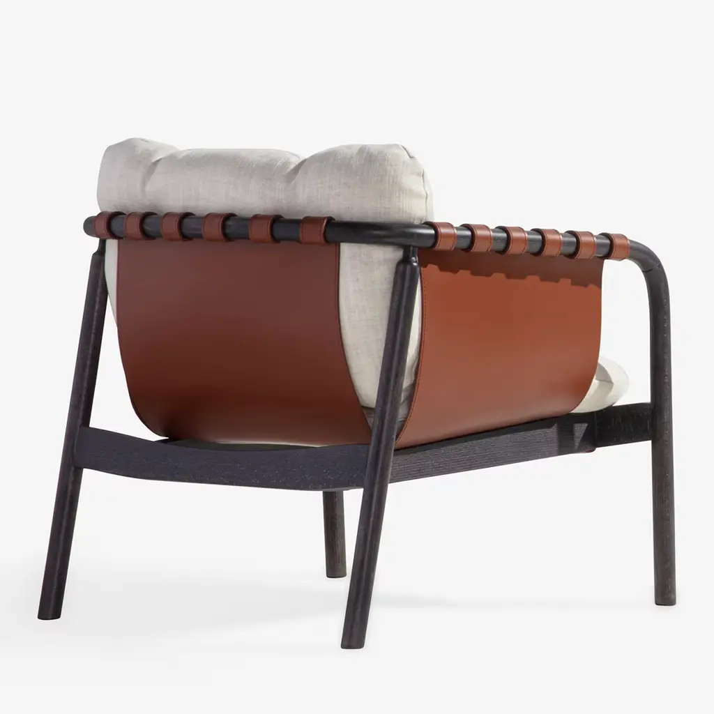 The Bridge lounge chair blends handcrafted leather with a tubular wood frame and soft fabric cushions for a harmonious mix of materials and textures. Balancing form, function, and comfort, its inviting design suits a range of interior styles. Customization is available, please contact the concierge for more information.