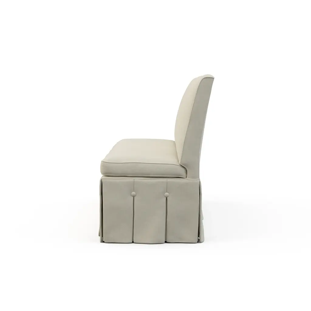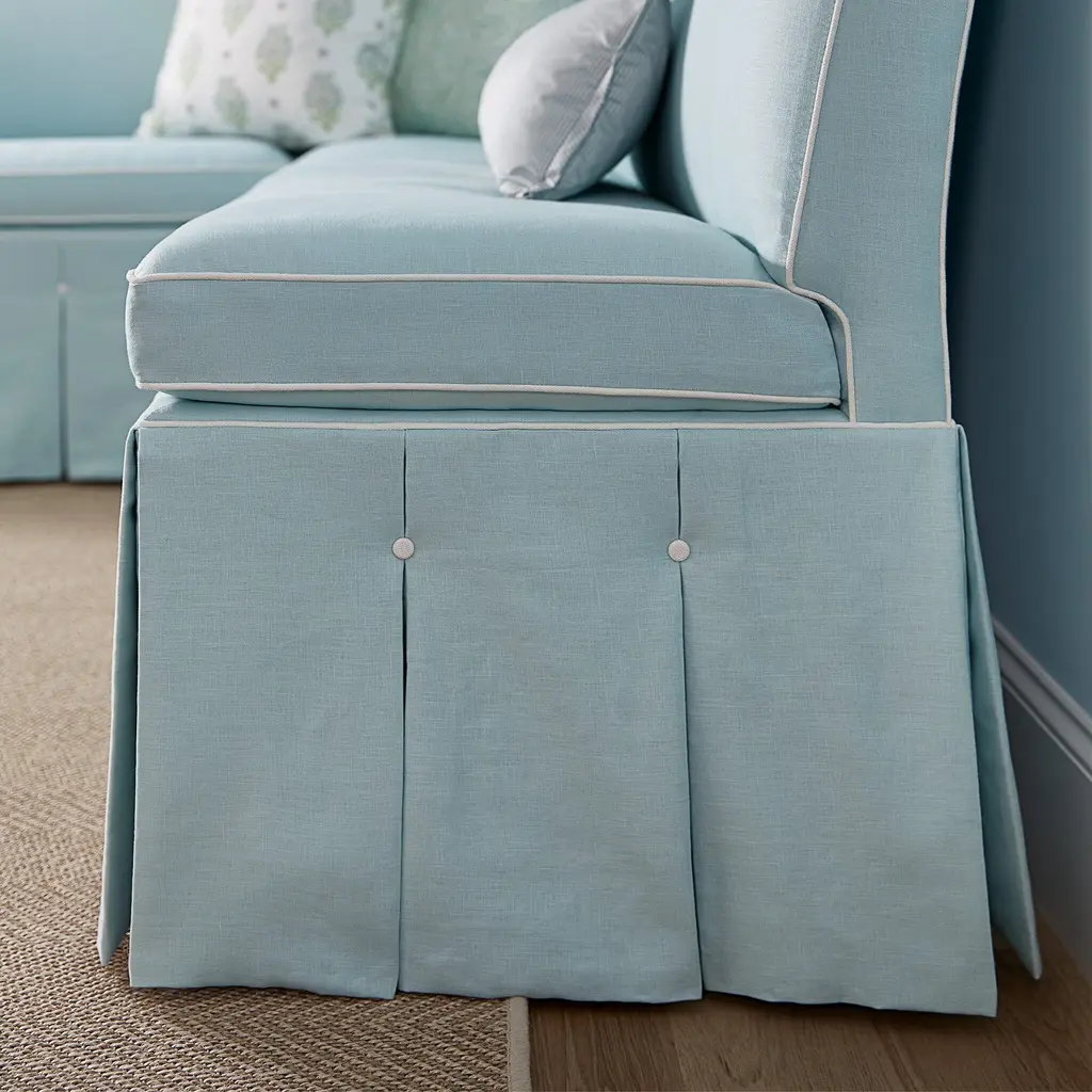 The Briland Armless Banquette is a functional yet timeless addition to your home. Shown with a box pleated skirt, it is also available with custom skirt options to suit your style. This banquette is designed to fit perfectly in any space, adding a touch of new traditional elegance to your room's corner. The Briland collection also includes an armless corner banquette (sold separately). Ships In 8-10 Weeks Tight back Tight seat As Shown Fabric: Rayburn Oatmeal, Roxmoore Mist with Glynn White contrast welt and buttons (lifestyle), Kasper Yellow (lifestyle) As Shown Finish: Antique Walnut If you choose to purchase COM, once you have placed your order a customer service rep will contact you regarding where to send your fabric. Please note that current lead time is 17-19 weeks once your fabric arrives at the factory, and if unused fabric is under 1.5 yards, it cannot be sent back to you.This product can be special ordered in additional fabrics, leathers, finishes, and cushion fillings. Click here to email us for for additional information about special ordering.This image is for illustrative purposes only. The colors shown are accurate within the constraints of lighting, photography, and the color accuracy of your screen.