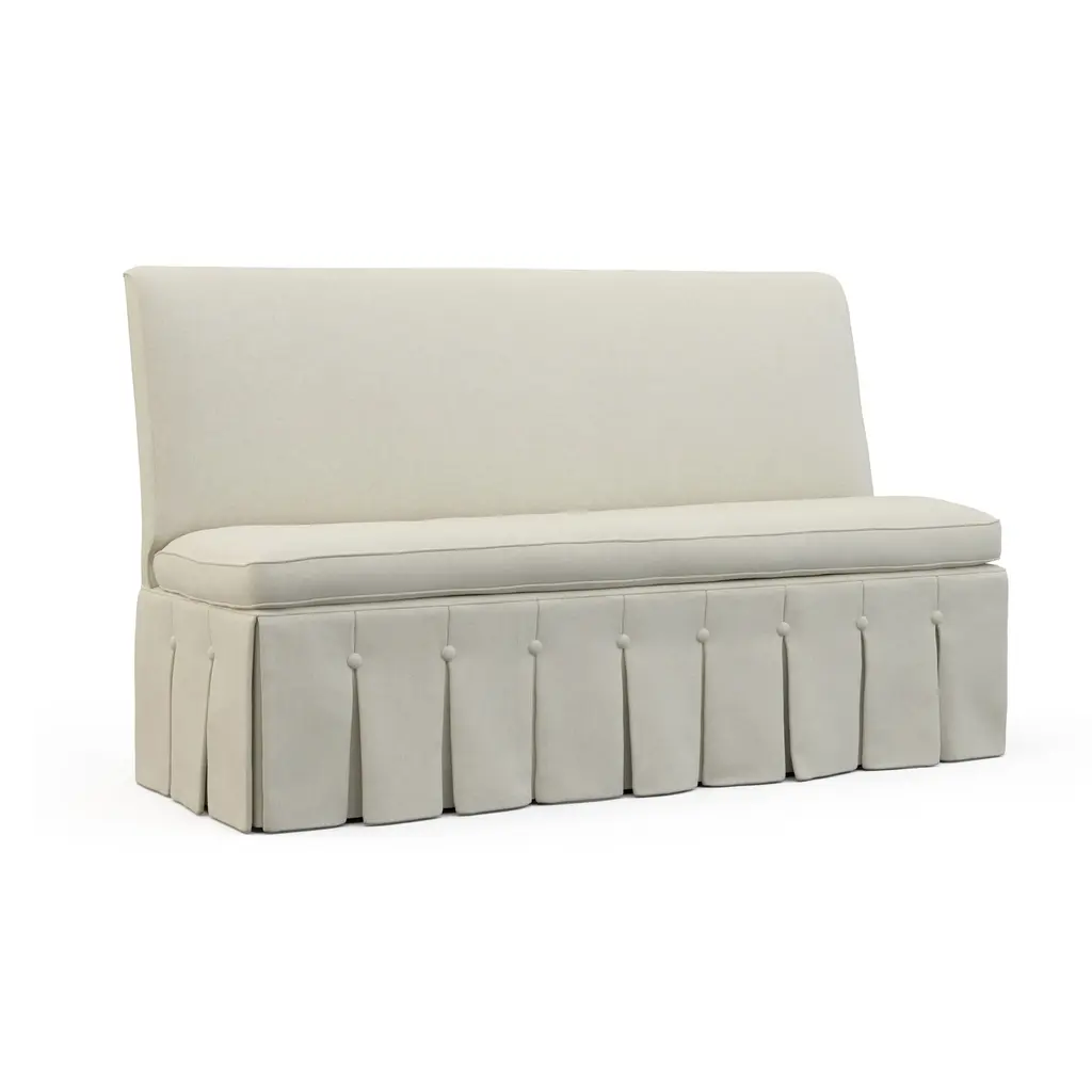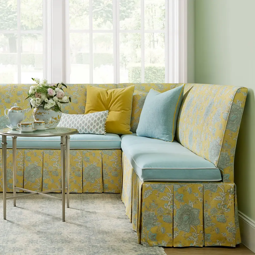The Briland Armless Corner Banquette offers a blend of functionality and timeless elegance, designed to fit seamlessly into any space. Featuring a box pleated skirt, with options for custom skirts, this banquette adds a touch of new traditional charm to your room's corner. The Briland collection also includes an armless banquette (sold separately). Ships In 8-10 Weeks Tight back Tight seat As Shown Fabric: Castine Grey, Roxmoore Mist with Glynn White contrast welt and buttons (lifestyle), Kasper Yellow (lifestyle) As Shown Finish: Antique Walnut If you choose to purchase COM, once you have placed your order a customer service rep will contact you regarding where to send your fabric. Please note that current lead time is 17-19 weeks once your fabric arrives at the factory, and if unused fabric is under 1.5 yards, it cannot be sent back to you.This product can be special ordered in additional fabrics, leathers, finishes, and cushion fillings. Click here to email us for for additional information about special ordering.This image is for illustrative purposes only. The colors shown are accurate within the constraints of lighting, photography, and the color accuracy of your screen.