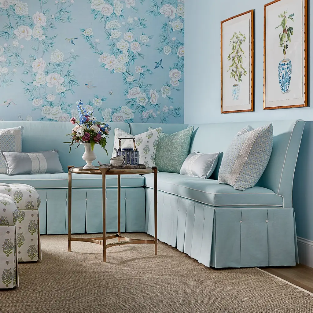 The Briland Armless Corner Banquette offers a blend of functionality and timeless elegance, designed to fit seamlessly into any space. Featuring a box pleated skirt, with options for custom skirts, this banquette adds a touch of new traditional charm to your room's corner. The Briland collection also includes an armless banquette (sold separately). Ships In 8-10 Weeks Tight back Tight seat As Shown Fabric: Castine Grey, Roxmoore Mist with Glynn White contrast welt and buttons (lifestyle), Kasper Yellow (lifestyle) As Shown Finish: Antique Walnut If you choose to purchase COM, once you have placed your order a customer service rep will contact you regarding where to send your fabric. Please note that current lead time is 17-19 weeks once your fabric arrives at the factory, and if unused fabric is under 1.5 yards, it cannot be sent back to you.This product can be special ordered in additional fabrics, leathers, finishes, and cushion fillings. Click here to email us for for additional information about special ordering.This image is for illustrative purposes only. The colors shown are accurate within the constraints of lighting, photography, and the color accuracy of your screen.