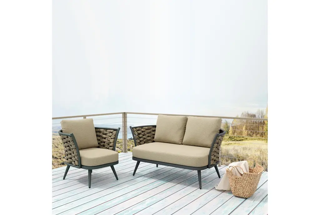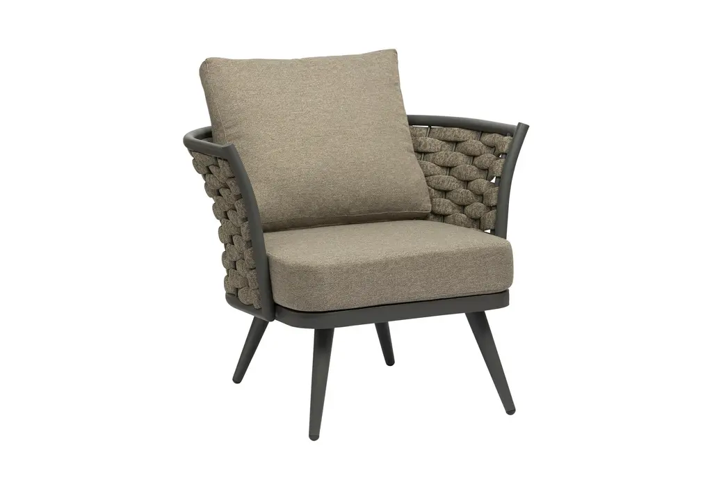 Introducing the Brown Taupe Fabric Gray Metal Frame Outdoor Lounge Chair with Arms, perfect for adding a touch of modern sophistication to your outdoor space. The taupe fabric and grey metal frame combine to create a neutral, inviting look that complements any decor. Enjoy the ultimate in comfort and style with this contract grade chair, designed for durability and long-lasting use.