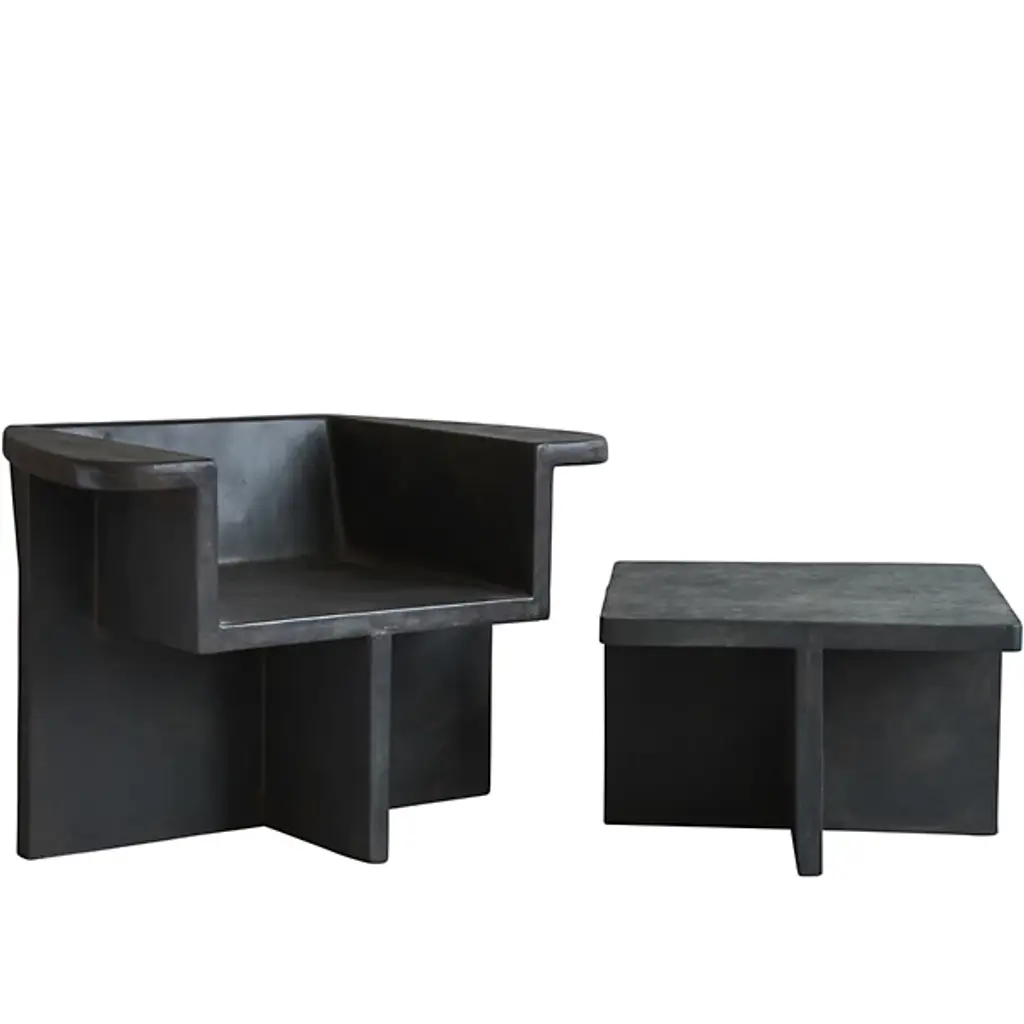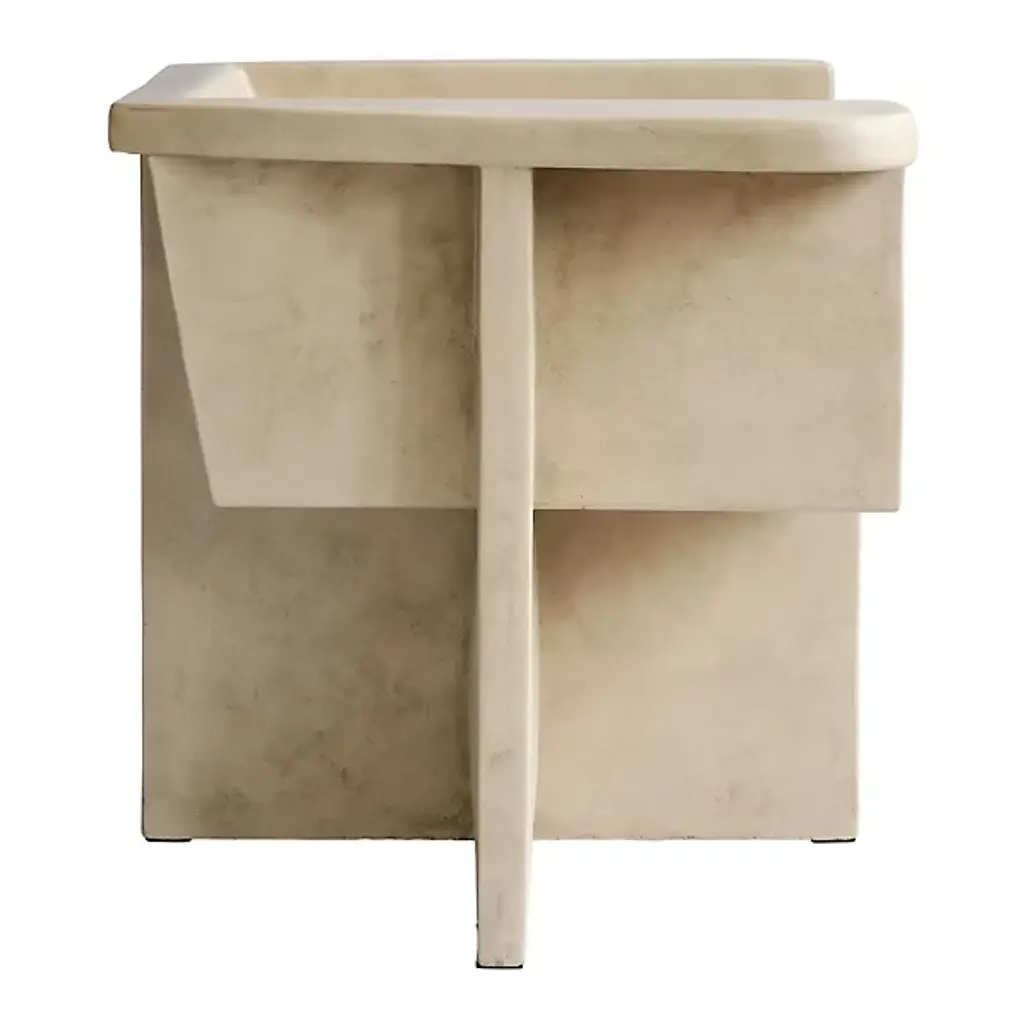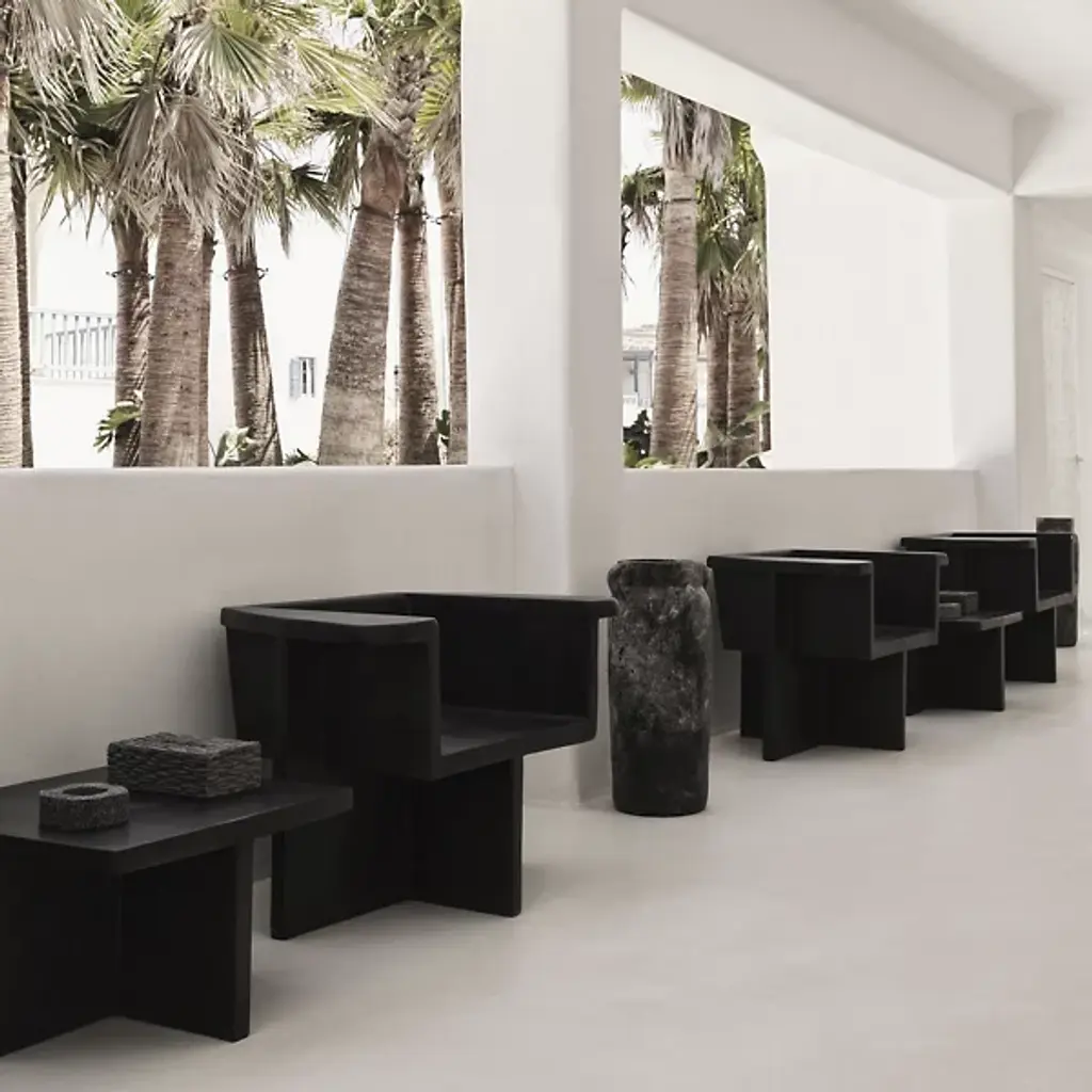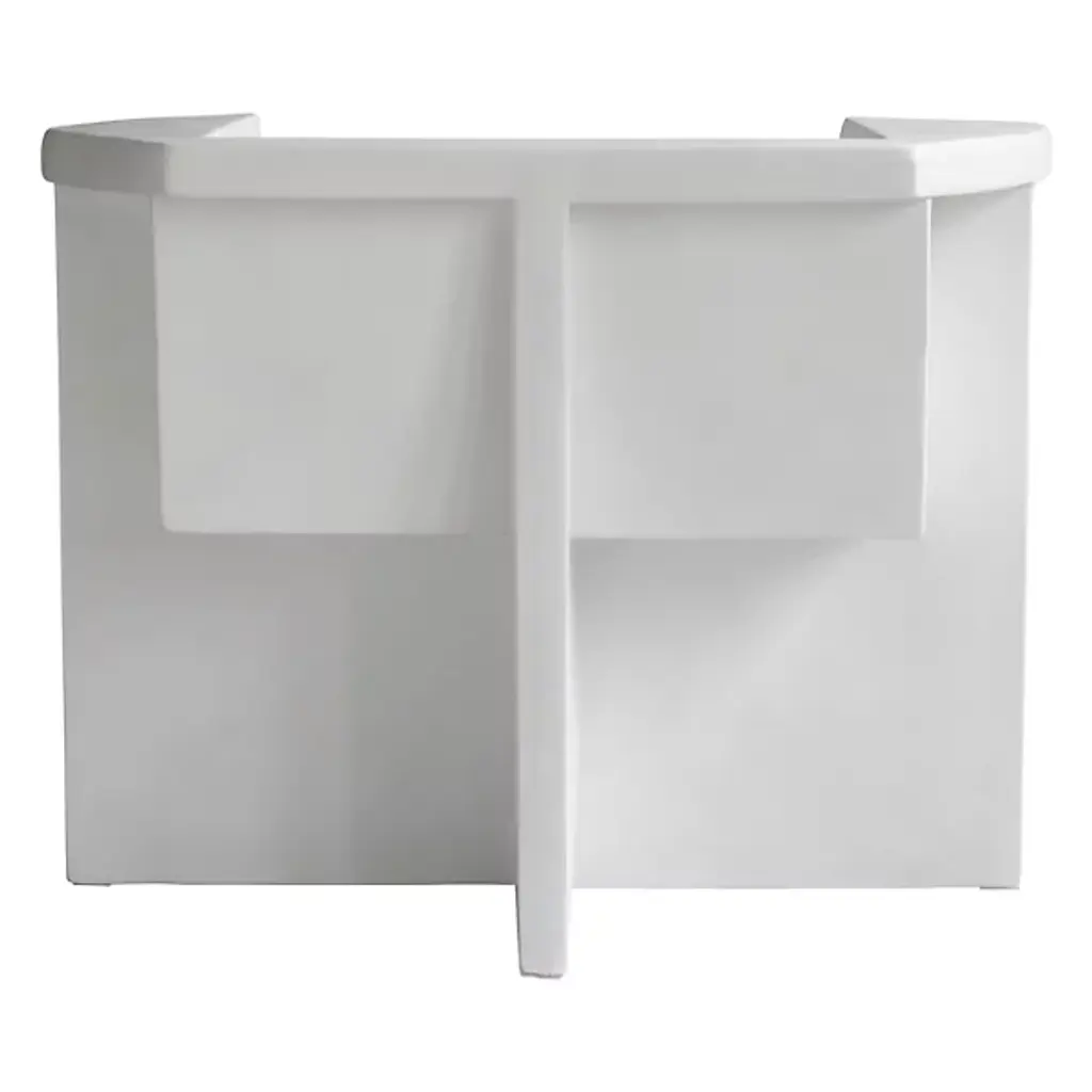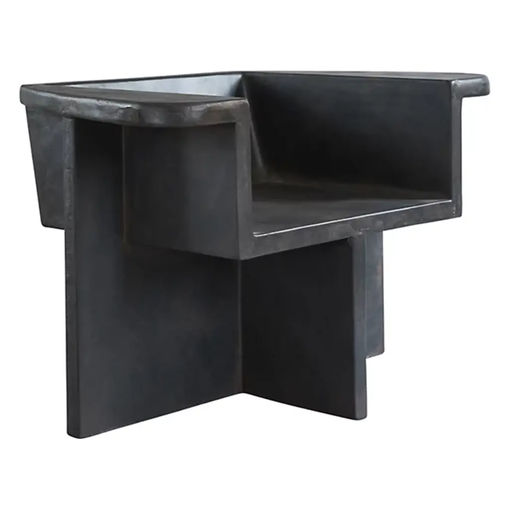 Inspired by the Brutalist architecture movement of the mid-20th century, the Brutus Lounge Chair from 101 Copenhagen is crafted from lightweight fiber concrete, offering a unique texture and easy mobility. Each chair is hand-painted, giving it a distinct, textured surface. The design skillfully balances sharp architectural lines with softer curves in the back and armrests, resulting in a sculptural piece that provides both striking visual appeal and exceptional seating comfort.