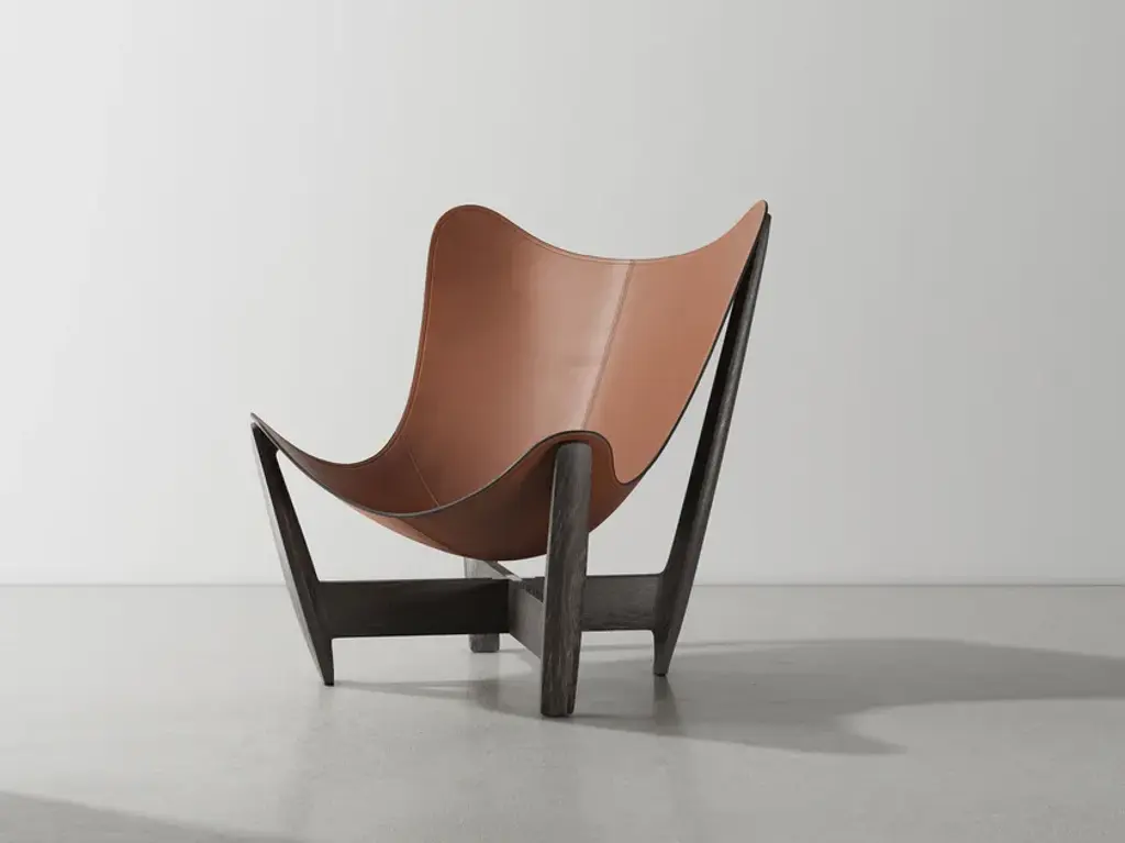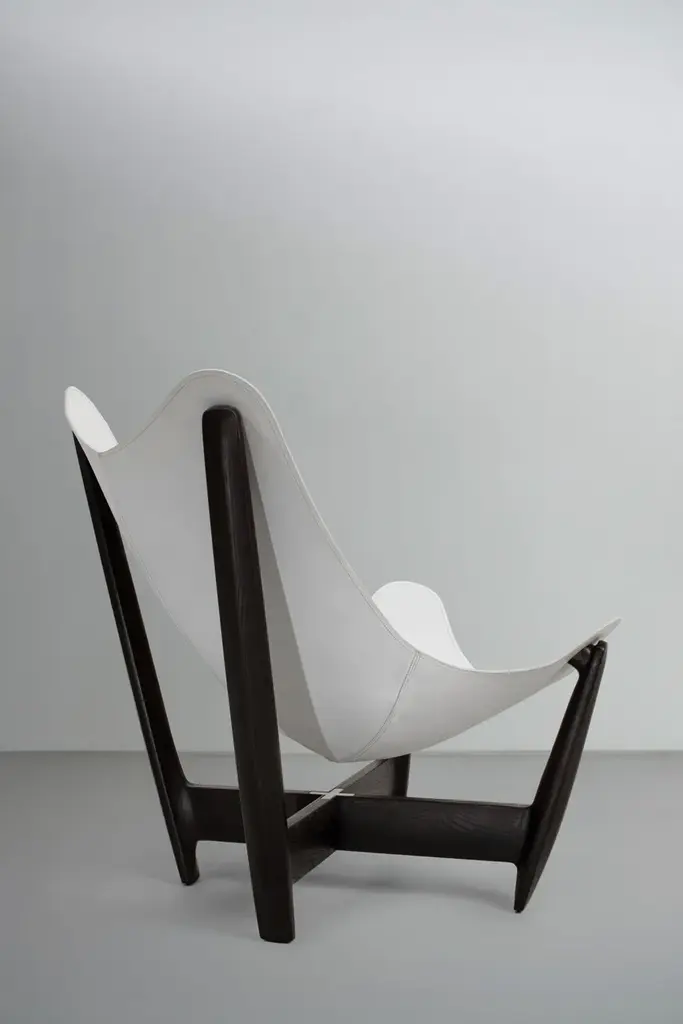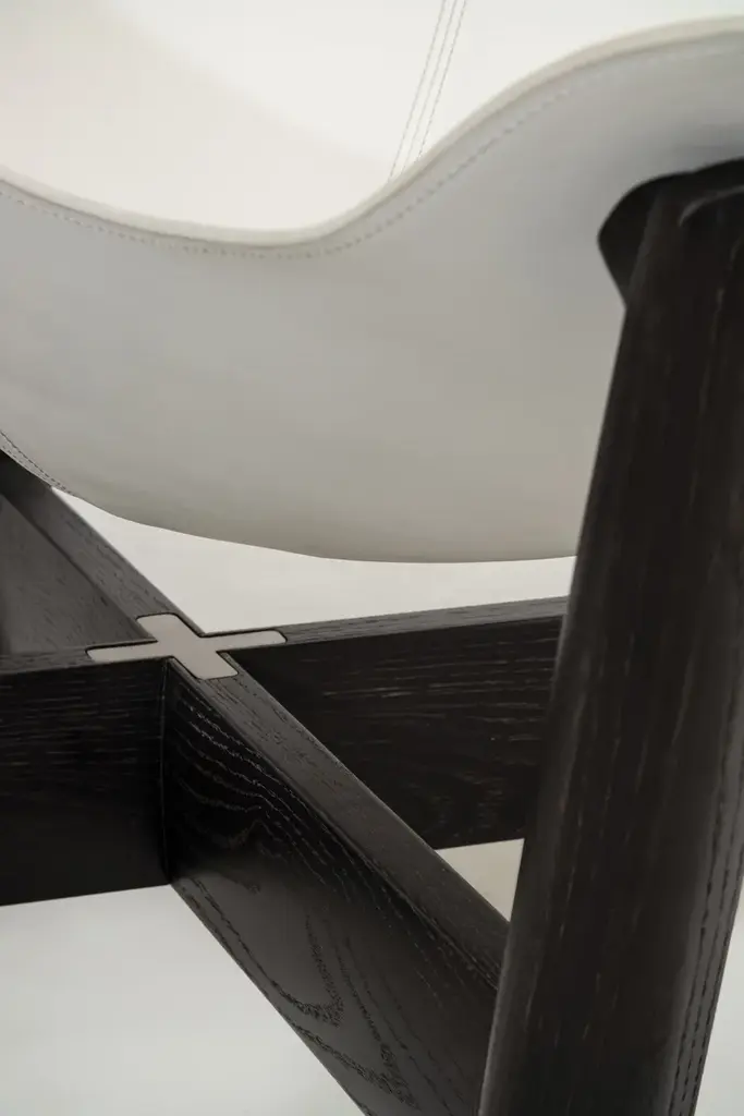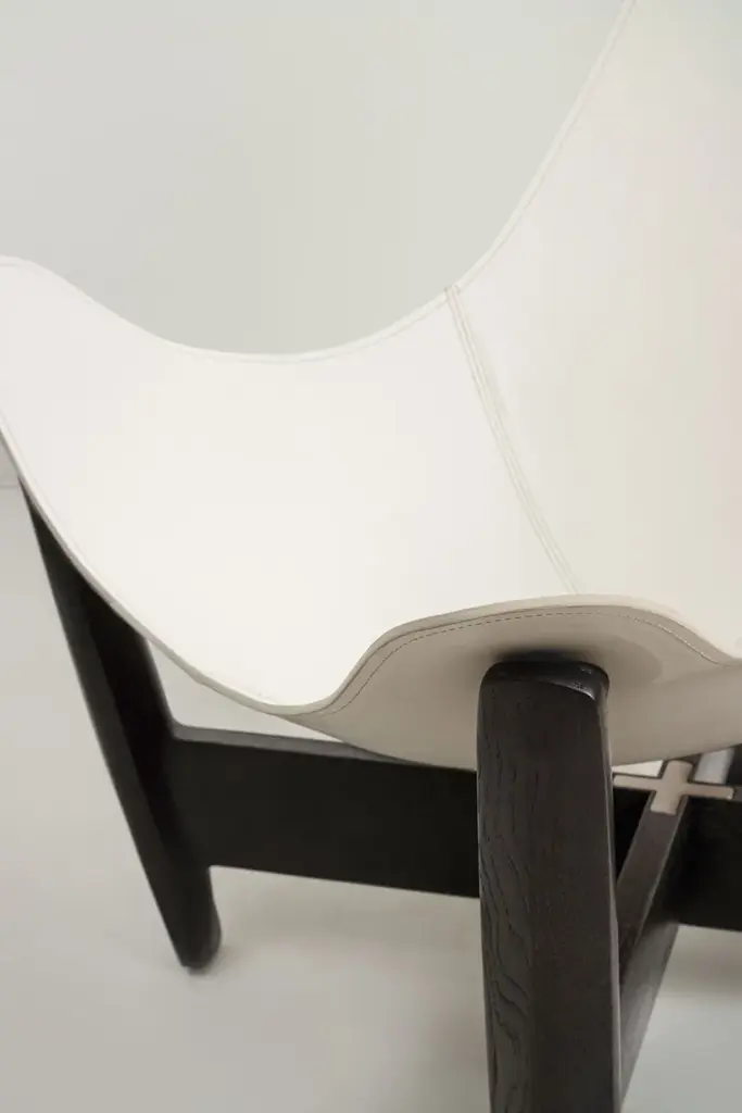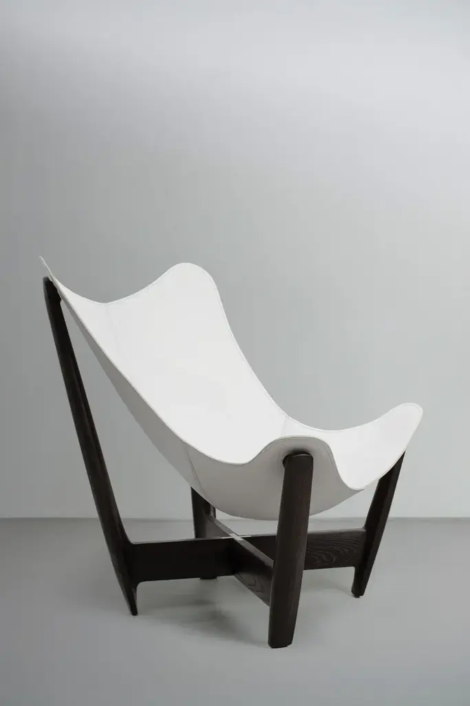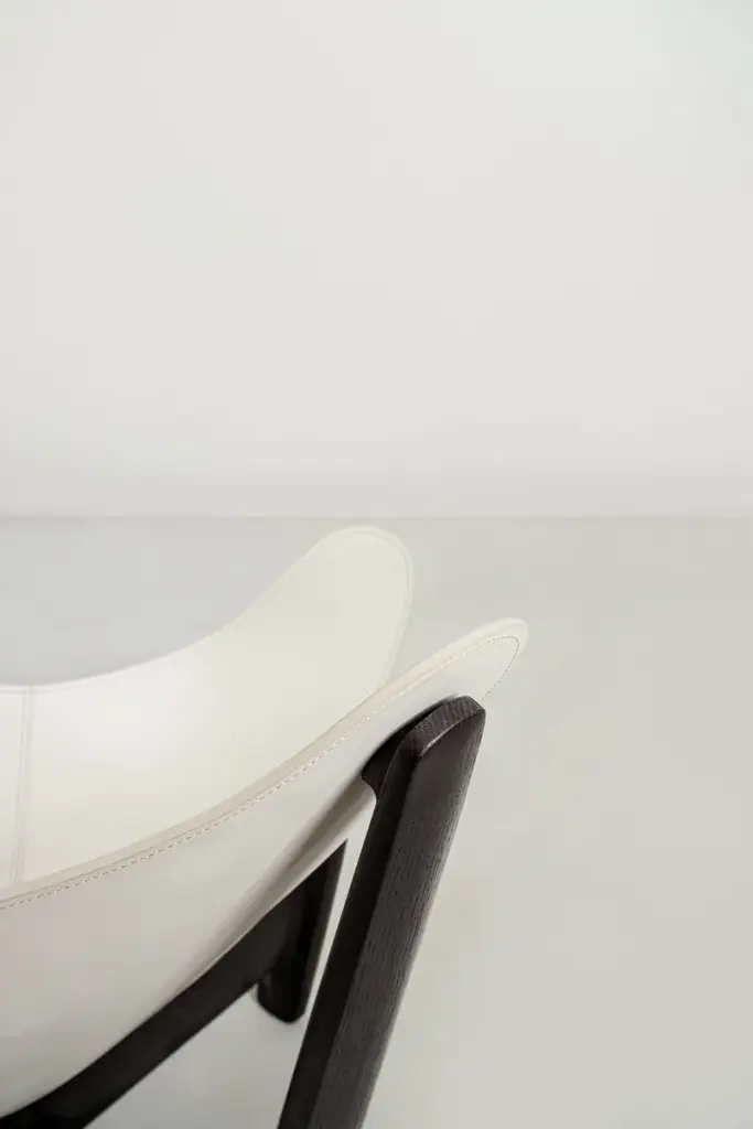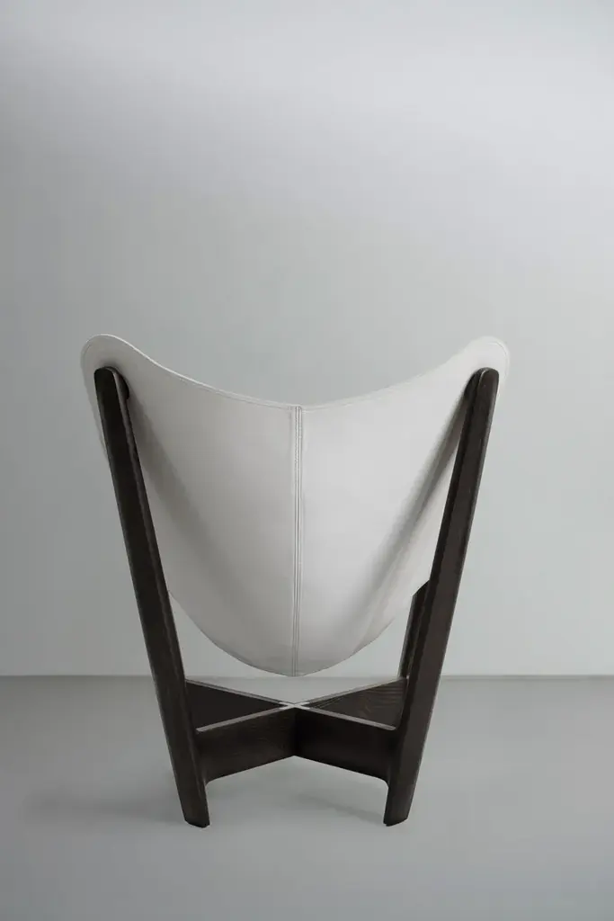 Buom reinvents a familiar archetype with sophistication. This solitary armchair combines the elegance of suspended comfort with the sensuality of a robust structure. Its leather seat is moulded after the silhouette of full-blown sails, known as buồm, in Vietnamese traditional boat, and through expert craftsmanship, appears as if it’s only touching the slanted legs. The solid oak frame enhances its sturdy support, with cross stretchers forming a visual dynamic with the seat’s undulating lines. BUOM is the timeless companion that embodies our demands for lightness and refinement.