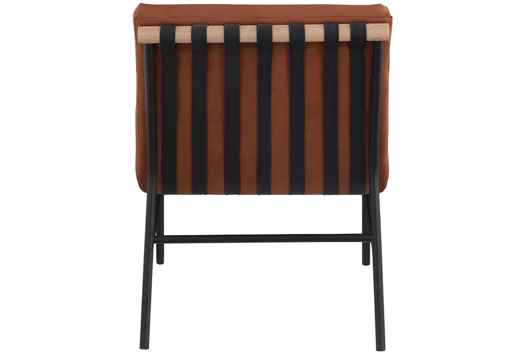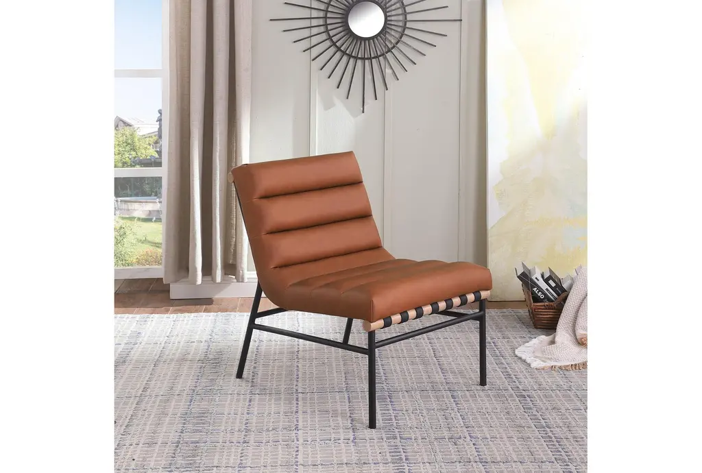 The Burke Cognac Brown Vegan Leather Accent Chair is the perfect addition to your living room. Its modern design and rich cognac color will complement any decor style. The armless feature allows for easy movement and versatility in placement.