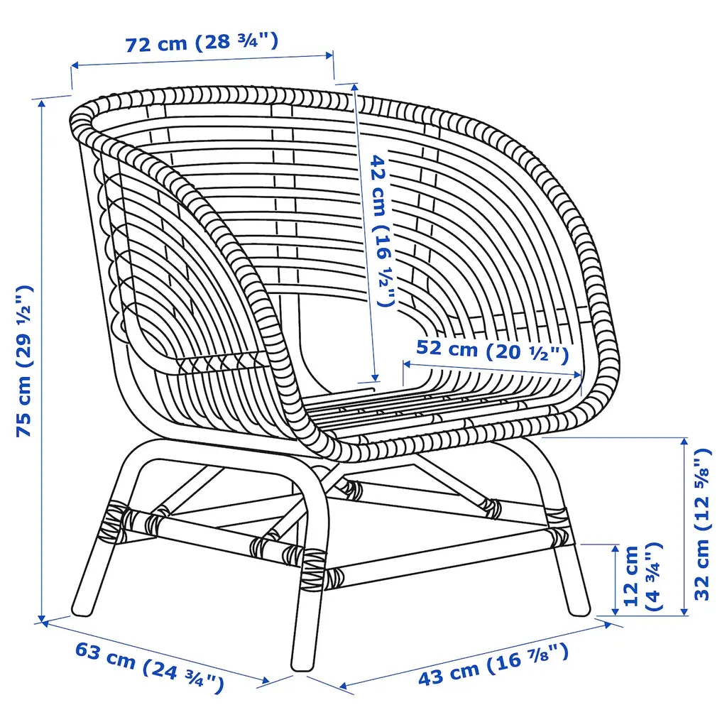 BUSKBO Armchair - rattan. Handmade by experienced craftspeople, which makes each armchair unique. Rattan is a natural material which ages beautifully and develops its own unique character over time. Plastic feet protect your floor against scratching. For indoor use.