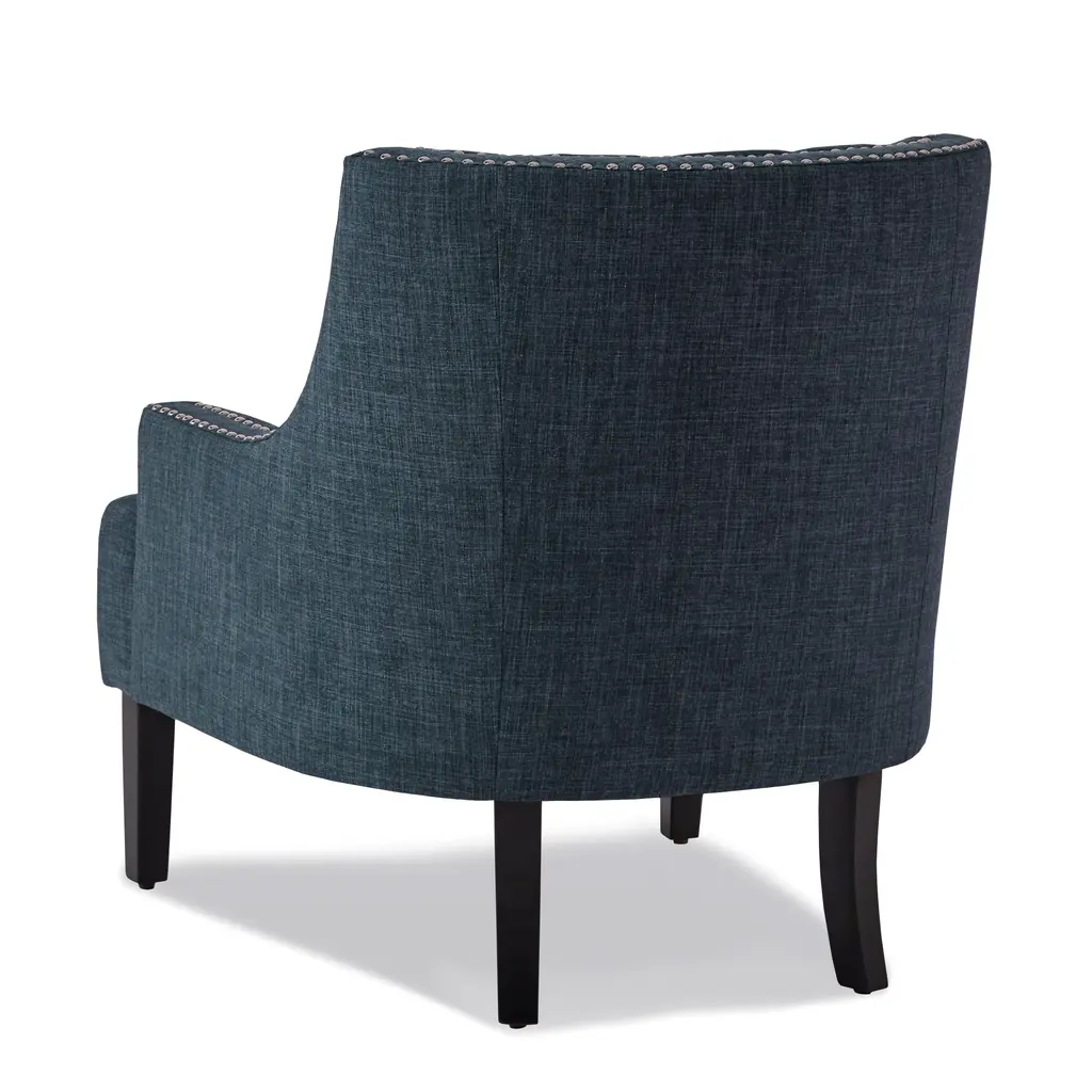 Solid wood and plywood frame; Dacron wrapped foam cushions; Textured fabric upholstery; Attached back and seat cushions; Exposed wood legs with black finish; Button-tufted chair back; Nailhead trim