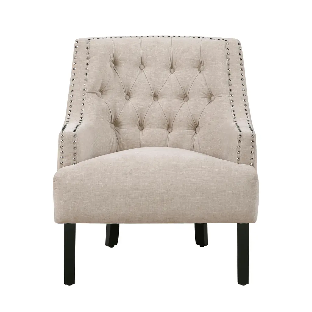 Solid wood and plywood frame; Dacron wrapped foam cushions; Textured fabric upholstery; Attached back and seat cushions; Exposed wood legs with black finish; Button-tufted chair back; Nailhead trim