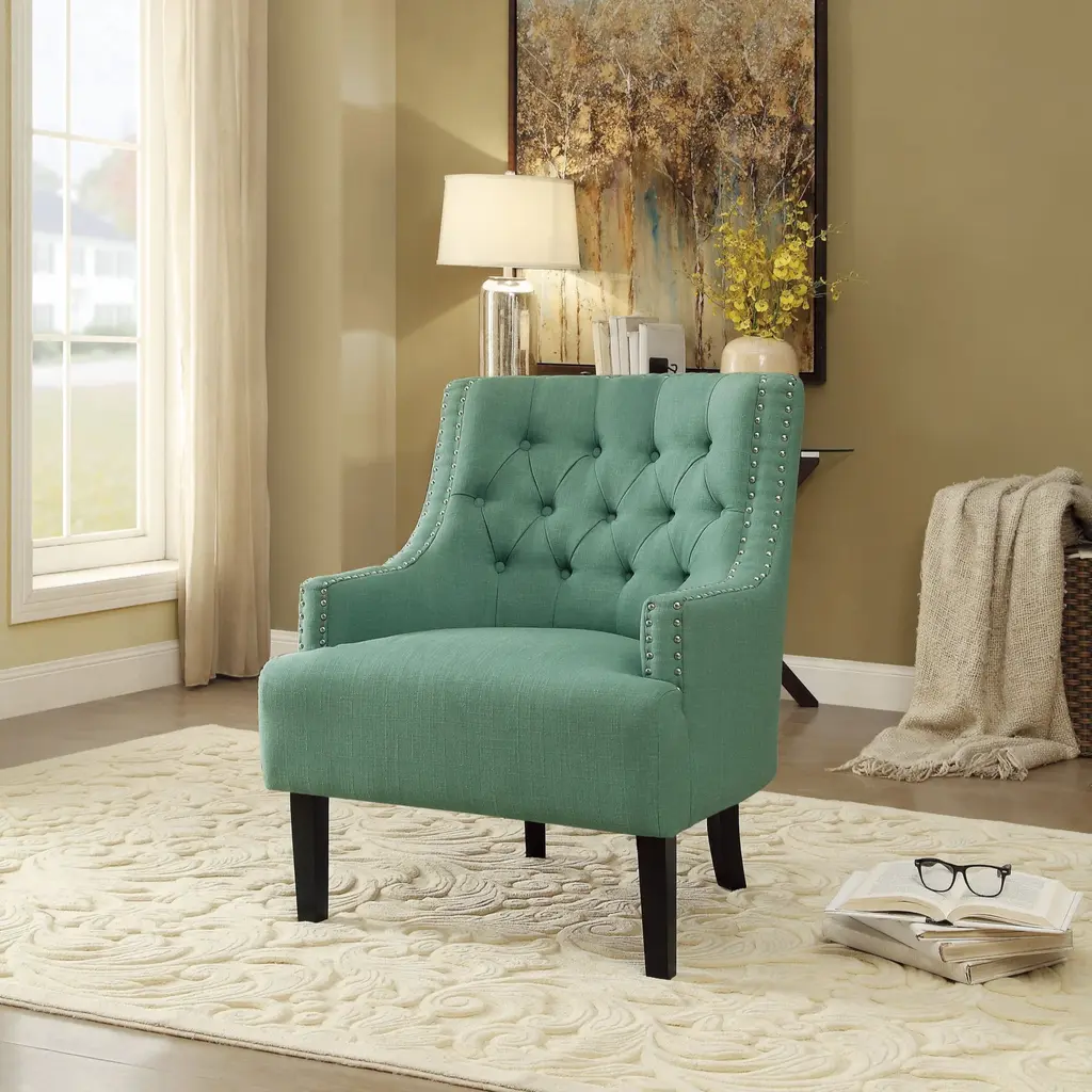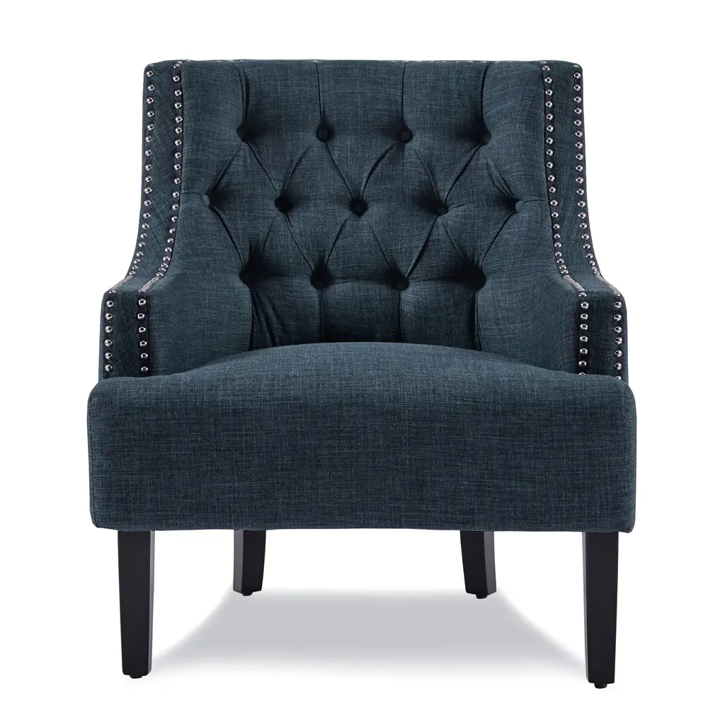 Solid wood and plywood frame; Dacron wrapped foam cushions; Textured fabric upholstery; Attached back and seat cushions; Exposed wood legs with black finish; Button-tufted chair back; Nailhead trim