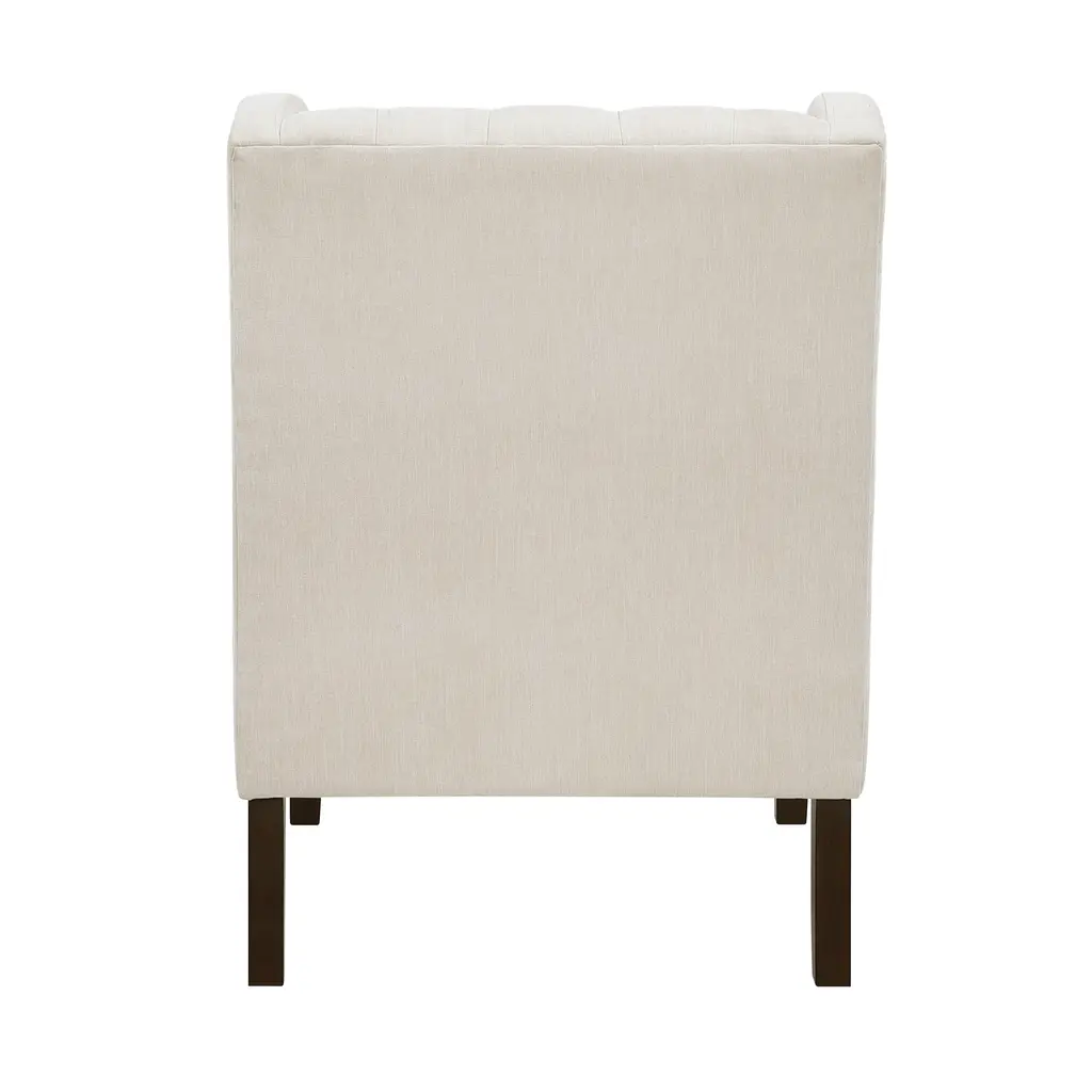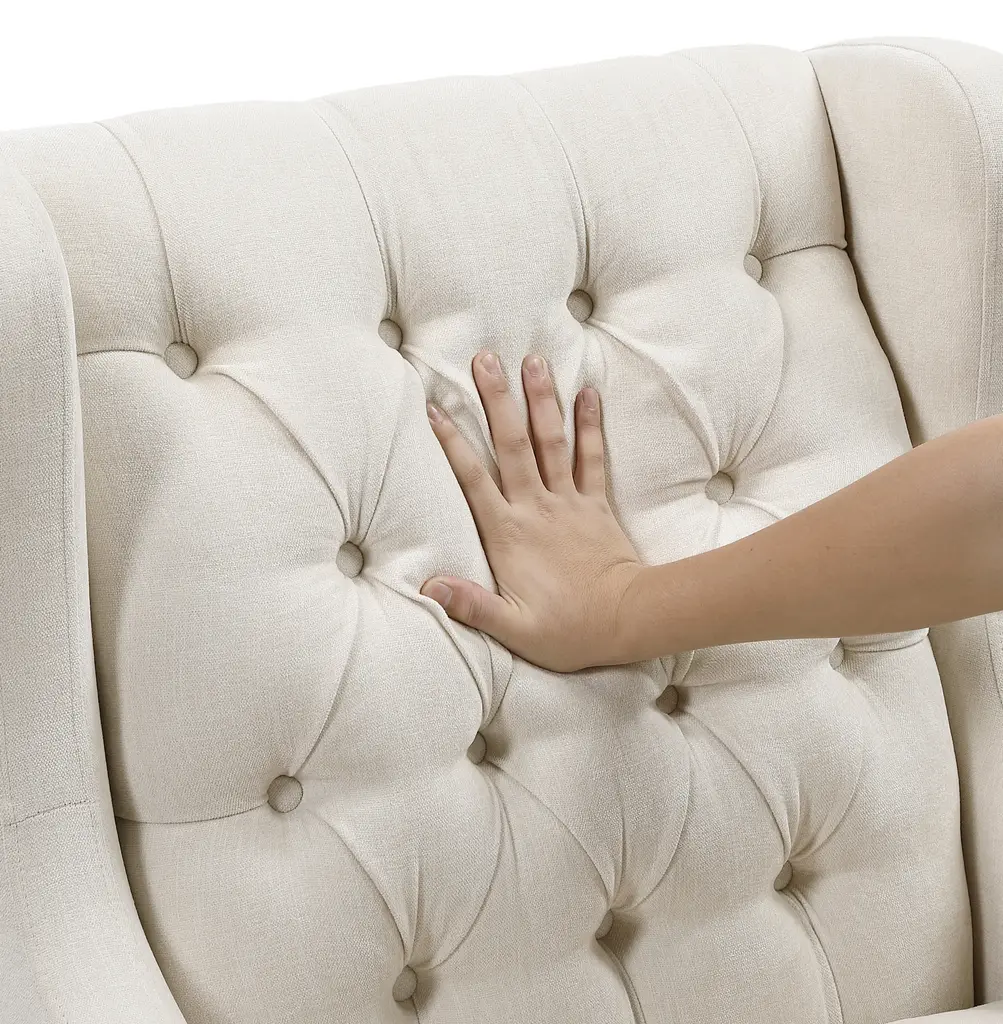 Plywood frame; Foam cushioned seat; Textured fabric upholstery; Attached back and loose seat cushions; Removable seat cushion cover with zipper; Button-tufted chair back; Rubber wood legs in espresso finish