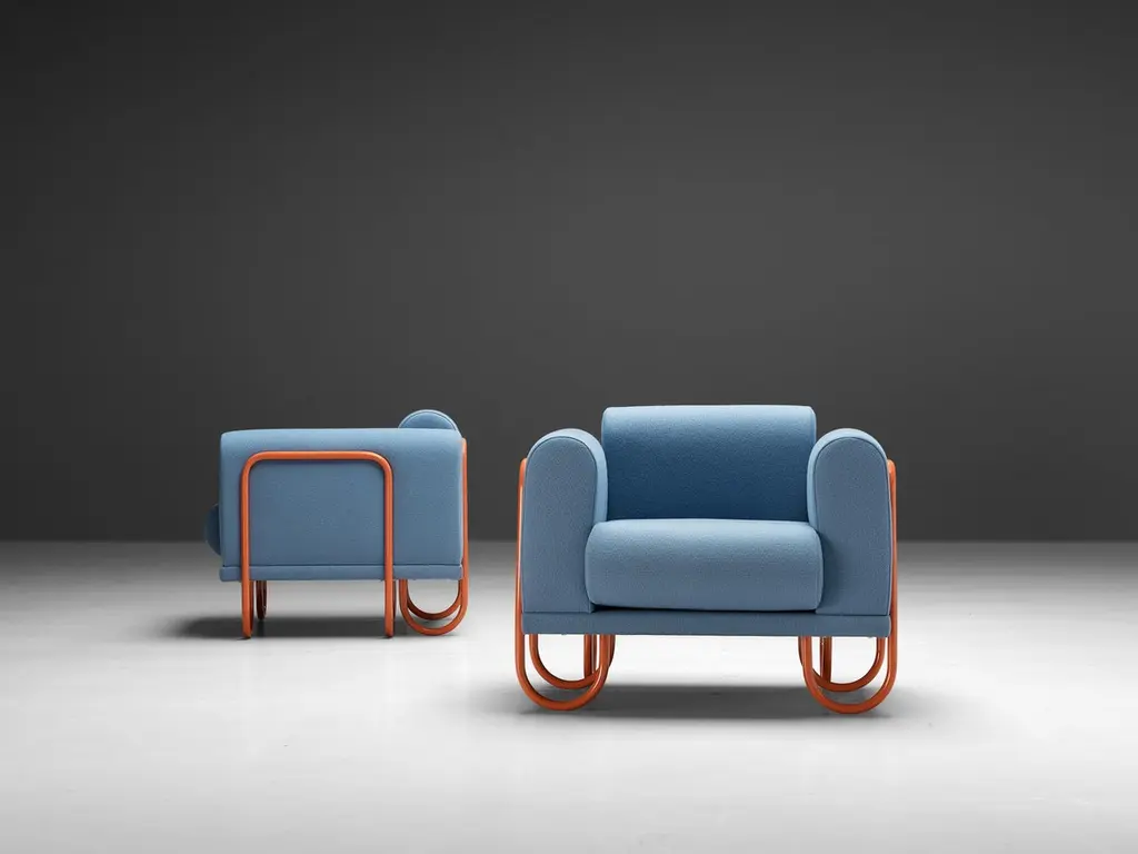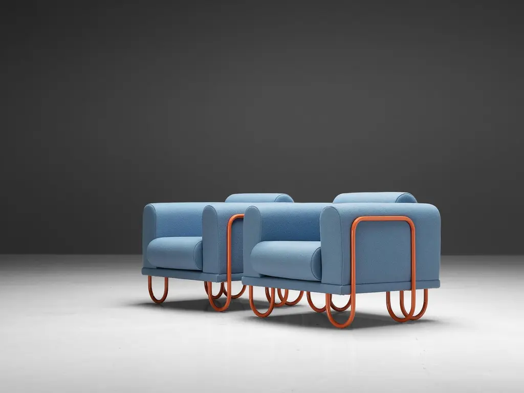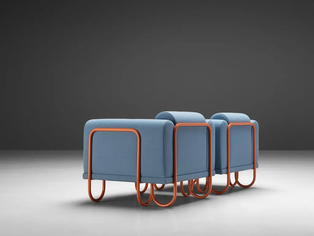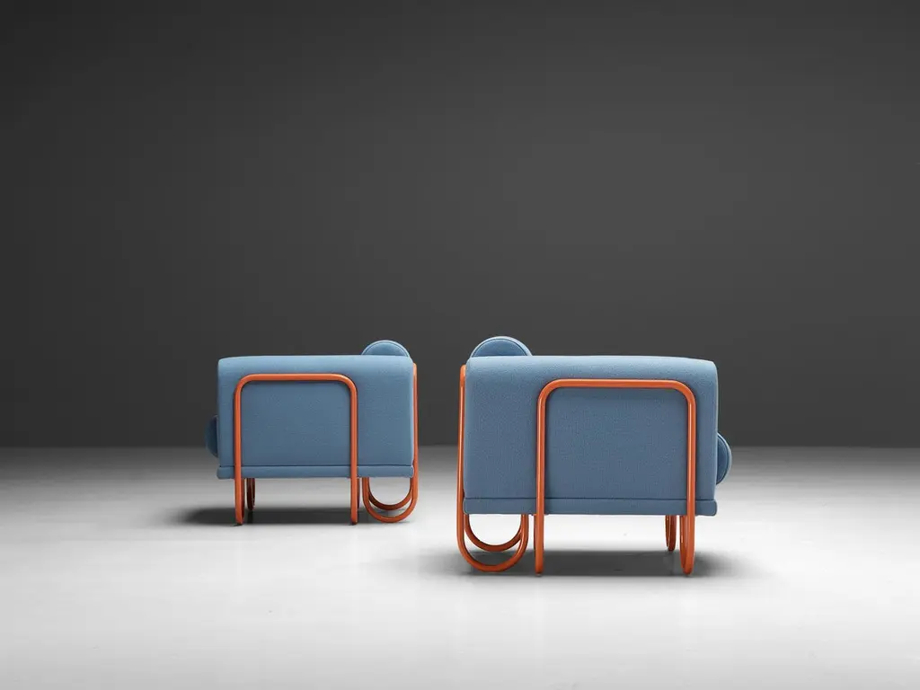 Byron Botker for Landes, lounge chairs, blue fabric, chrome-plated steel, United States, 1970sA comfortable easy chair that features a curved, orange tubular frame. The frame appears to be an ongoing curved line, moving upwards to support the cushions and downwards, functioning as legs. The seat is shaped by the thick cushions, which are rounded at the top and assure great comfort. We have a large number available, which makes this model perfect for a large scale interior project.Please note that the depicted photographs show an example of the way this item can be tailored to specific wishes of our clients. We kindly ask you to contact our design experts to discuss your wishes regarding upholstery and finishing. Your special requests can be realized by the experienced craftspeople in our own in-house restoration and upholstery atelier. With high attention to the original, they make sure every piece retains its value and is ready for the many years to come. Please note that a custom-made reupholstered chair has a lead-time of twelve to fourteen weeks. All to meet our high-quality and standards.The listed price is per item.