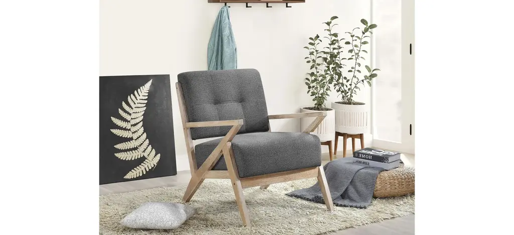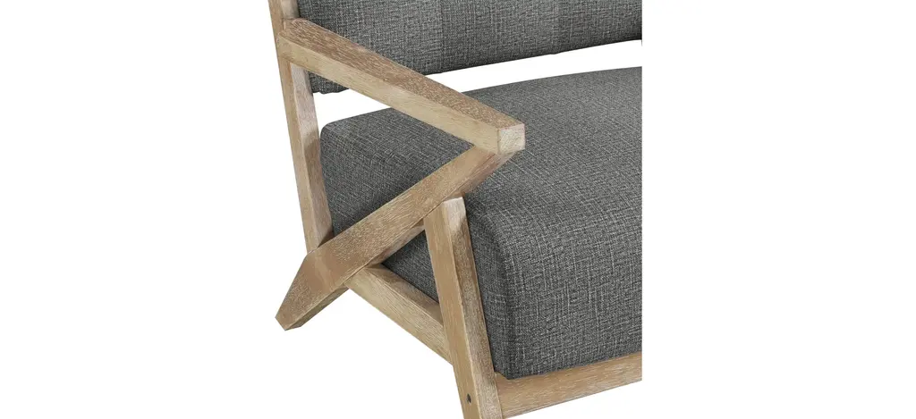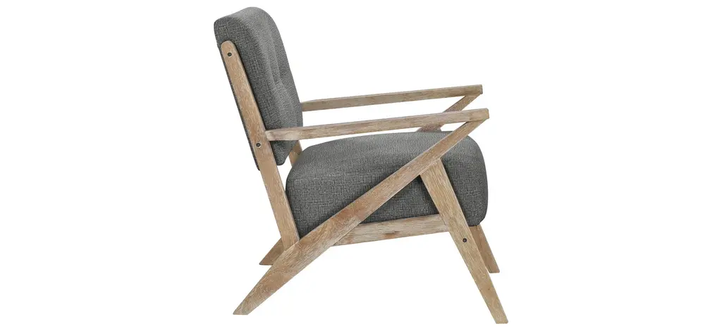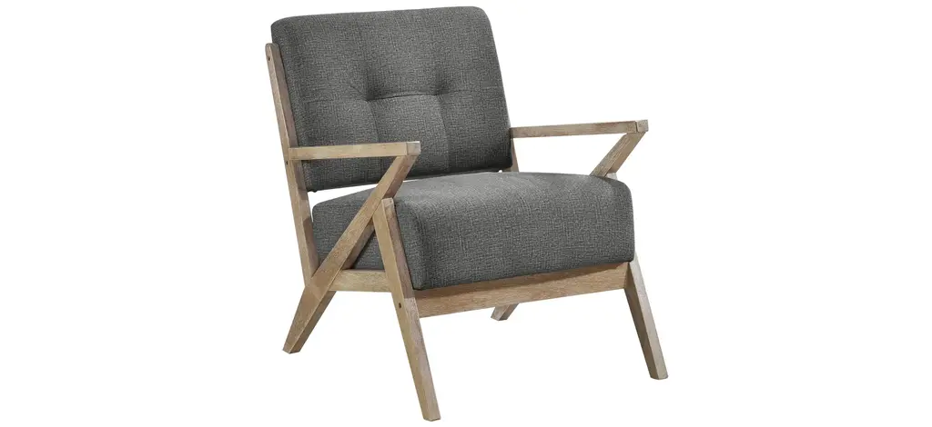 Angled lines intersect to create the modern profile of the Cagle Accent Chair. The rusticated solid wood frame is highlighted with an antique walnut finish. The dark gray fabric upholstery that covers the seat and back of the chair will serve as a complement to your home's decor. The padded seatback features tufted contouring for added accent.