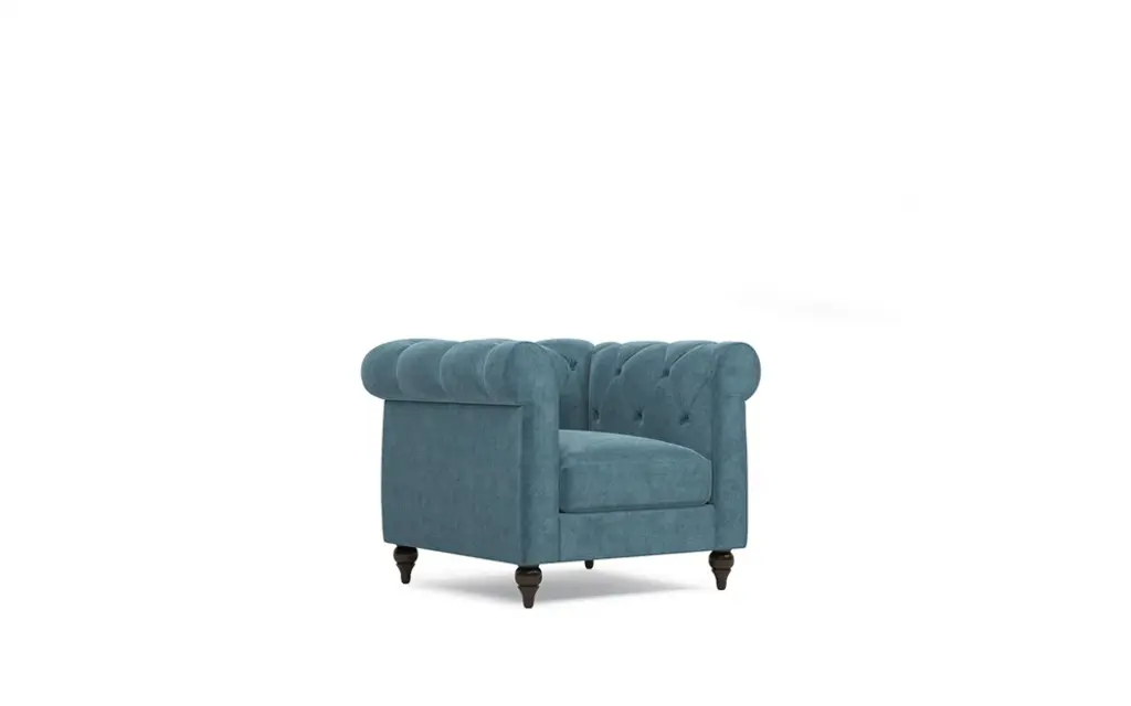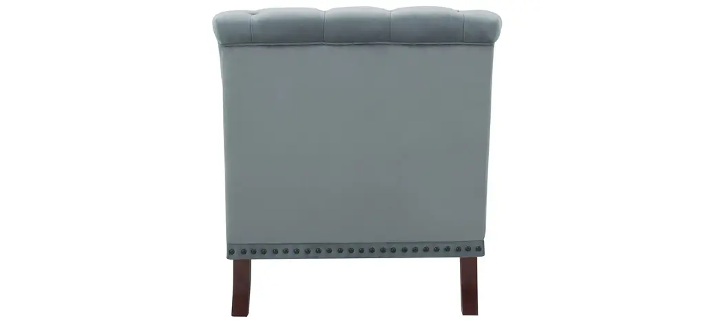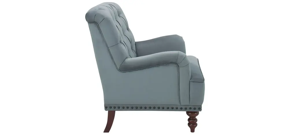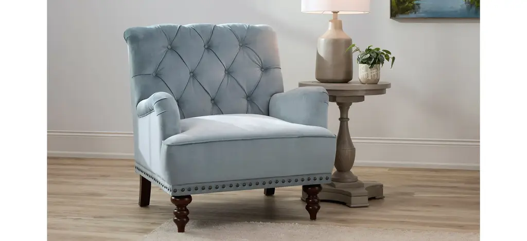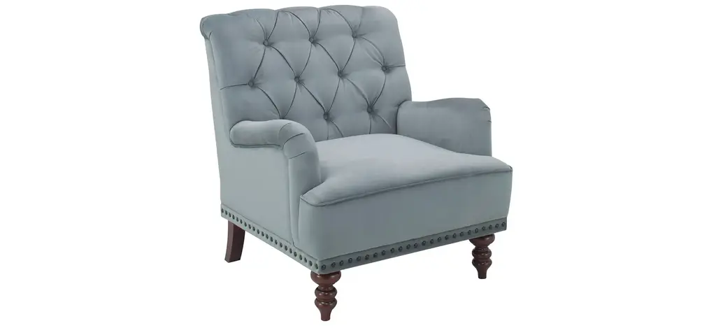 The Camila Tufted Accent Chair gives us all the feels, literally. It features buttery-soft velvet in a beautiful powder blue/gray hue, stylish bun feet for a timeless appeal, perfectly pleated arms, and classic nailhead trim.