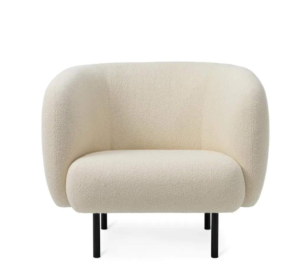 Cape lounge chair cream by Warm NordicDimensions: D 90 x W 82 x H 80 cmMaterial: Textile upholstery, Wooden frame, Powder coated black steel legsWeight: 34.5 kgAlso available in different colours and finishes.An elegant armchair with an organic design inspired by the puffed sleeves and layered designs of haute couture. Its soft lines and chic details make the Cape armchair a real eye-catcher. The chair is lovely to sit in, maybe even more so when accompanied by the sofa from the same range. Both items of furniture are available with or without visible stitching. In the Cape armchair's simple, yet rich design there lurks a detailed aesthetic and an implicit sensuousness. The Cape range is covered with exclusive furnishing fabrics, including 'Hero', whose soft, almost felt-like surface complements the armchairs organic shape, and which is designed by Patricia Urquiola.Warm Nordic is an ambitious design brand anchored in Nordic design history and with a timeless, aesthetic style that inspires you to appreciate the little things in life. The company is the result of several years’ intense work on developing a new design brand with design history, quality and personality at its core. Warm Nordic boasts a colourful and charming universe of furniture, lamps and accessories full of personality. Our designs encapsulate the Nordic spirit, which in its essence is timeless, inclusive and warm.