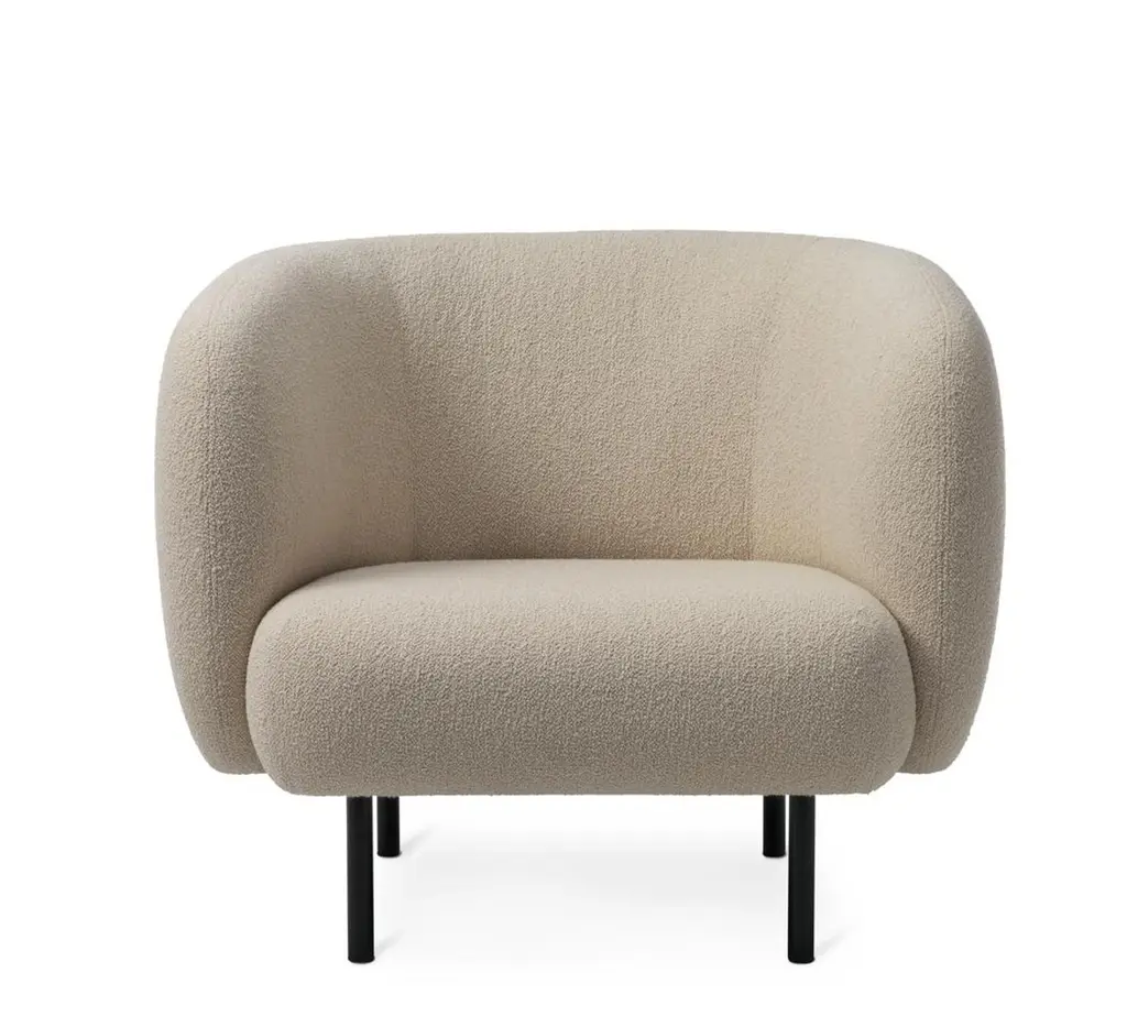 Cape Lounge chair sand by Warm NordicDimensions: D90 x W82 x H 80 cmMaterial: Textile upholstery, Wooden frame, Powder coated black steel legsWeight: 34.5 kgAlso available in different colors and finishes.An elegant armchair with an organic design inspired by the puffed sleeves and layered designs of haute couture. Its soft lines and chic details make the Cape armchair a real eye-catcher. The chair is lovely to sit in, maybe even more so when accompanied by the sofa from the same range. Both items of furniture are available with or without visible stitching. In the Cape armchair's simple, yet rich design there lurks a detailed aesthetic and an implicit sensuousness. The Cape range is covered with exclusive furnishing fabrics, including 'Hero', whose soft, almost felt-like surface complements the armchairs organic shape, and which is designed by Patricia Urquiola.Warm Nordic is an ambitious design brand anchored in Nordic design history and with a timeless, aesthetic style that inspires you to appreciate the little things in life. The company is the result of several years’ intense work on developing a new design brand with design history, quality and personality at its core. Warm Nordic boasts a colourful and charming universe of furniture, lamps and accessories full of personality. Our designs encapsulate the Nordic spirit, which in its essence is timeless, inclusive and warm.