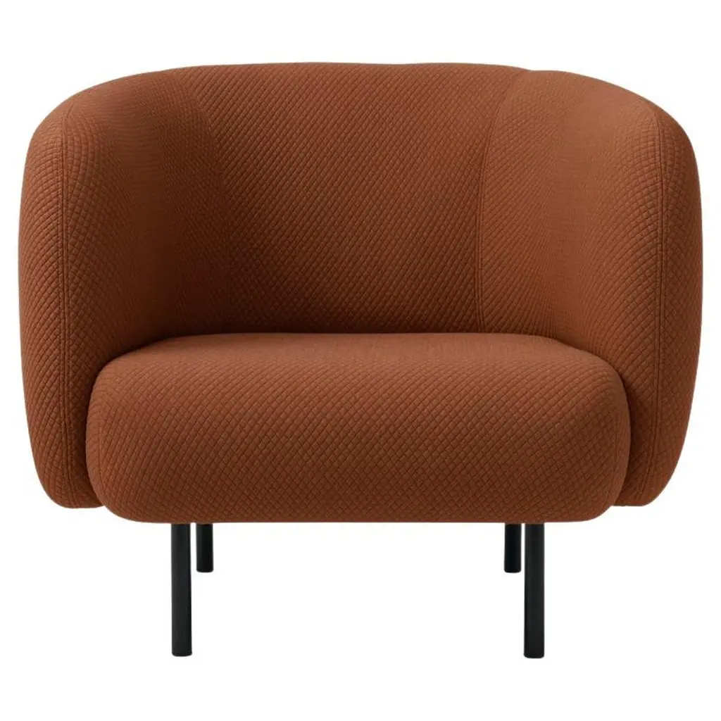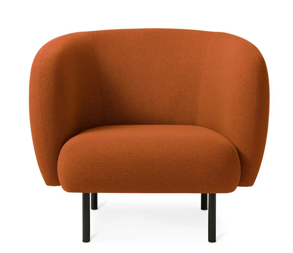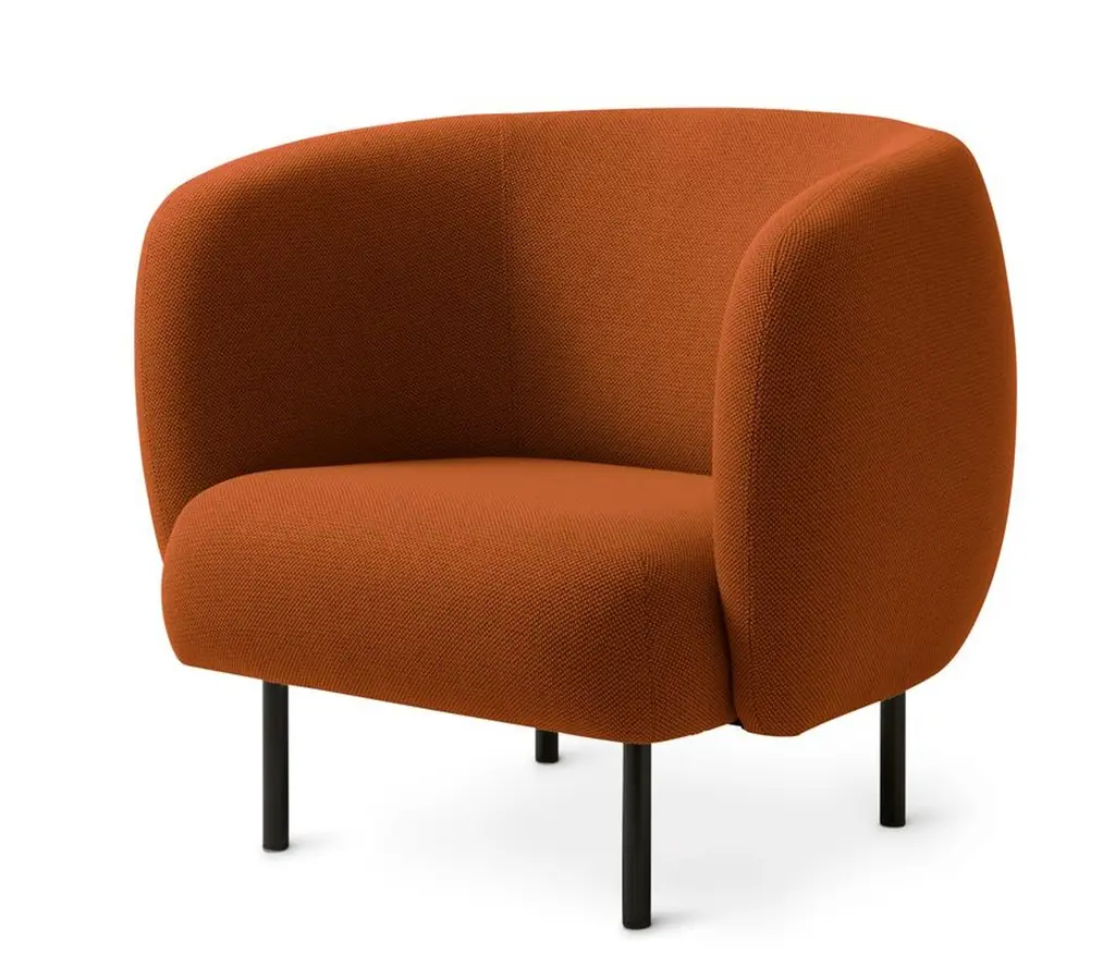 Cape Lounge chair Terracotta by Warm NordicDimensions: D90 x W82 x H 80 cmMaterial: Textile upholstery, Wooden frame, Powder coated black steel legsWeight: 34.5 kgAlso available in different colours and finishes. An elegant armchair with an organic design inspired by the puffed sleeves and layered designs of haute couture. Its soft lines and chic details make the Cape armchair a real eye-catcher. The chair is lovely to sit in, maybe even more so when accompanied by the sofa from the same range. Both items of furniture are available with or without visible stitching. In the Cape armchair's simple, yet rich design there lurks a detailed aesthetic and an implicit sensuousness. The Cape range is covered with exclusive furnishing fabrics, including 'Hero', whose soft, almost felt-like surface complements the armchairs organic shape, and which is designed by Patricia Urquiola.Warm Nordic is an ambitious design brand anchored in Nordic design history and with a timeless, aesthetic style that inspires you to appreciate the little things in life. The company is the result of several years’ intense work on developing a new design brand with design history, quality and personality at its core. Warm Nordic boasts a colourful and charming universe of furniture, lamps and accessories full of personality. Our designs encapsulate the Nordic spirit, which in its essence is timeless, inclusive and warm.