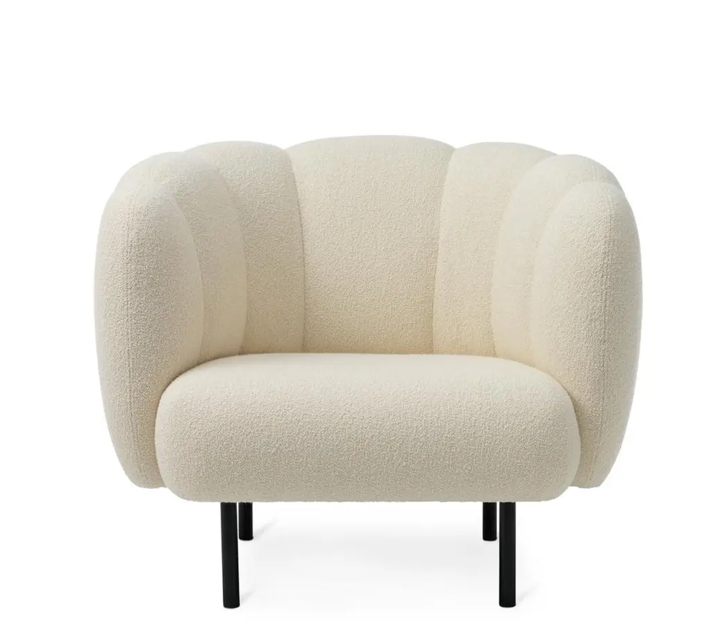 Cape Lounge chair with stitches cream by Warm NordicDimensions: D95 x W84 x H 80 cmMaterial: Textile upholstery, Wooden frame, Powder coated black steel legsWeight: 36.5 kgAlso available in different colours and finishes.An elegant armchair with an organic design inspired by the puffed sleeves and layered designs of haute couture. Its soft lines and chic details make the Cape armchair a real eye-catcher. The chair is lovely to sit in, maybe even more so when accompanied by the sofa from the same range. Both items of furniture are available with or without visible stitching. In the Cape armchair's simple, yet rich design there lurks a detailed aesthetic and an implicit sensuousness. The Cape range is covered with exclusive furnishing fabrics, including 'Hero', whose soft, almost felt-like surface complements the armchairs organic shape, and which is designed by Patricia Urquiola.Warm Nordic is an ambitious design brand anchored in Nordic design history and with a timeless, aesthetic style that inspires you to appreciate the little things in life. The company is the result of several years’ intense work on developing a new design brand with design history, quality and personality at its core. Warm Nordic boasts a colourful and charming universe of furniture, lamps and accessories full of personality. Our designs encapsulate the Nordic spirit, which in its essence is timeless, inclusive and warm.