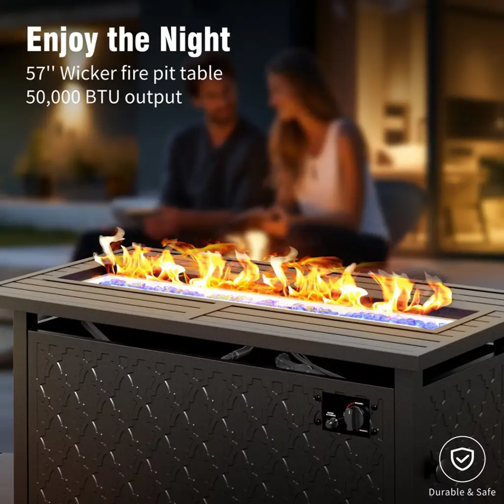 Enhance your outdoor sanctuary with this stylish and modern sofa set. The sleek black metal frame and diamond-patterned open-back design provide a sophisticated touch. Enjoy spacious, deep seating with cushions that offer both support and relaxation for extended lounging. The adjustable flame gas fire table creates a warm and inviting atmosphere, perfect for cozy evenings. Constructed with durable, weather-resistant materials, this set is built to endure all seasons, providing lasting beauty and comfort in your outdoor space.Specification:Single sofa: 31.5''W*28.3''L*35''HFire pit table: 28.5"W*28.5"L*25"HWeight Capacity of Armchair: 350 lbsCompatible with a standard 20lb propane tank (not included)