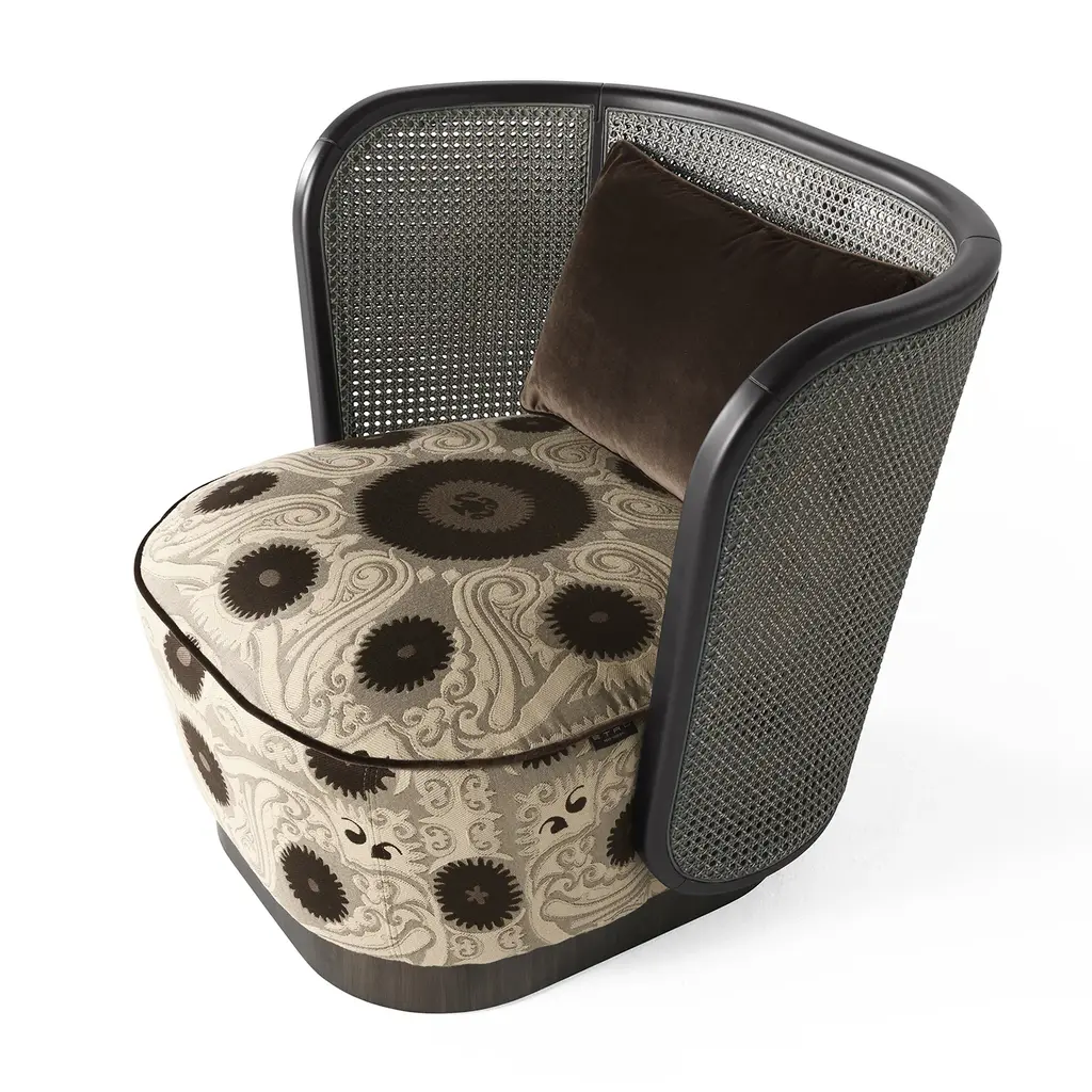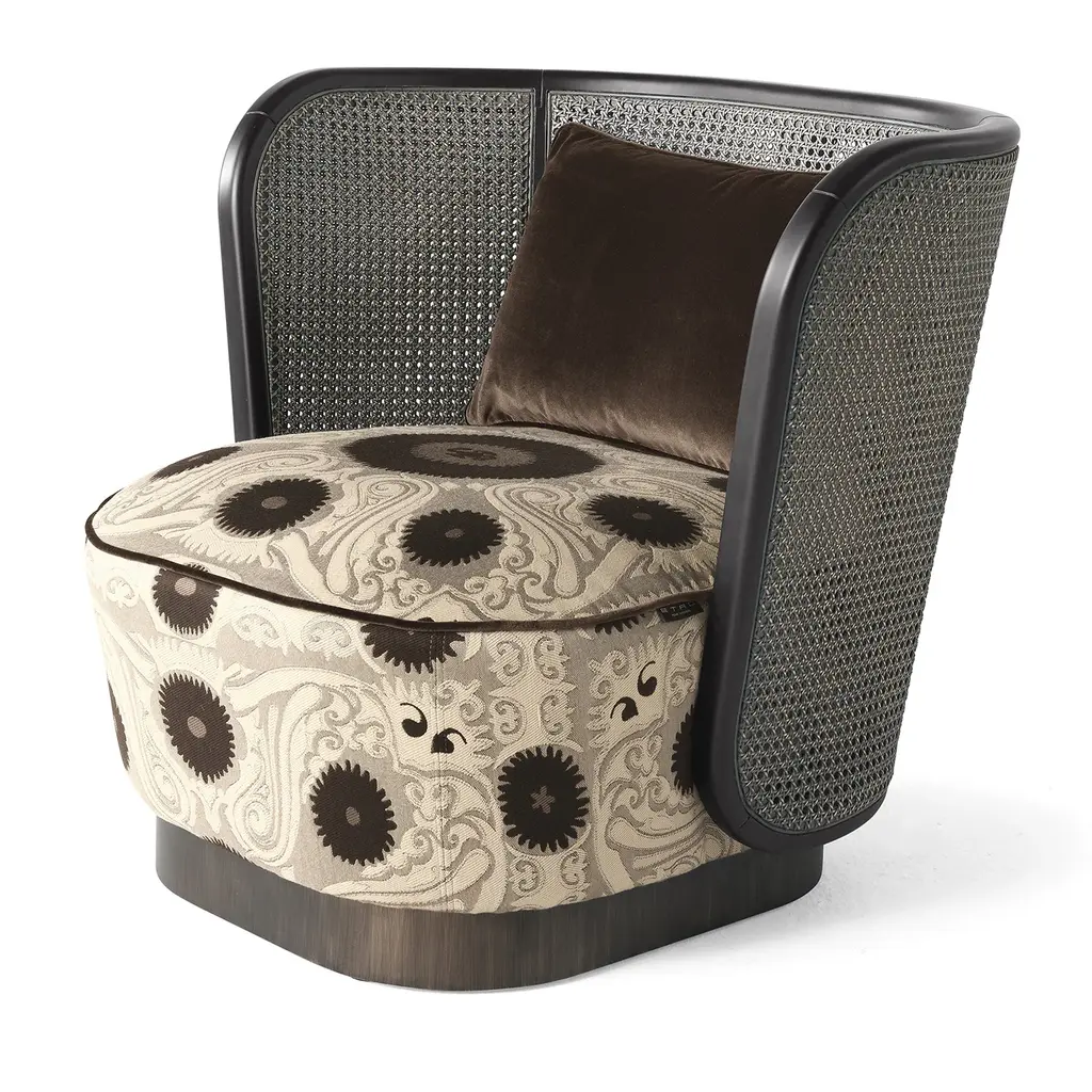 An armchair with soft and enveloping lines, whose low and comfortable seat recalls in the shape the exoticism of a traditional ottoman. The upholstery in jacquard fabric Bukhara with Suzani pattern creates a harmonious contrast with the lightness of the fan-shaped caned backrest with an intense cherry red color. Back frame in dark wengè dyed wood with Cherry Red lacquered cane. Seat in foam upholstered in fabric cat. A Bukhara col. 1 Nomad. Piping in velvet cat. A Firenze col. 1 Raisin. Base in patinated bronze wood. Included cushion set 1 L 50 D 30 Fabric cat. A Firenze col. 1 Raisin. Please ask the Concierge for customization options.