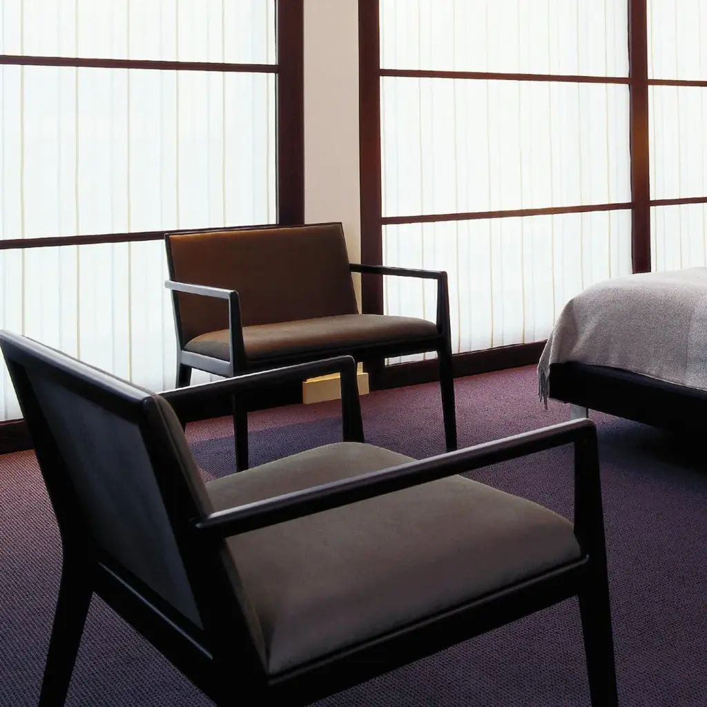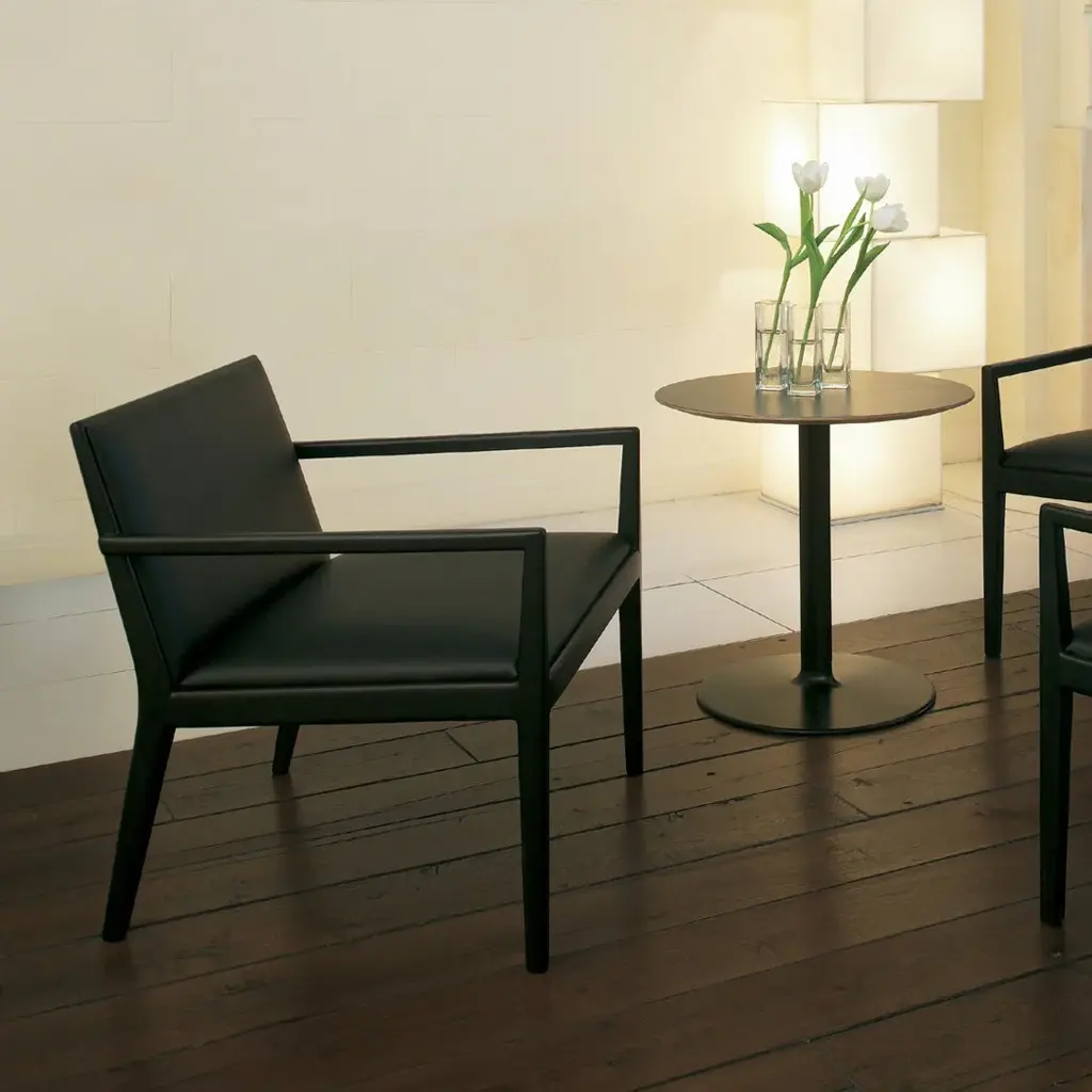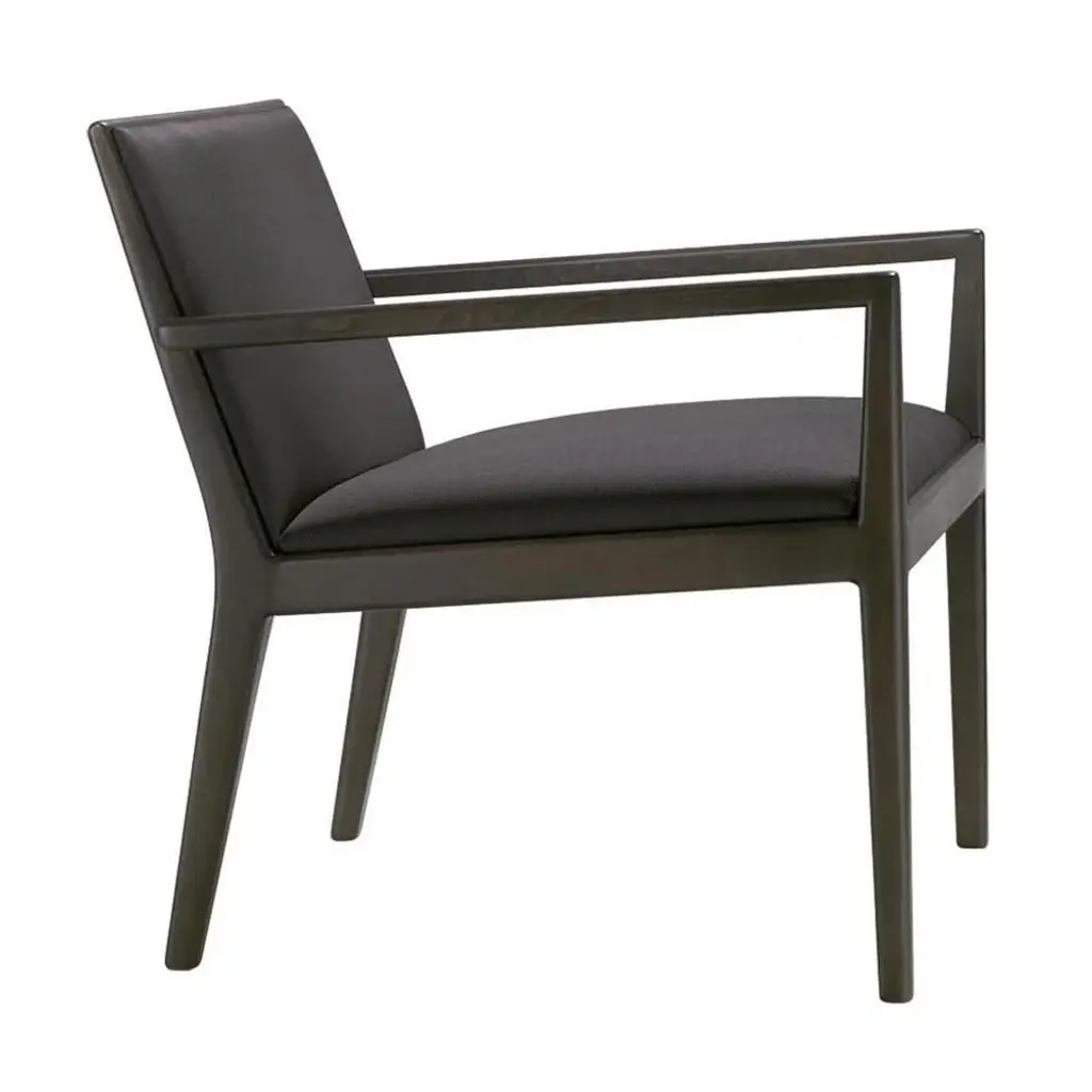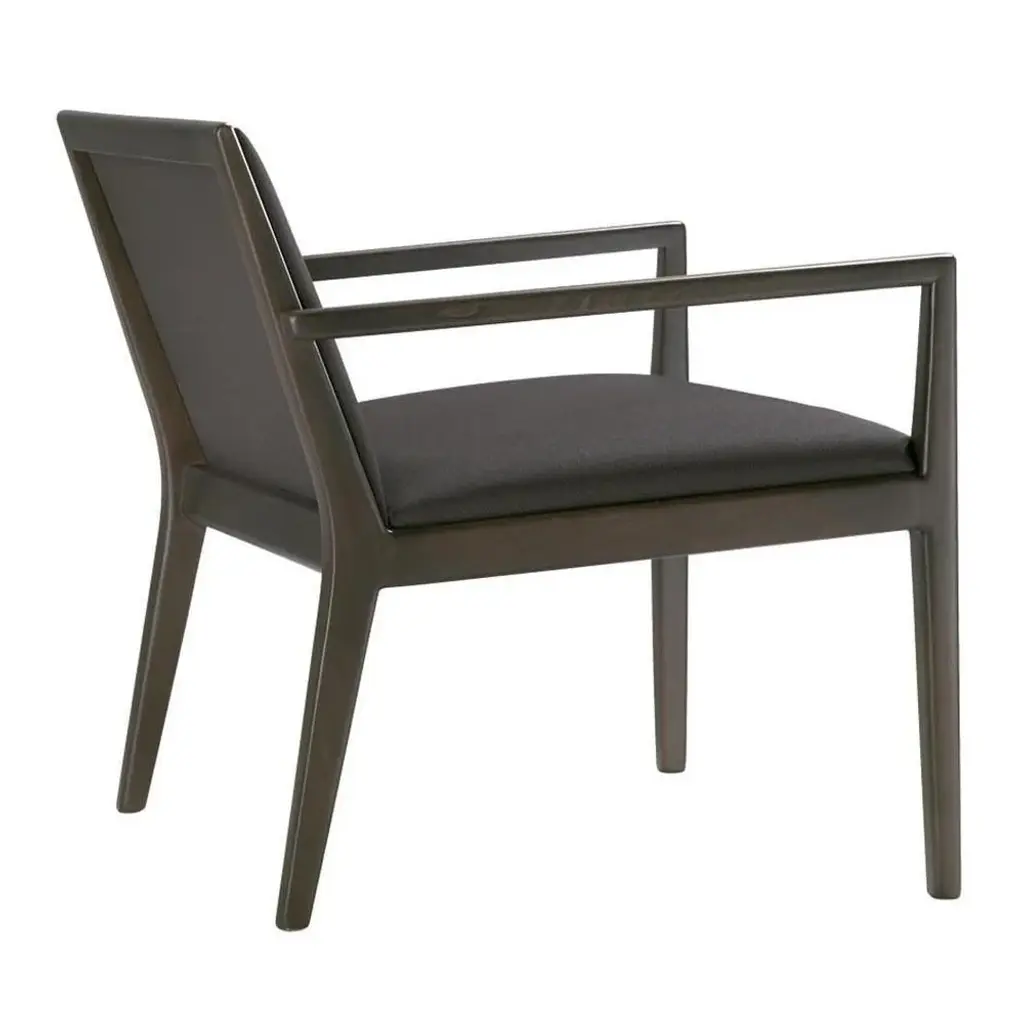 Lounge chair with arms. Upholstered seat and backrest and solid beech frame.In all of its versions, Carlotta is inviting and resilient. This timeless design is noted for its versatility in both contract and residential applications for its simple, classic lines. It is offered with two different backrest heights.