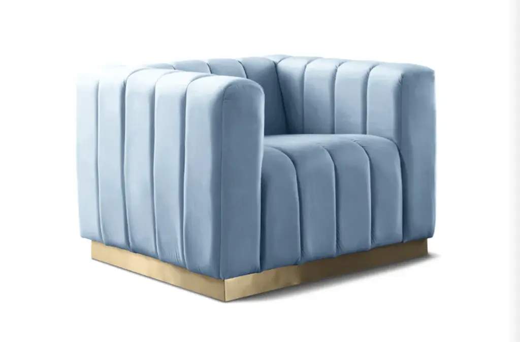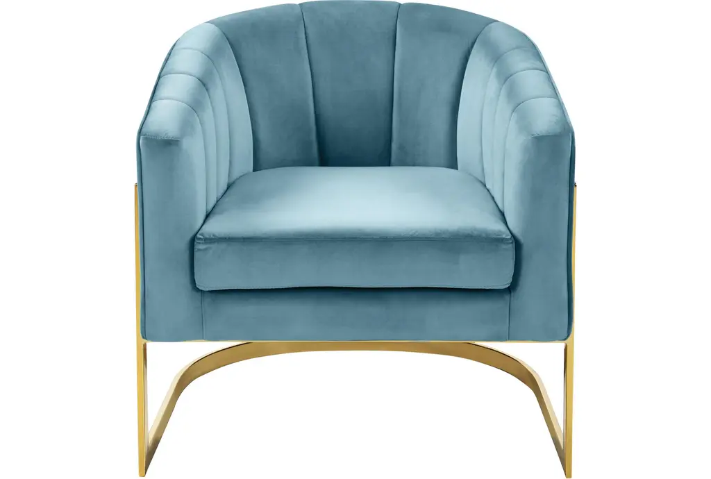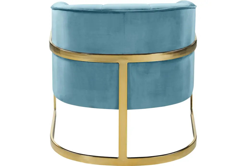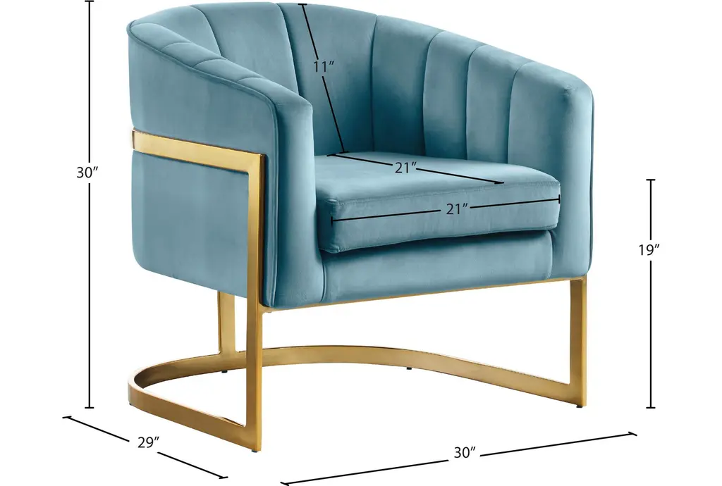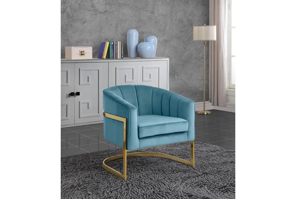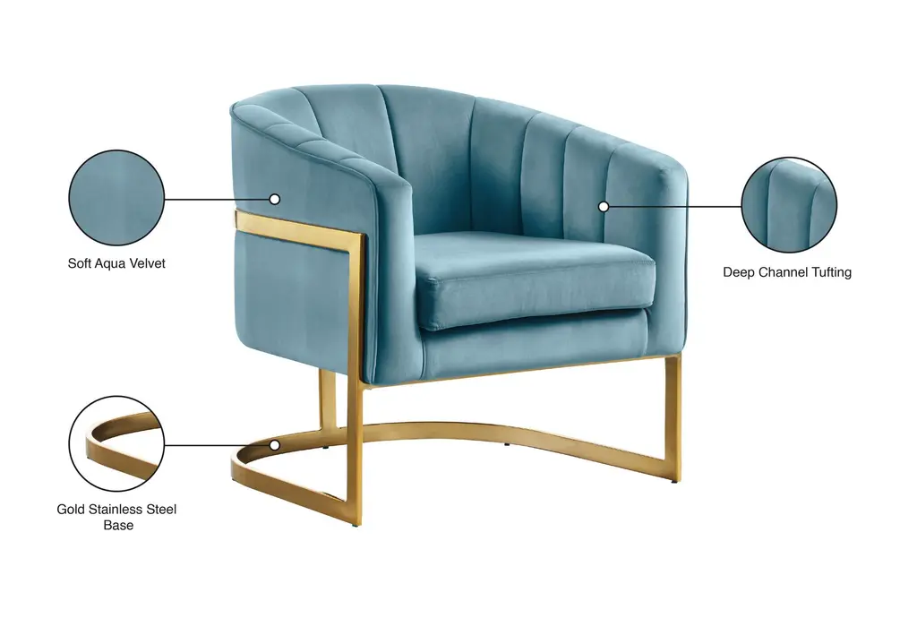 The Carter Aqua Blue Velvet Accent Chair combines modern design with luxurious comfort. Featuring plush velvet upholstery, this chair is perfect for adding a pop of color and style to any living room or vanity space. Its unique shape and golden metal legs make it a standout piece that complements various decor styles.