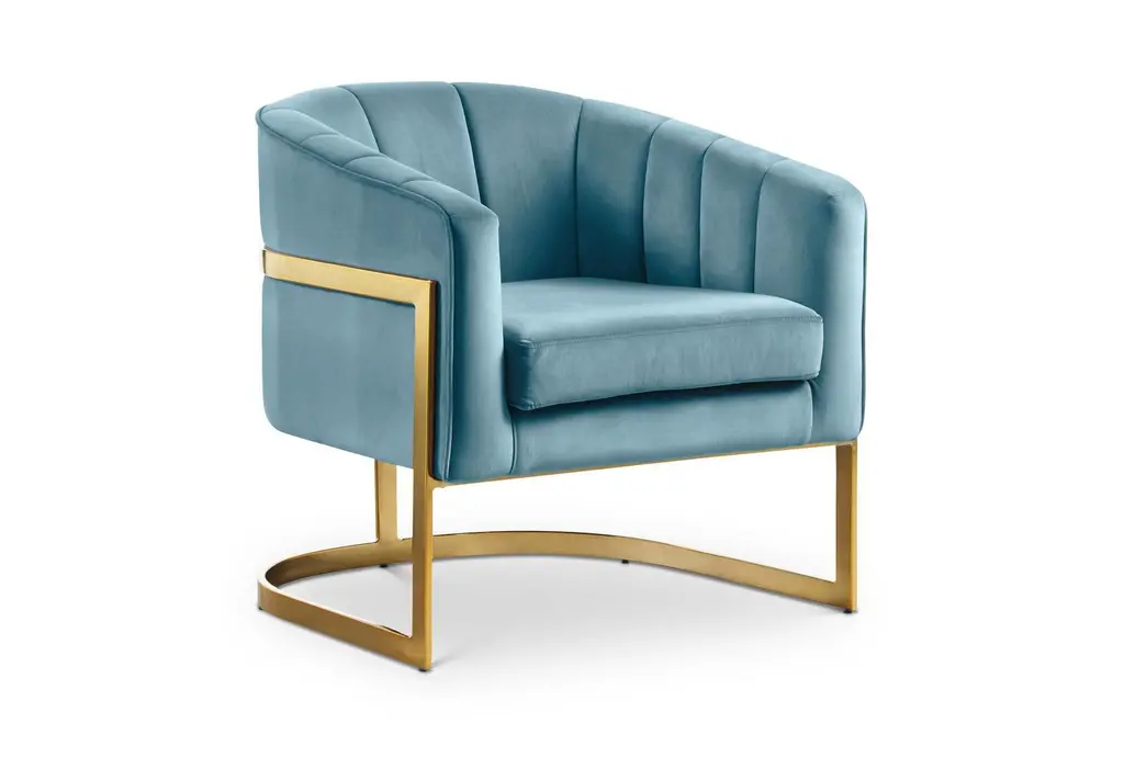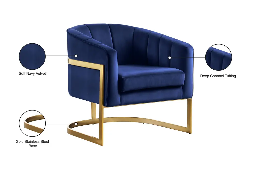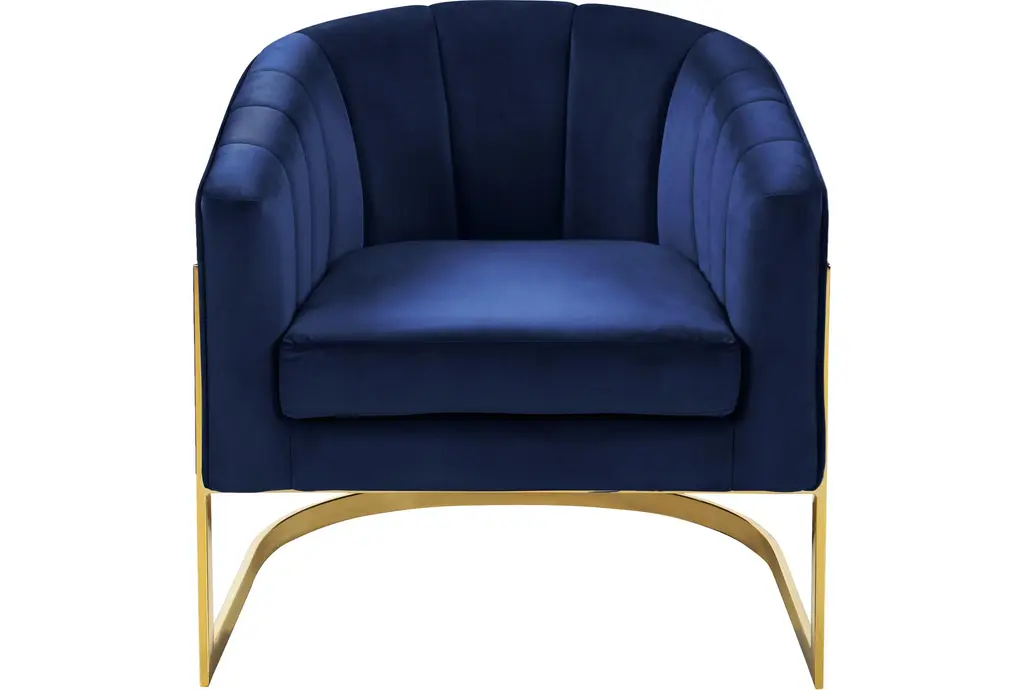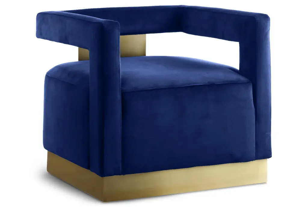 The Carter Navy Blue Velvet Accent Chair is a stunning addition to any living room. Its modern design and rich navy color make it a standout piece. The velvet fabric provides a luxurious feel, while the arms offer added comfort.