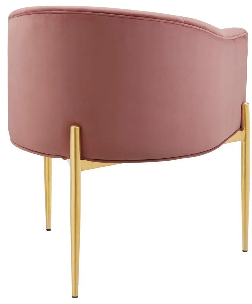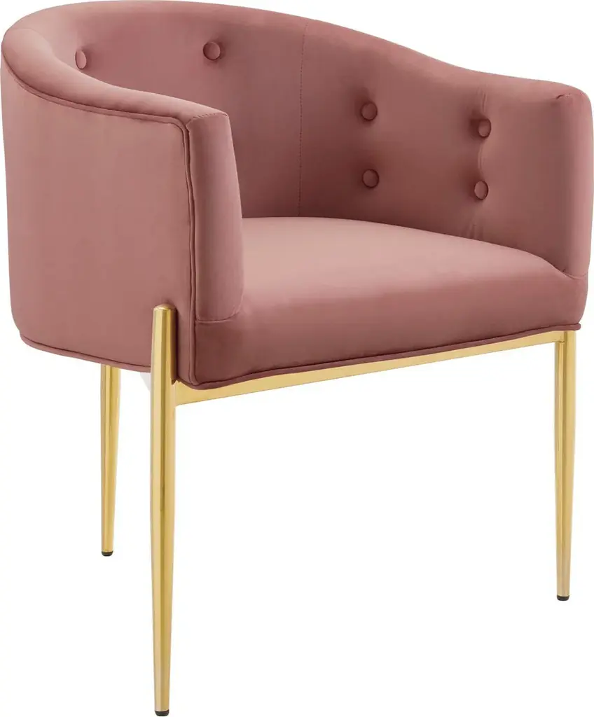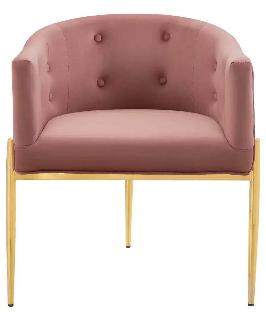 The Cascade Accent Chair from Evans & Londeen would be a great glam addition to your home. The design of this glam piece makes it a statement piece for years to come. The quality paired with the premium finish makes for a quality piece of furniture.Tufted Accent ChairStain-Resistant Performance VelvetGold Stainless Steel LegsDense Foam PaddingChair Weight Capacity: 300 Lbs.Seat Height: 19