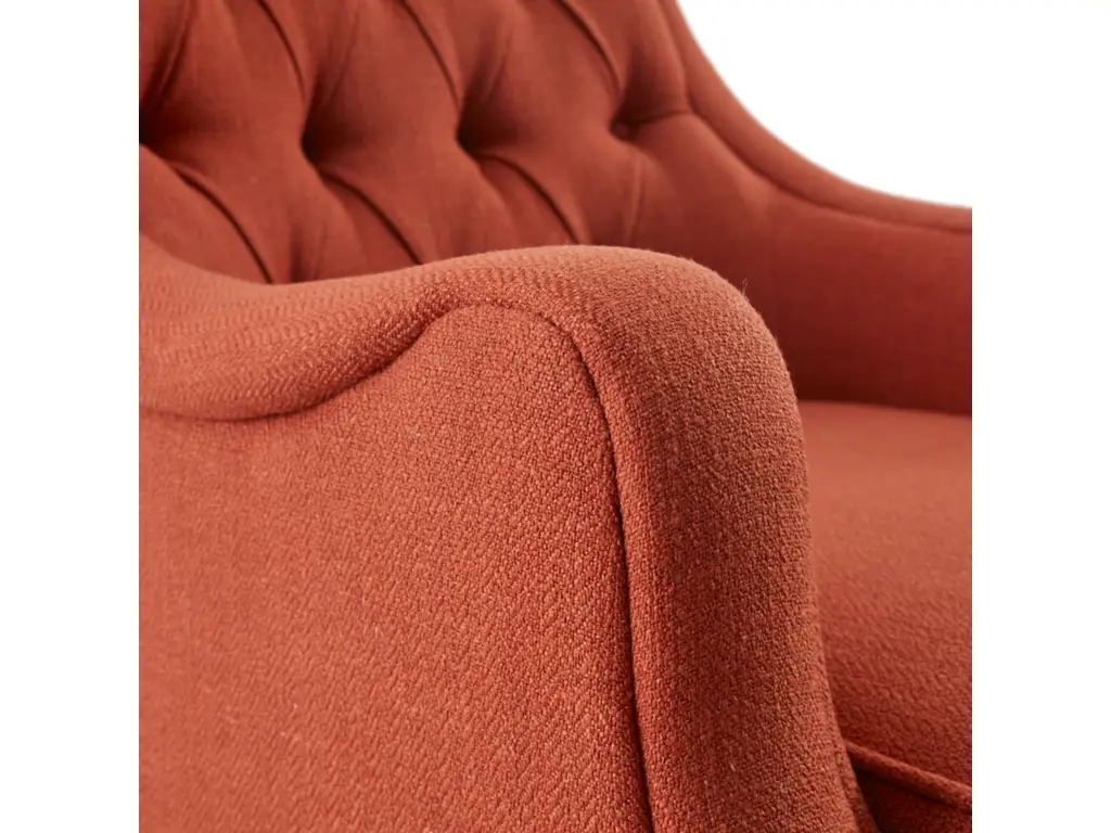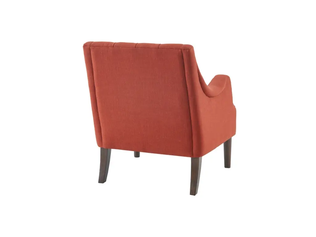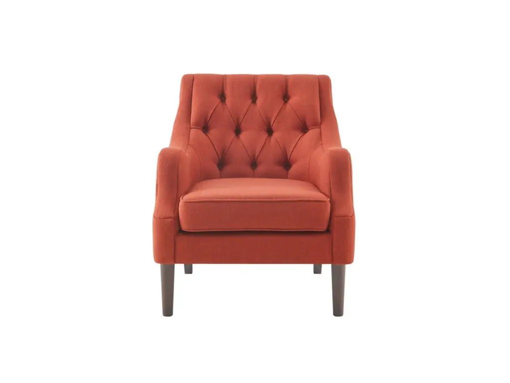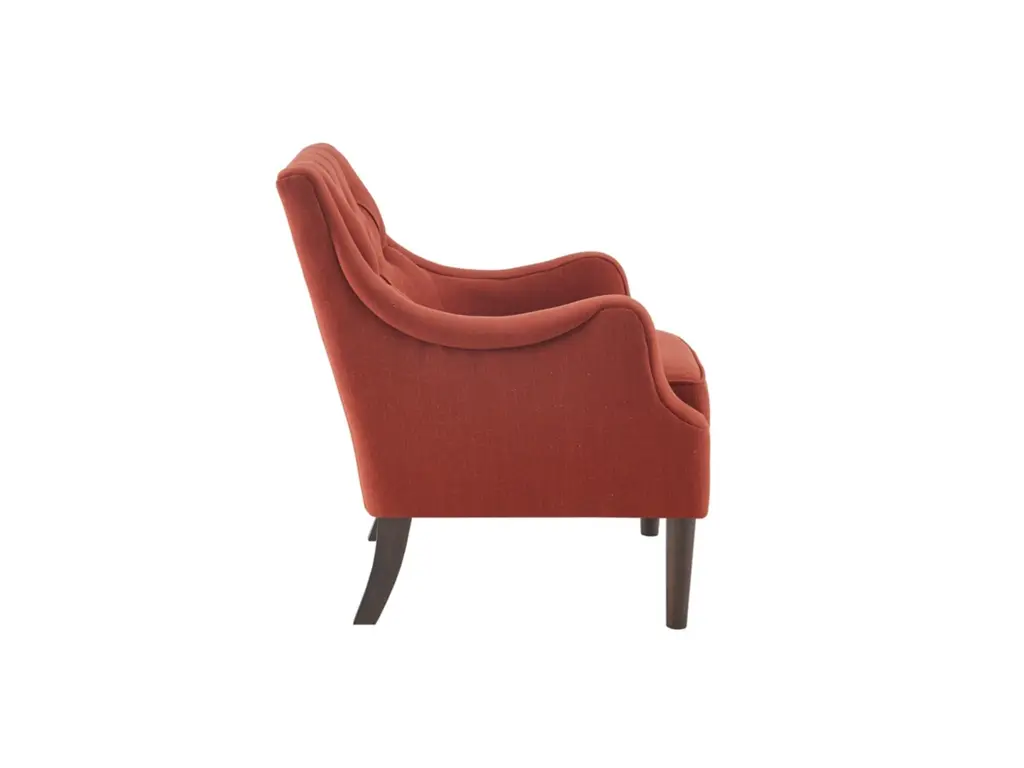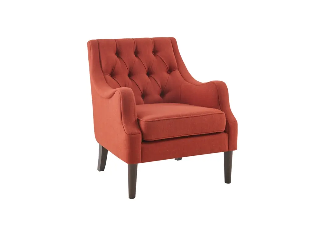 Grace your living room with the Madison Park Qwen Button Tufted Chair. This vintage inspired frame features sweeping serpentine arms and deep button tufting to create a soft diamond accent. The tight back chair is upholstered in a vibrant spice fabric. It is elevated on elegantly tapered solid wood legs in espresso finish. Leg assembly required.