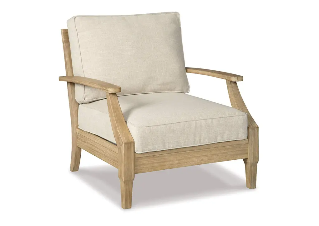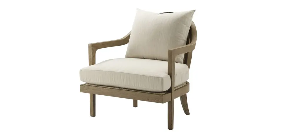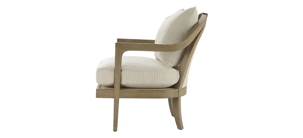 The Catalina accent chair is made of solid oak with brown leather cord wrapped around the exposed wood back. Comfortable loose seat cushion and back pillow are both upholstered in Fawn fabric.