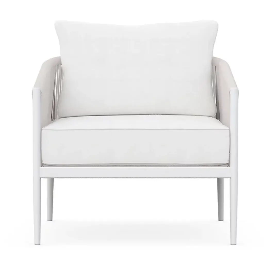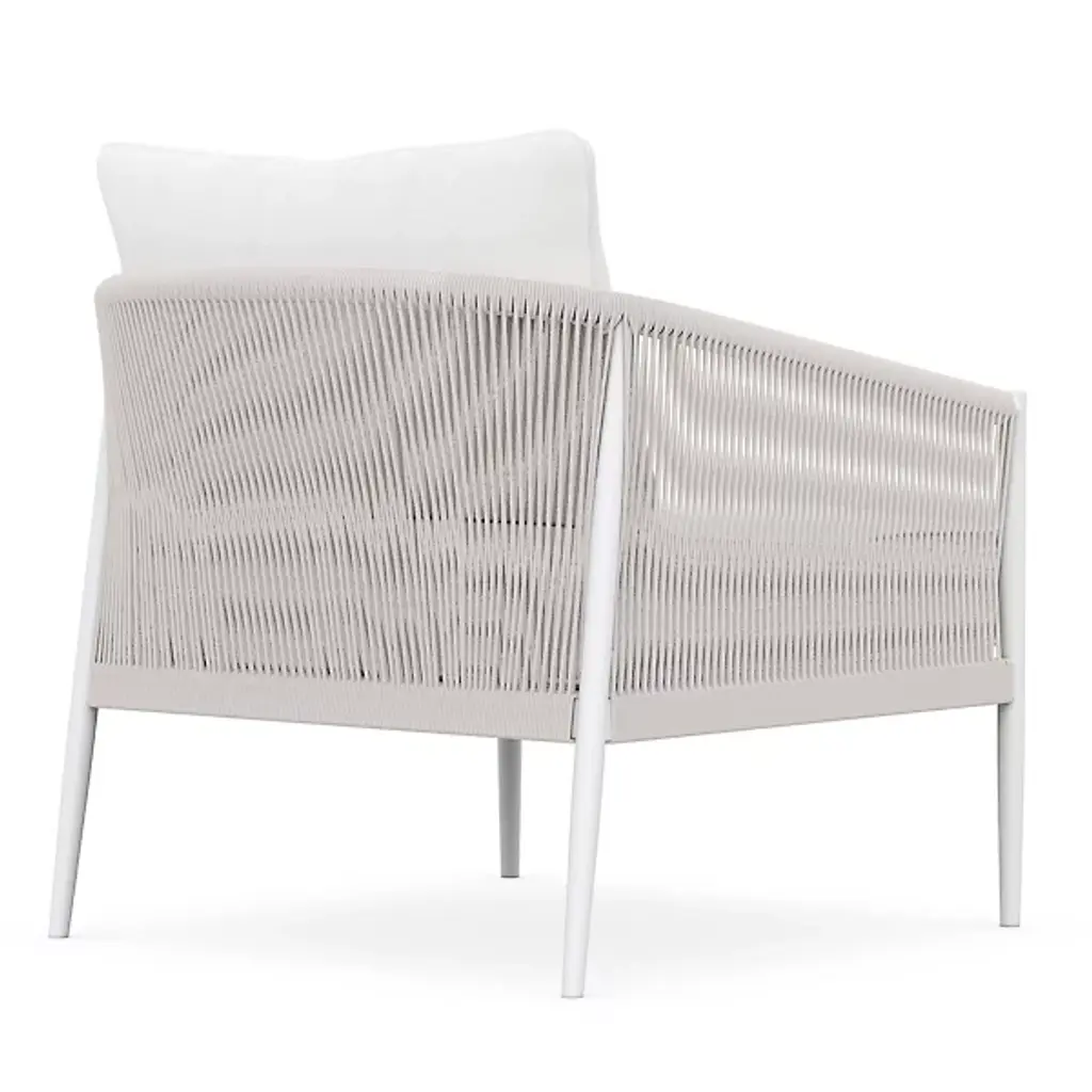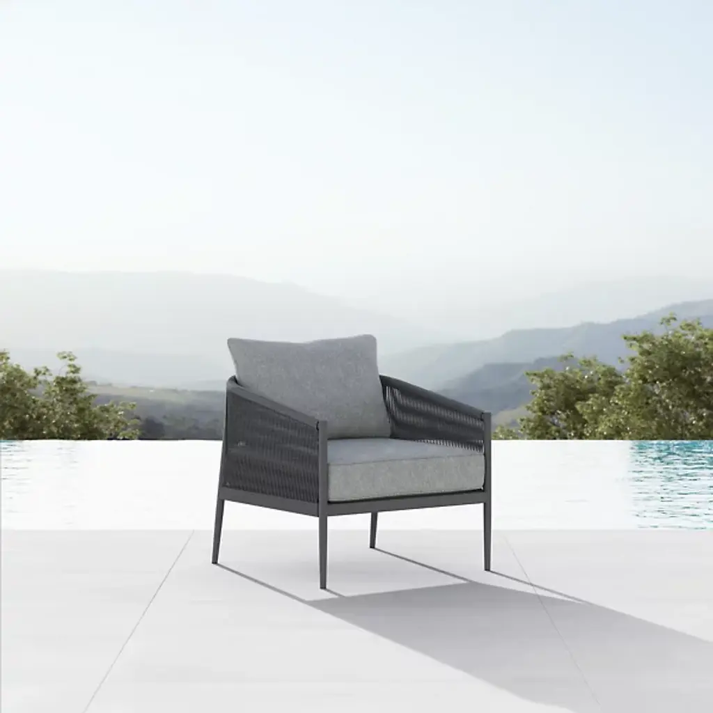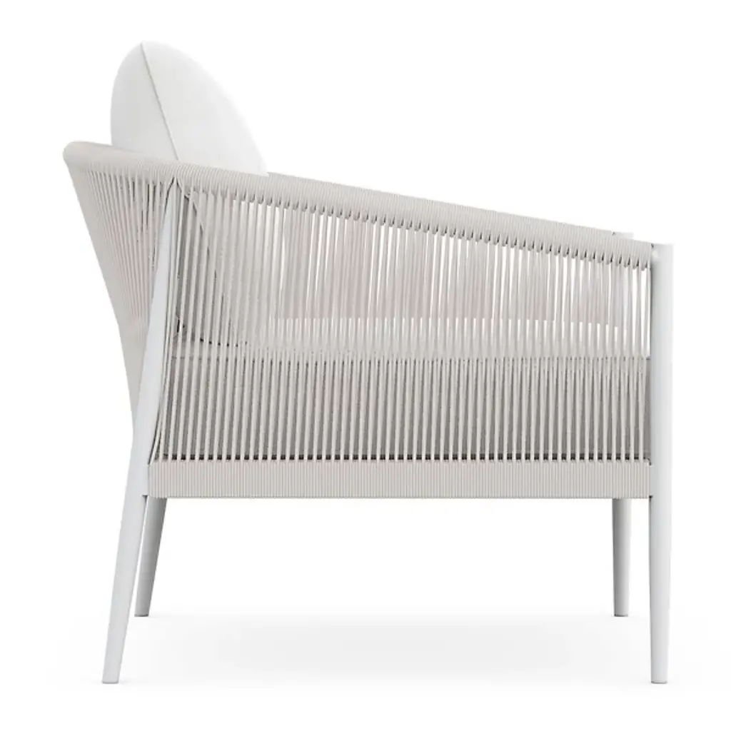 Bring a stately, enduring appeal to interior spaces with the clever and coastal Catalina Outdoor Club Chair from Azzurro Living. A powder-coated aluminum frame offers steady support, contrasting rounded legs, and a curving back with a squared-off seat. Interwoven strands of all-weather rope fill in the empty space between the arms and the seat, while a deep seat cushion and plush back pad of high-density foam provide ample padding, enclosed within a strong synthetic Solvita fabric able to keep its color amid rain and sun and years of use.