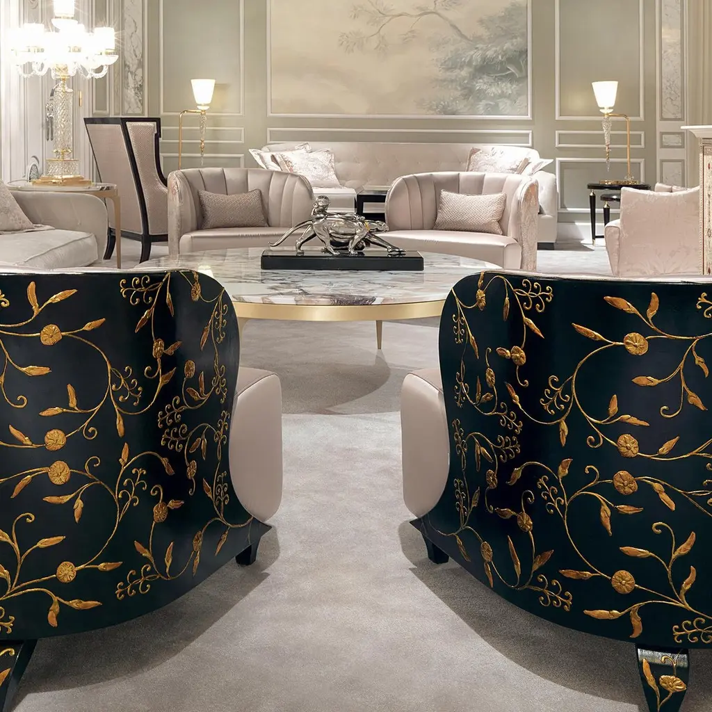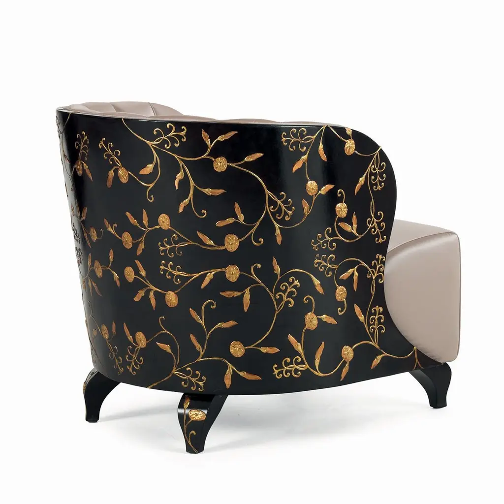 This elegant armchair is a timeless objet d'art that will enrich the decor of a classic or contemporary home. Either in an entryway or living room, this chair can be displayed against a wall or in the center of a room, thanks to the stunning decoration that graces its enveloping back with relief details in gypsum. The structure is in wood as the feet, which are painted by hand in the same motif as the back. The seat and back/armrest cushions are in hypoallergenic polyurethane covered in an elegant grey fabric. The decorative pillow is included.