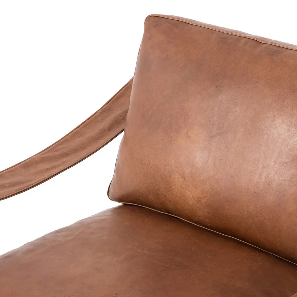 The classic sling chair gets a grand, elevated look. Solid wood frame is shaped, curved and smoothed on all edges. Cushioned seat and back are upholstered in top-grain leather. Sourced from one of the oldest family-owned tanneries in Italy's Bassano del Grappa, heirloom leather is salvaged and processed from upcycled hides featuring an abundance of natural markings, scars and color variations. The result? Beautifully supple, buttery soft hides with an unmatched depth of color and richness, and an authentic lived-in look. Ships In 10-14 Business Days In Stock Early December Classic sling design Top grain leather This image is for illustrative purposes only. The colors shown are accurate within the constraints of lighting, photography, and the color accuracy of your screen.