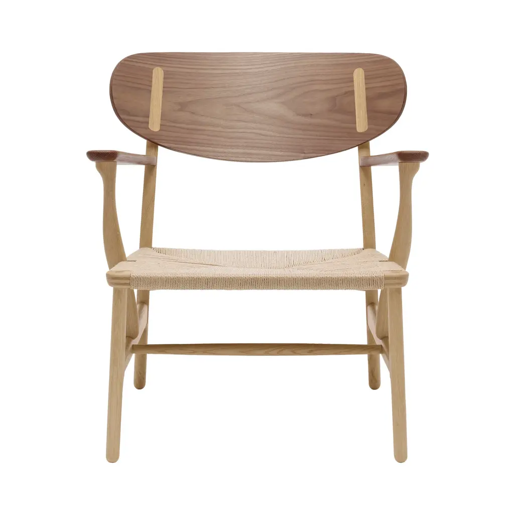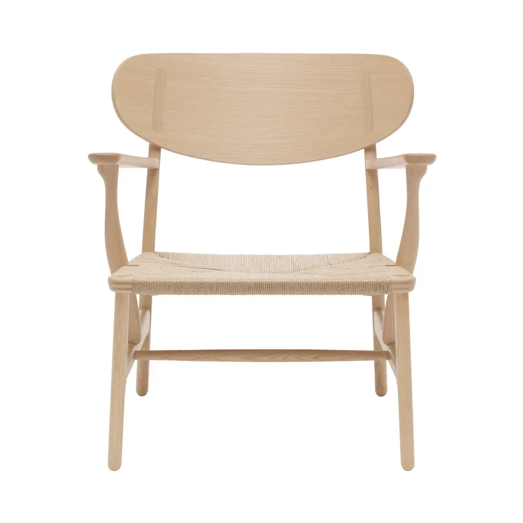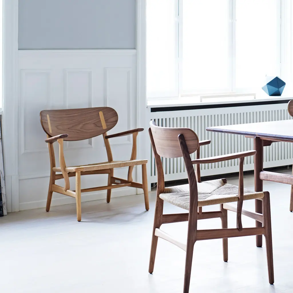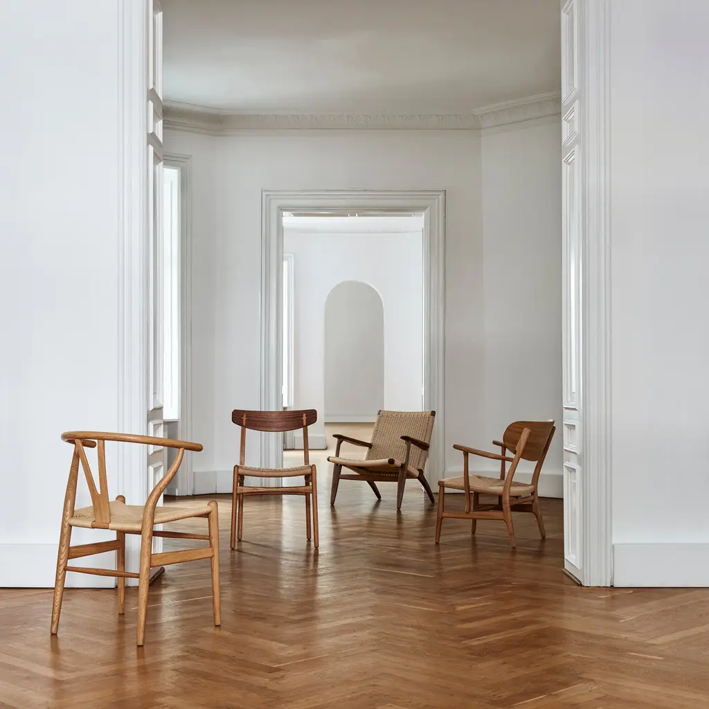 Alongside his Iconic Wishbone Chair, Hans J. Wegner’s low lounge chair with a seat in paper cord instead of upholstery was part of his 1950 debut collection for Carl Hansen & Søn. In solid wood, CH22 features a comfortably angled backrest in form-pressed veneer, providing absolute comfort. Sublime craftsmanship distinguishes the woven seat and refined joinery and the seating is offered in oak, walnut and a mix version with frame in oak and armrest-backrest in walnut, all with an optional leather cushion.