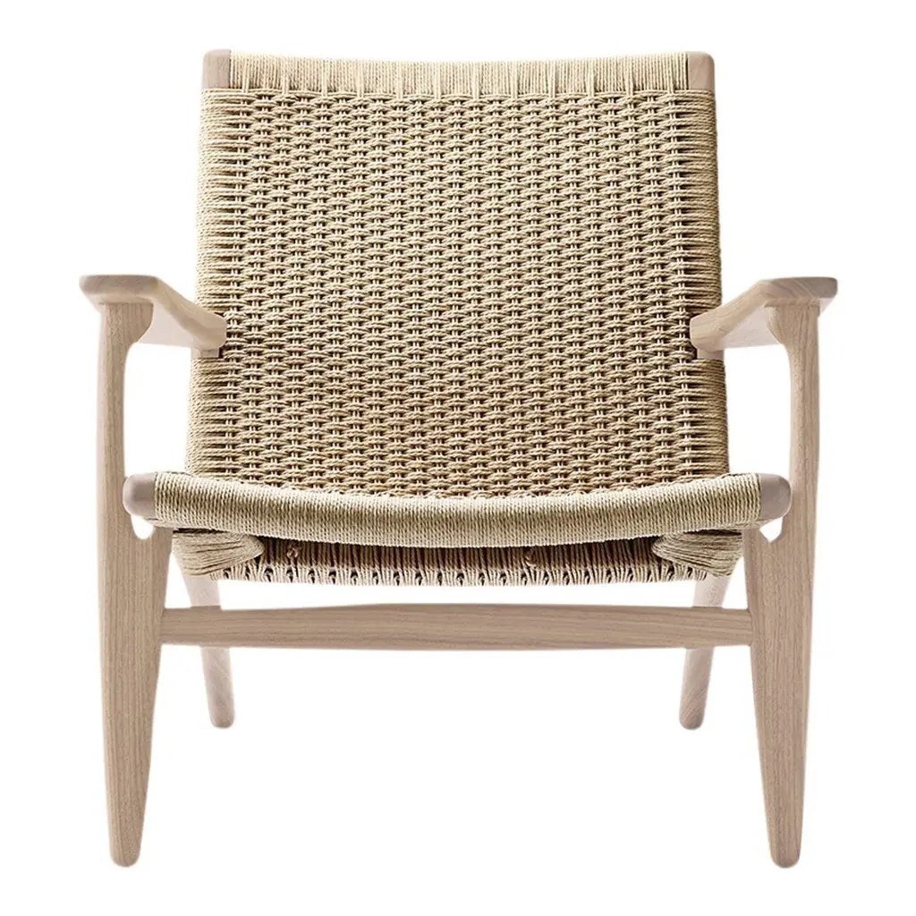 Hans J. Wegner's CH25 Easy Chair's special leg profile probably give this Wegner classic chair its most distinctive feature. The broad armrests add to the comfort of the CH25 chair and make this Wegner chair easy to get up from, even with its low seating and reclining back. Skilled weavers used over 400 meters of paper cord to make the distinctive pattern on the pack of the Wegner CH25 Easy Chair.