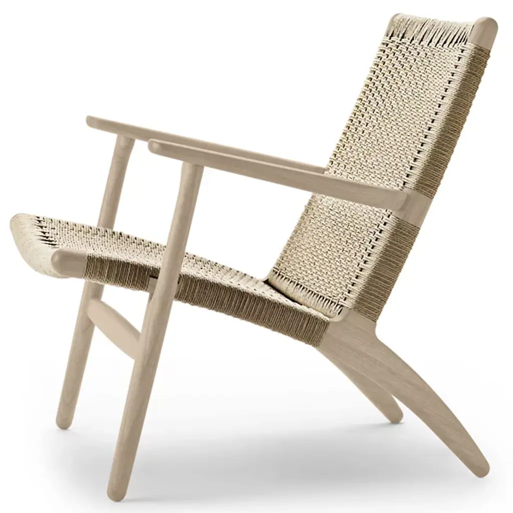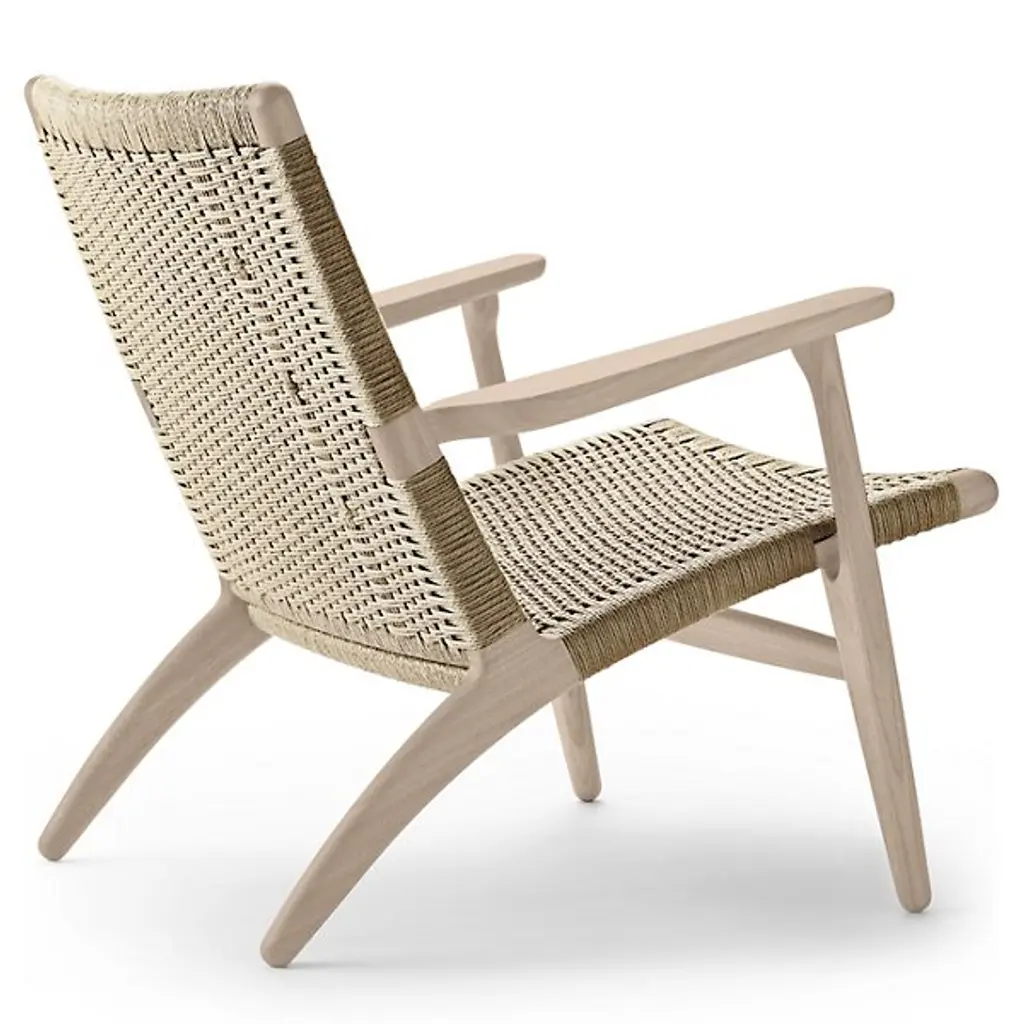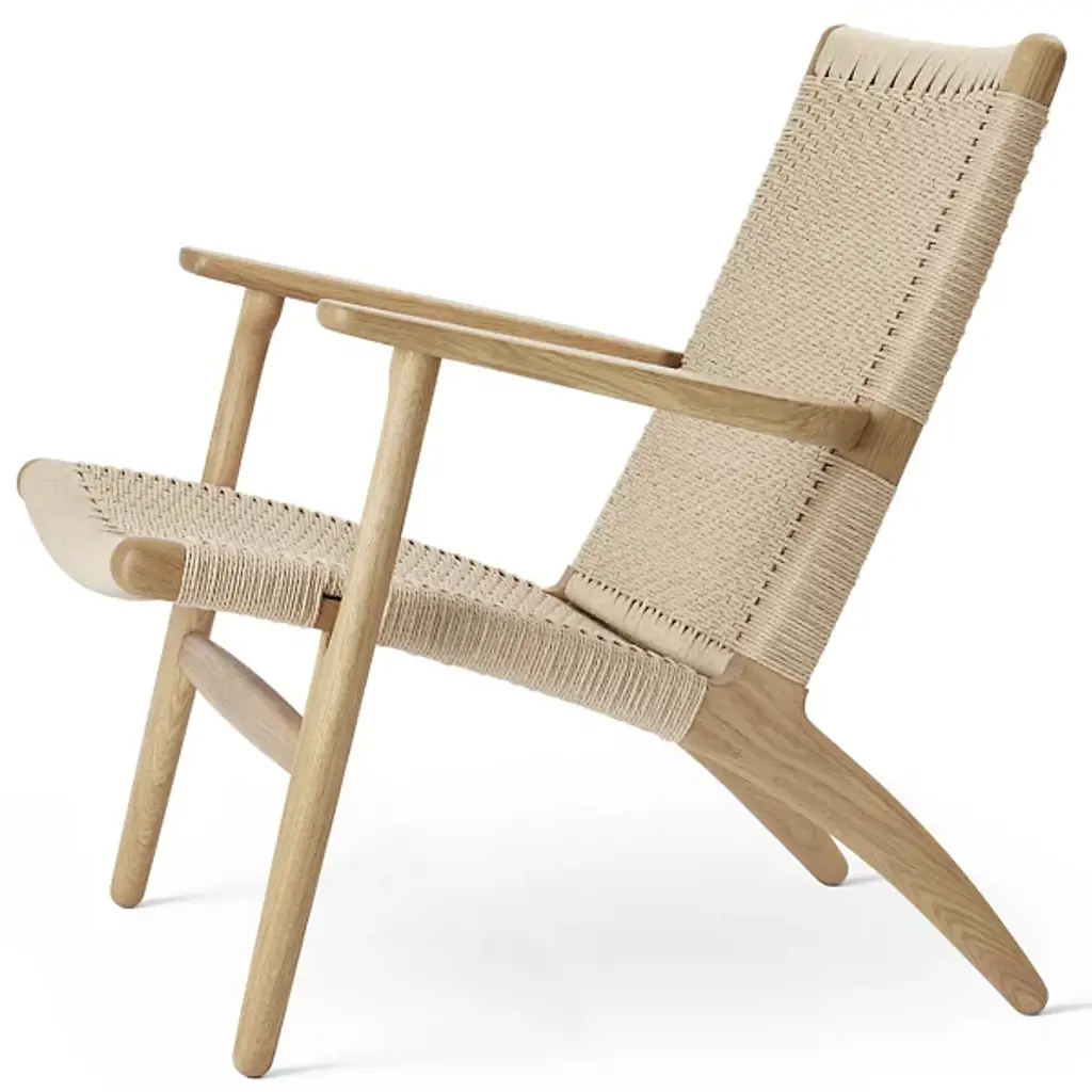 The Carl Hansen CH25 Lounge Chair is the ultimate expression of designer Hans J. Wegner's use of woven paper cord. The material is lightweight, yet exceptionally strong and comfortable. More than 400 meters of it are used to weave the back and seat around the frame. The design itself is dynamic and light-looking, with tapered oak legs and a slightly backward tilt.