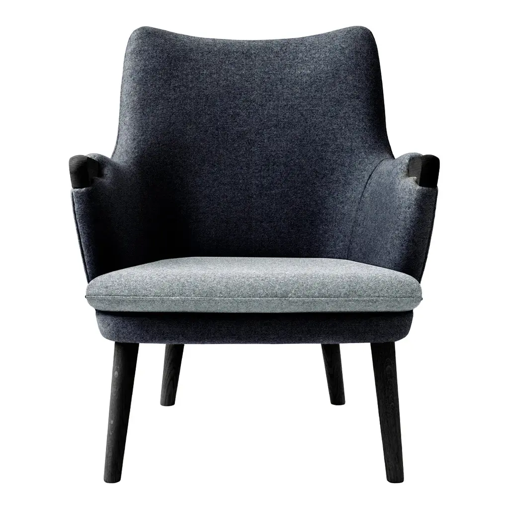 The CH71 lounge chair and CH72 sofa are characterized by a slim, fully upholstered frame, loose cushions, and round, tapered legs in solid wood.