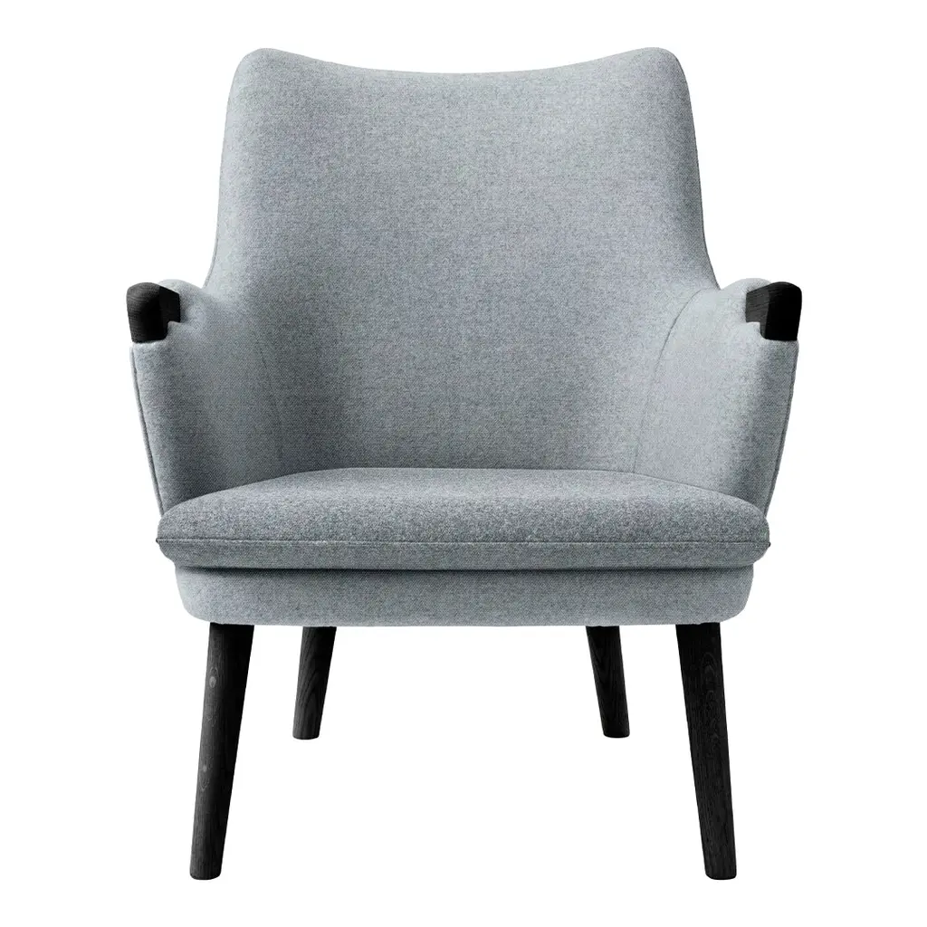The CH71 lounge chair and CH72 sofa are characterized by a slim, fully upholstered frame, loose cushions, and round, tapered legs in solid wood.