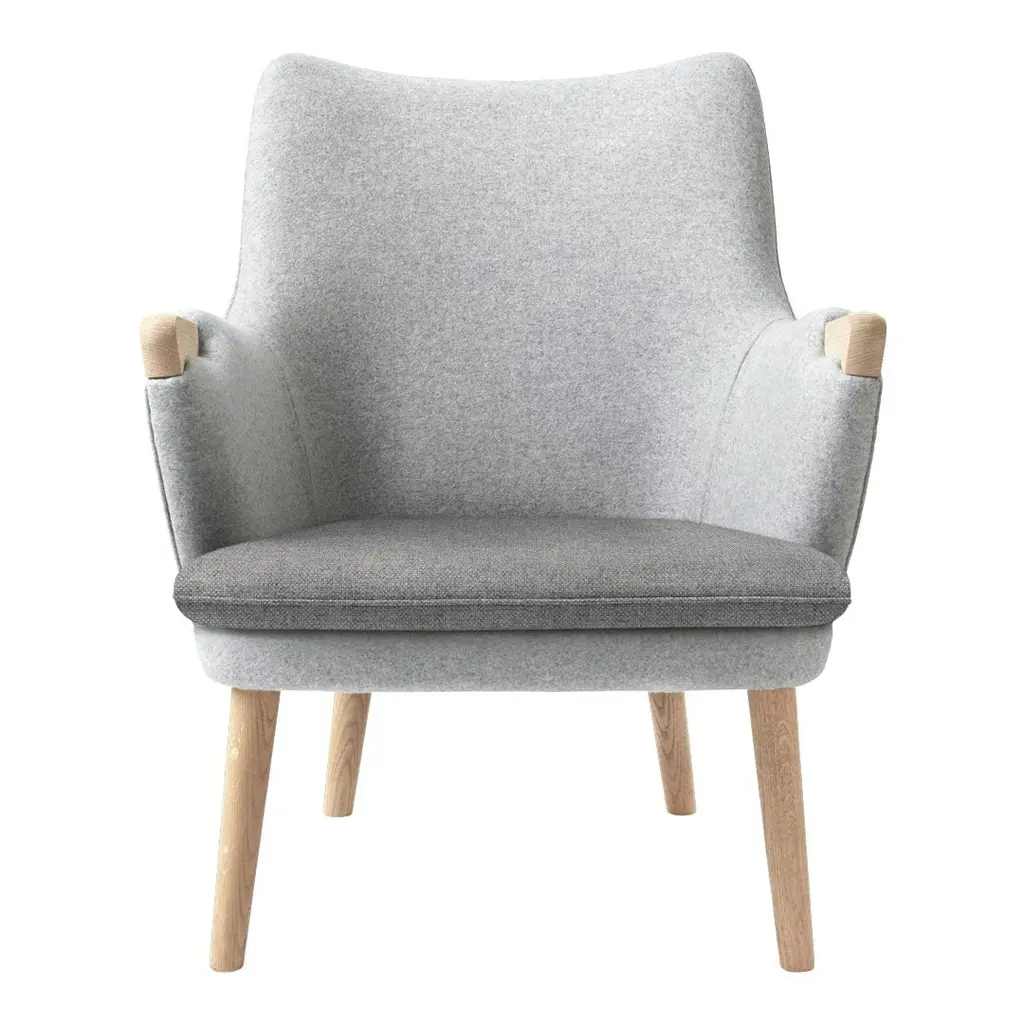 The CH71 lounge chair and CH72 sofa are characterized by a slim, fully upholstered frame, loose cushions, and round, tapered legs in solid wood.