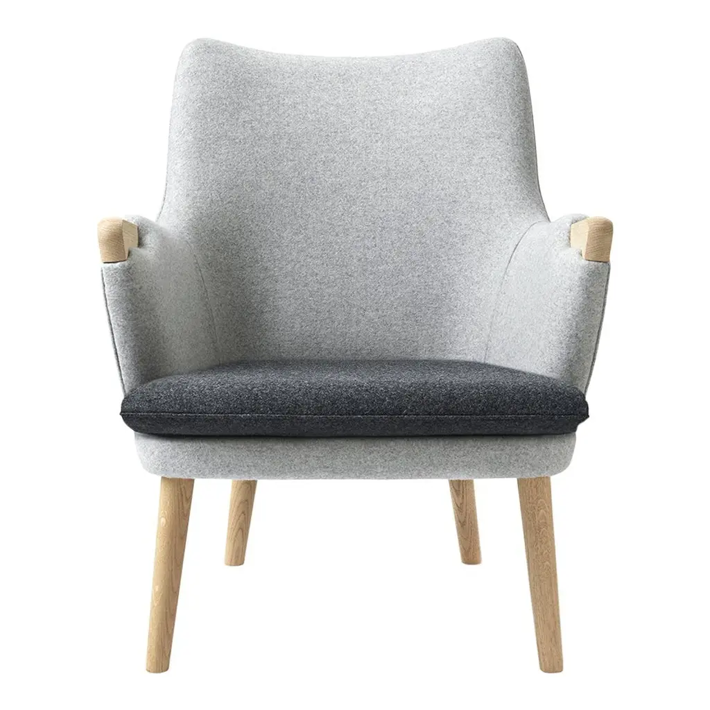 The CH71 lounge chair and CH72 sofa are characterized by a slim, fully upholstered frame, loose cushions, and round, tapered legs in solid wood.
