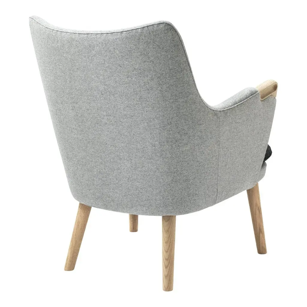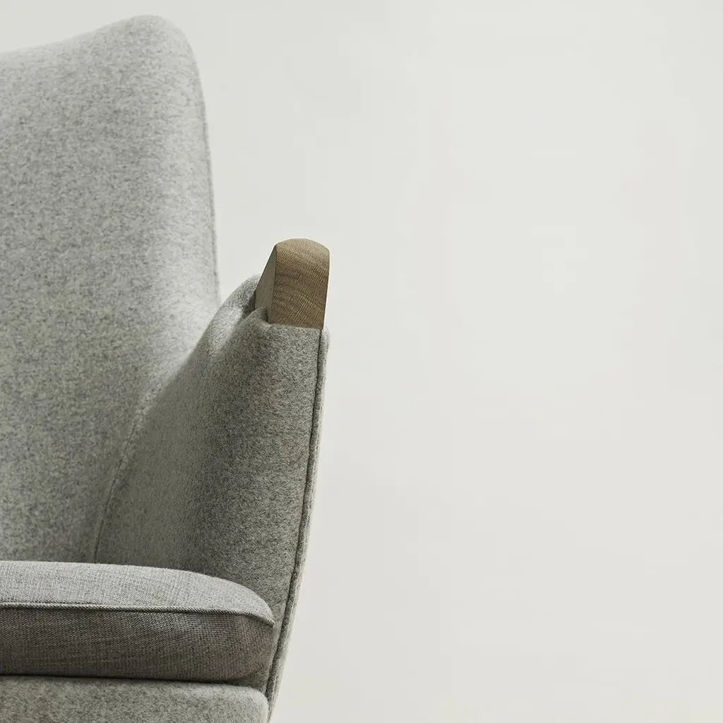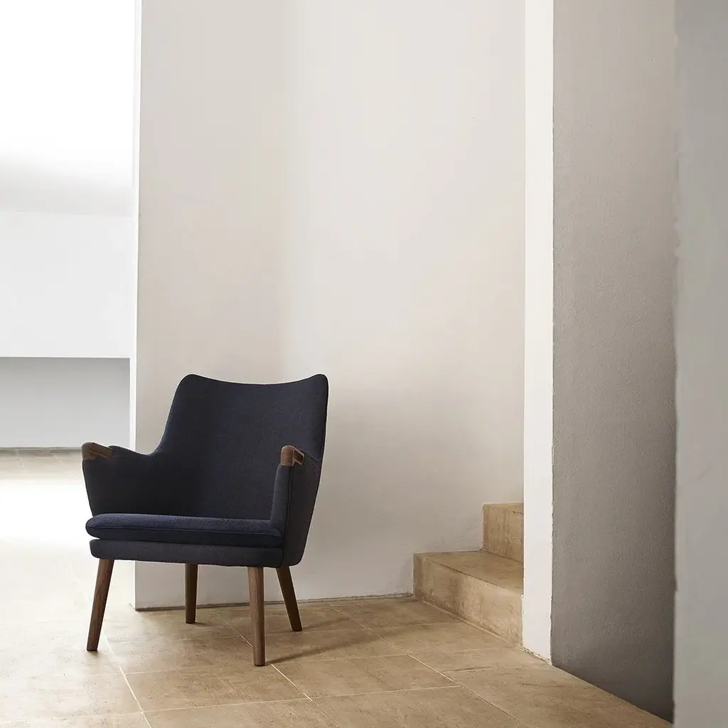 The CH71 lounge chair and CH72 sofa are characterized by a slim, fully upholstered frame, loose cushions, and round, tapered legs in solid wood.