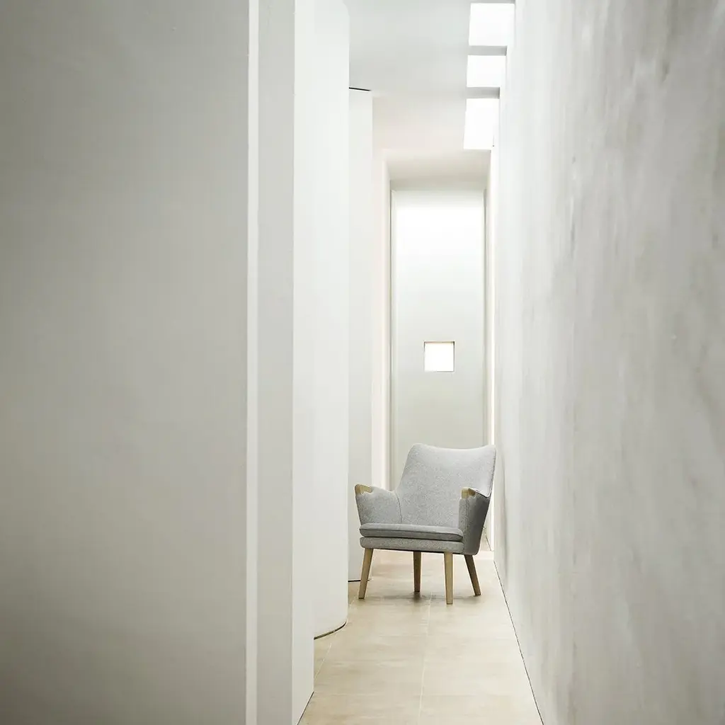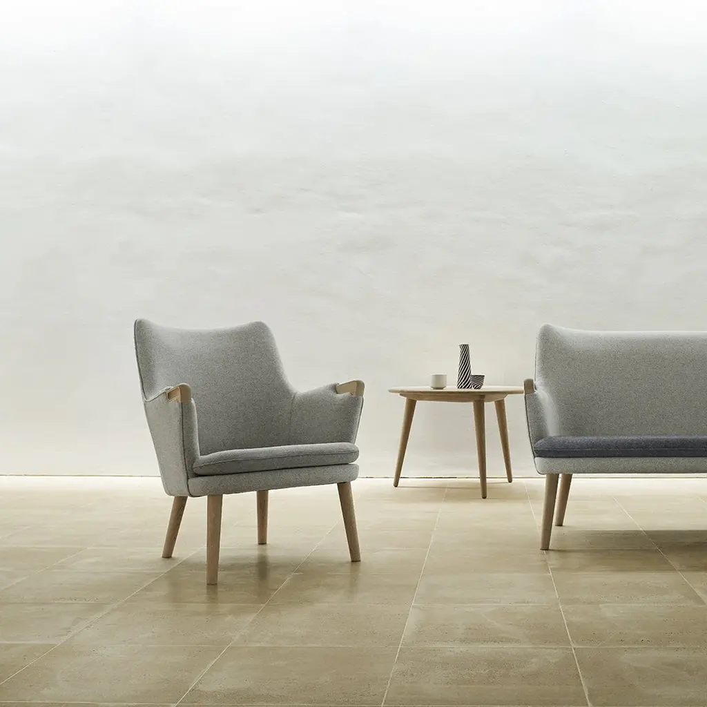 The CH71 lounge chair and CH72 sofa are characterized by a slim, fully upholstered frame, loose cushions, and round, tapered legs in solid wood.