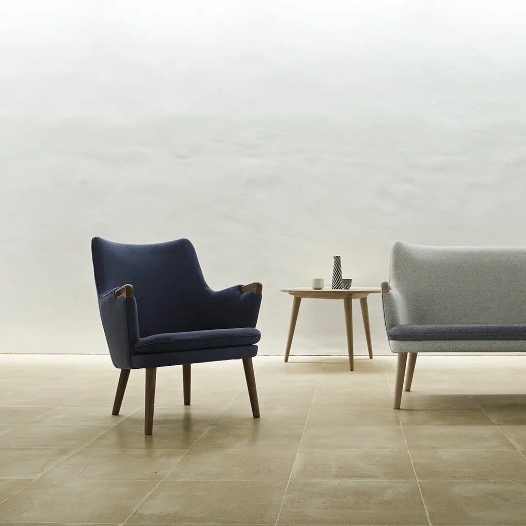 The CH71 lounge chair and CH72 sofa are characterized by a slim, fully upholstered frame, loose cushions, and round, tapered legs in solid wood.