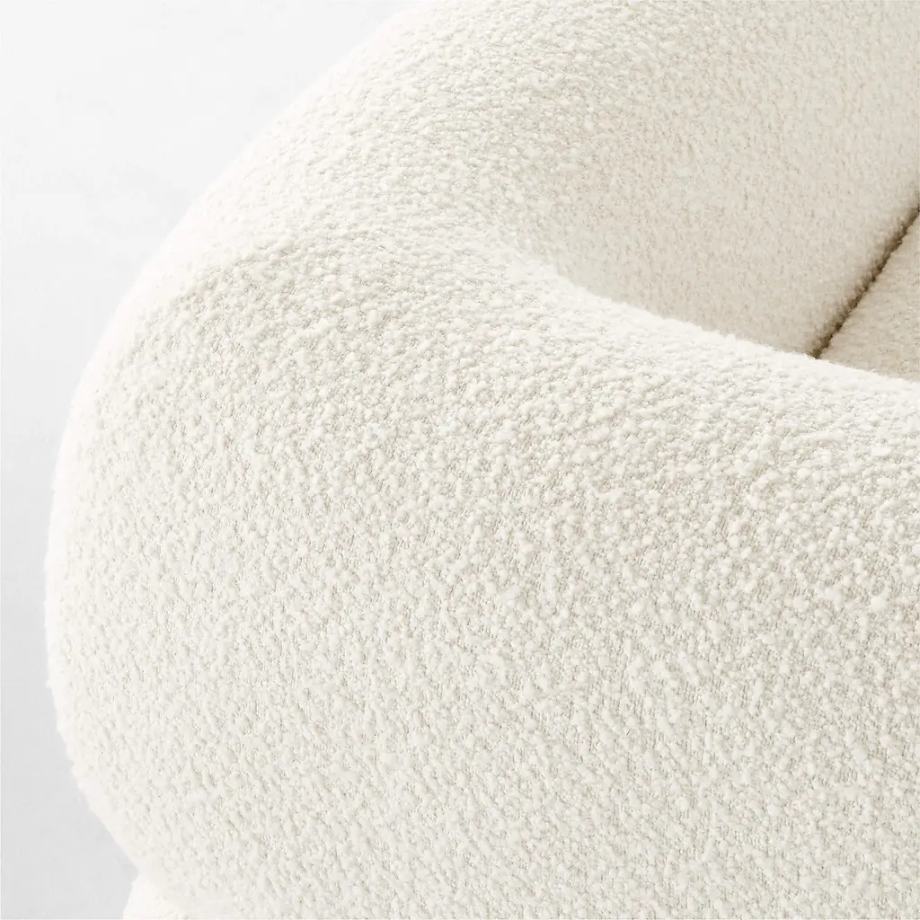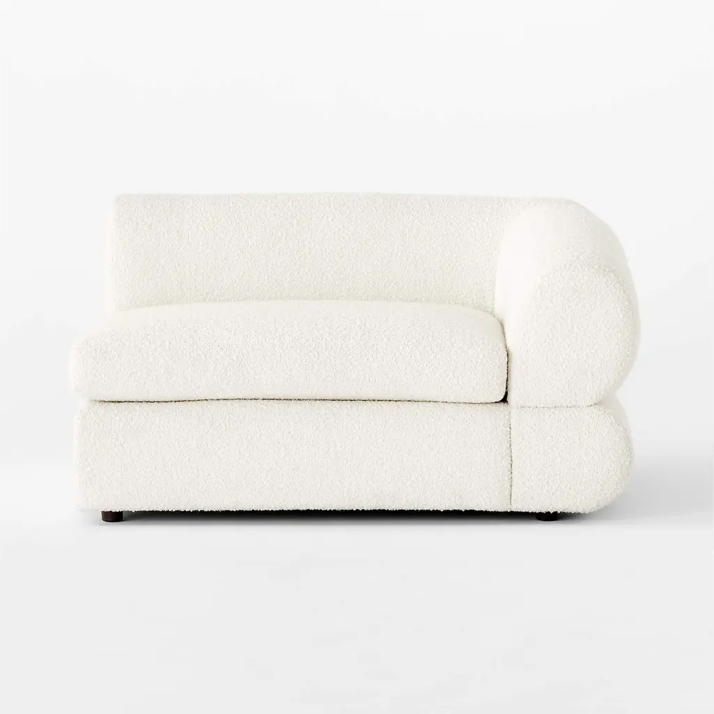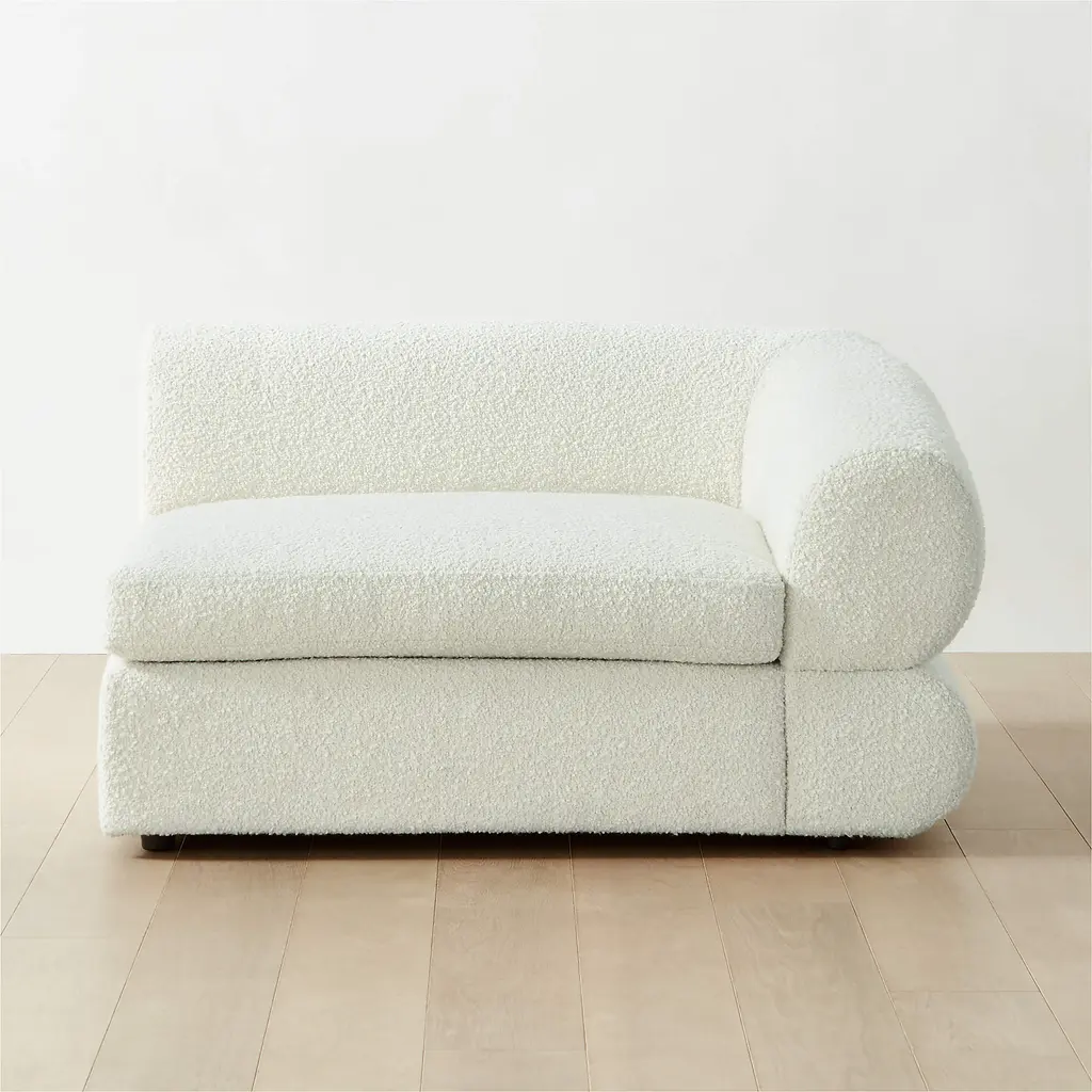 Designed in Barcelona by Mermelada Estudio, ivory boucle right-arm chair is spacious, low and loungey. The soft, sloping arm and rounded silhouette borrow from '70s Italian design, while deep-seated cushioning is the pinnacle of modern comfort and style. Combine it with other Chale pieces to create a customized sectional sofa. CB2 exclusive.