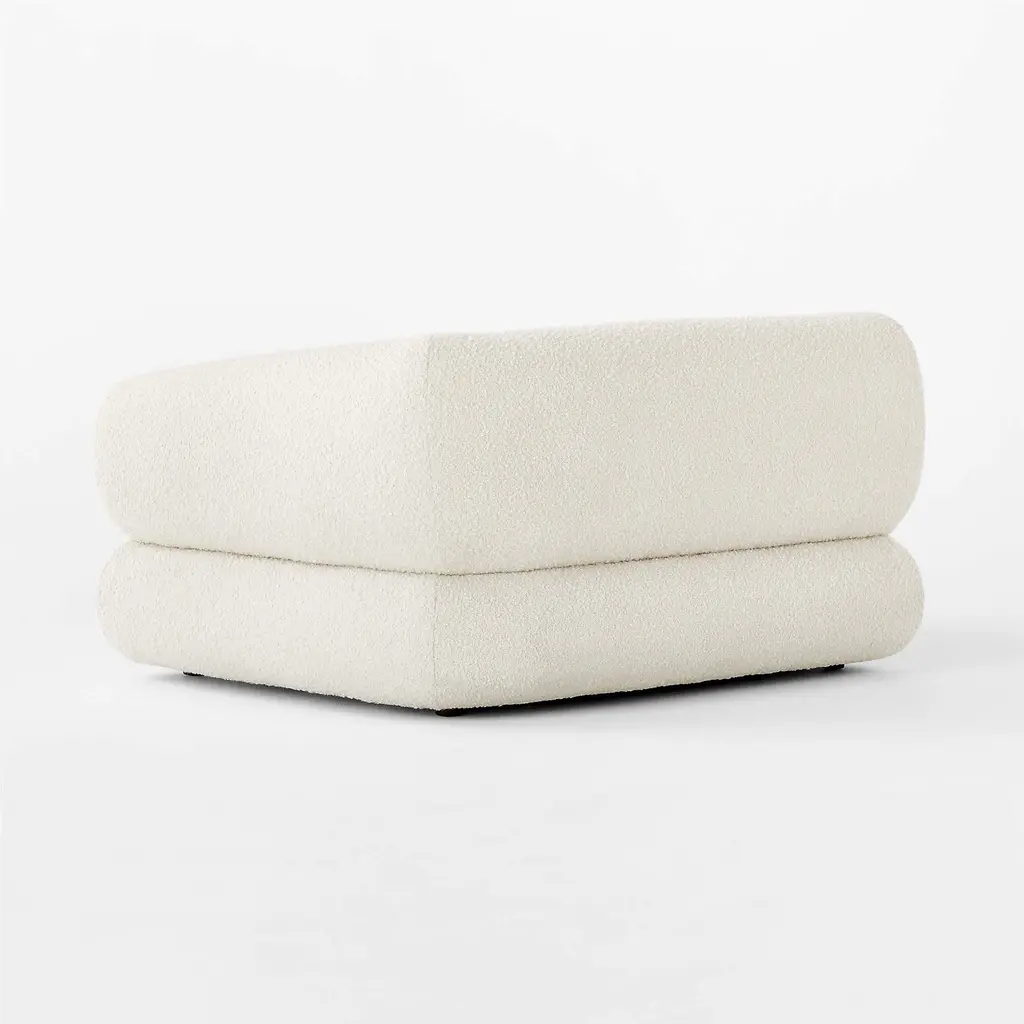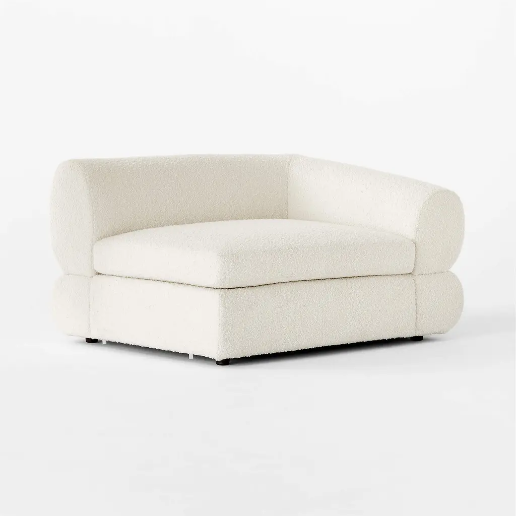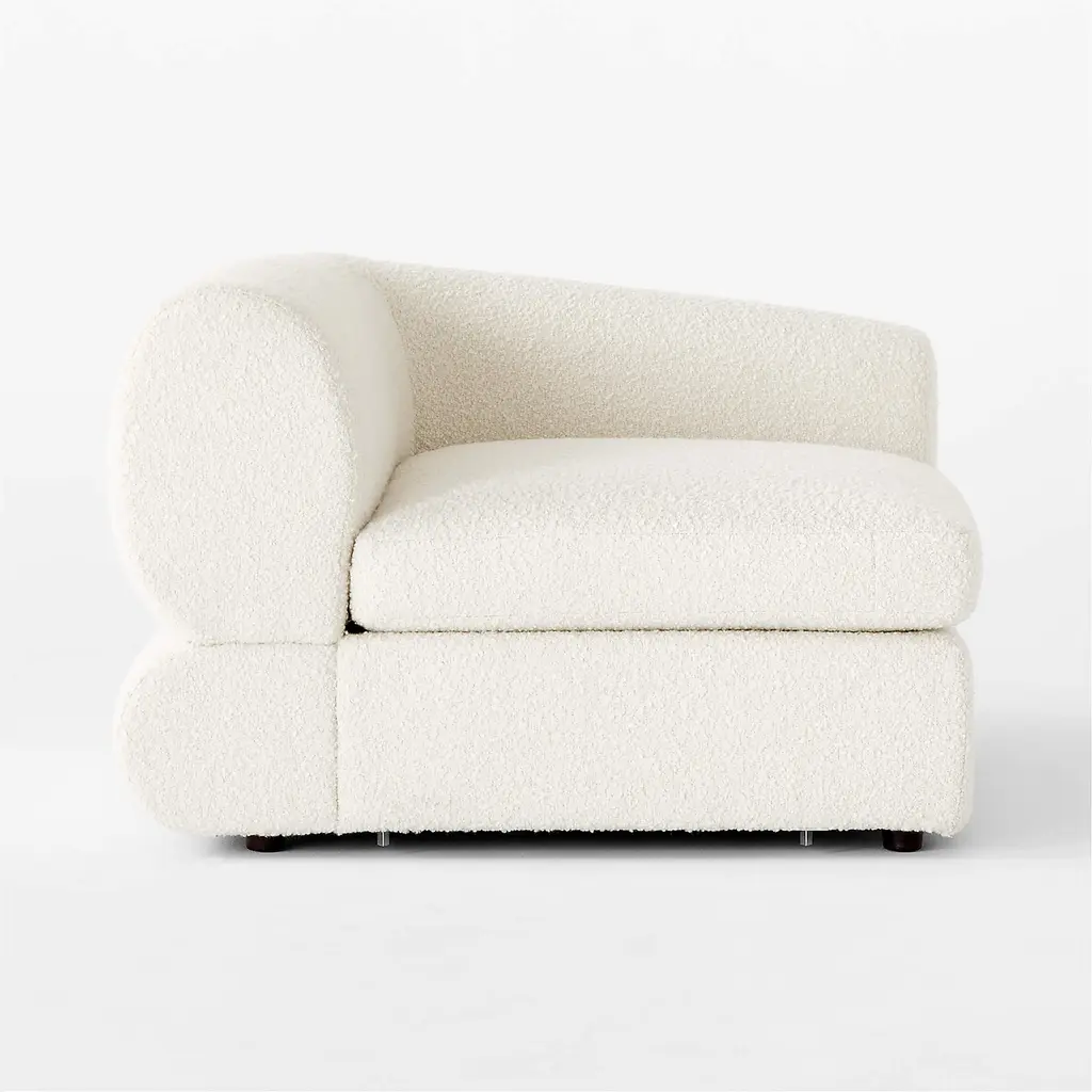 Designed in Barcelona by Mermelada Estudio, ivory boucle right-arm chair is spacious, low and loungey. The soft, sloping arm and rounded silhouette borrow from '70s Italian design, while deep-seated cushioning is the pinnacle of modern comfort and style. Combine it with other Chale pieces to create a customized sectional sofa. CB2 exclusive.